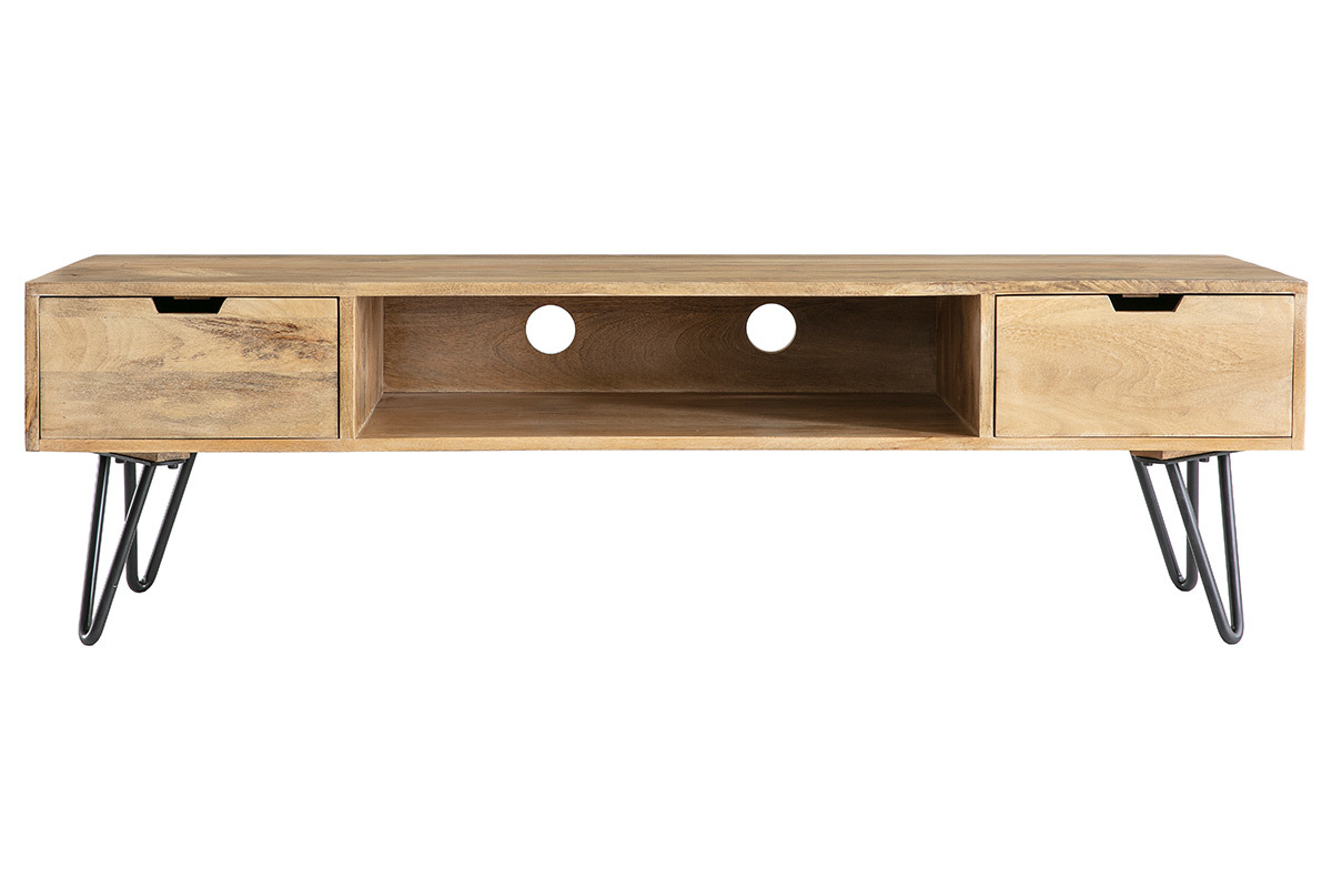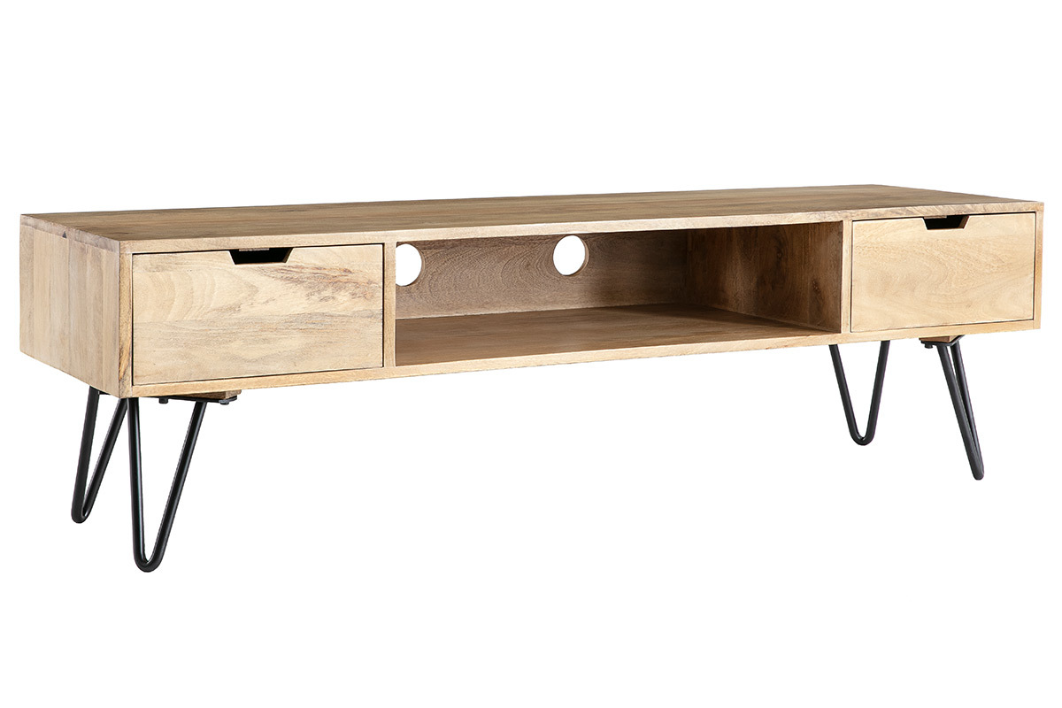 Muni de deux tiroirs latéraux, ce meuble TV en bois et métal noir avec rangements est aussi pratique que design grâce à sa niche ouverte et son passe-câbles : idéal pour y ranger les objets du quotidien, son décodeur et autres câbles.