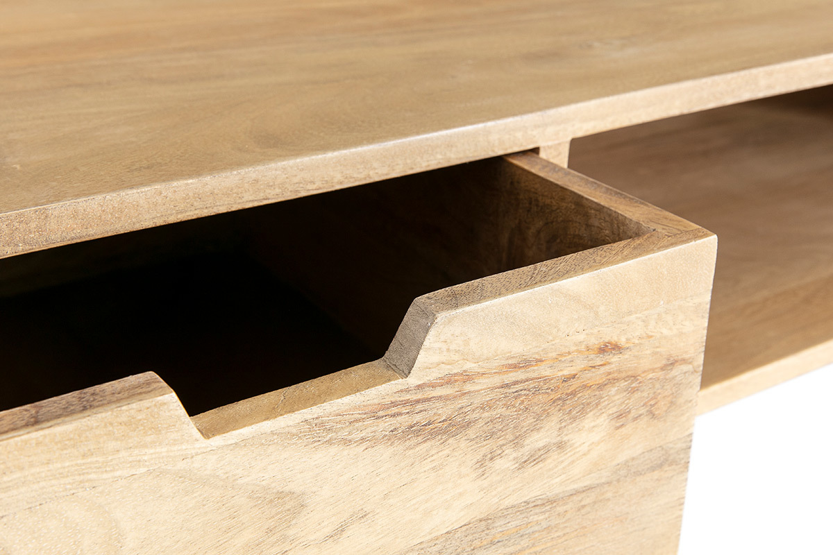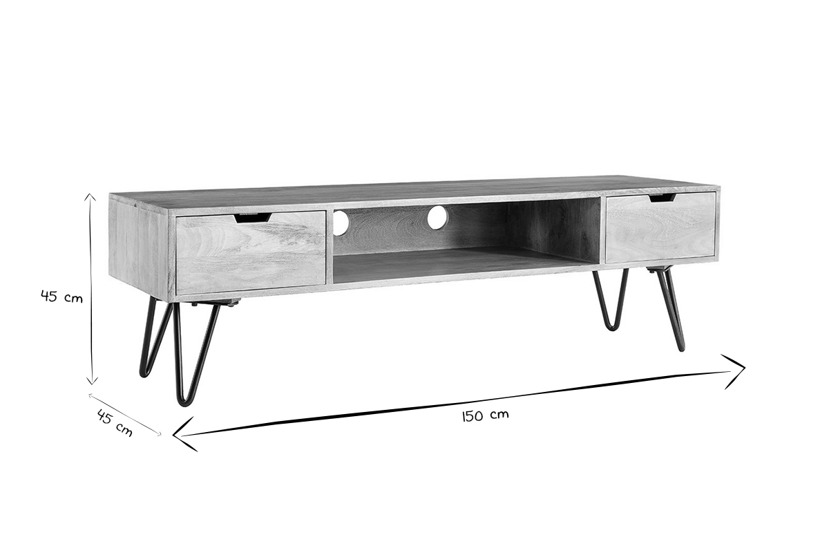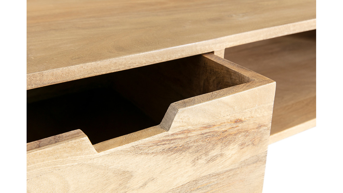 Conçu de manière artisanale, en manguier et métal noir, ce meuble TV bas (dimensions totales L150 x P45 x H45 cm) arbore le cachet brut du "fait main" et apportera une vraie personnalité à votre pièce de vie. Le grain particulier du manguier offre des détails et de belles nuances qui en font un meuble unique.