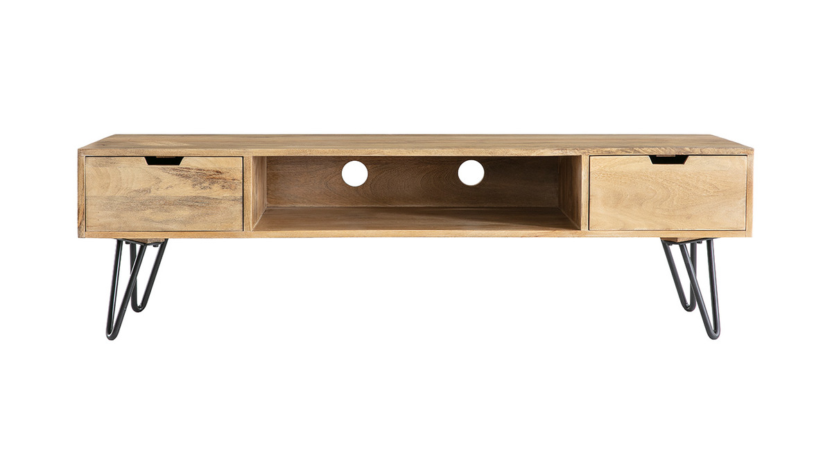 Dans un salon aux airs bohèmes ou plus industriels, ce meuble TV en bois massif deviendra un élement incontournable de votre décoration. Il peut également s'intégrer à une déco plus scandinave, en face d'un joli canapé.