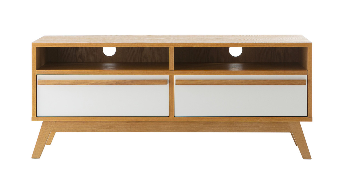 Composé en panneaux de fibres de bois finition chêne, ses tons chaleureux associés aux touches de blanc des tiroirs lui permettent de s'intégrer parfaitement à un style d'intérieur aux couleurs claires, d'inspiration nordique ou plus bohème. Dans un salon à la décoration moderne, il réchauffera l'atmosphère en un clin d'oeil.