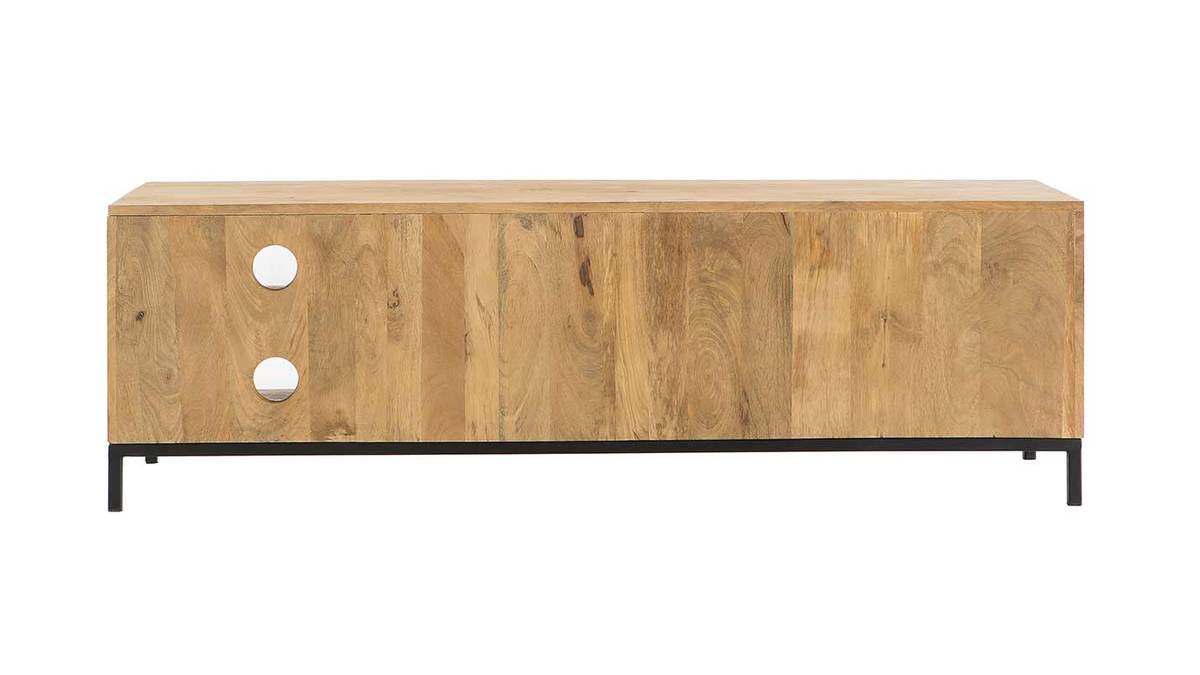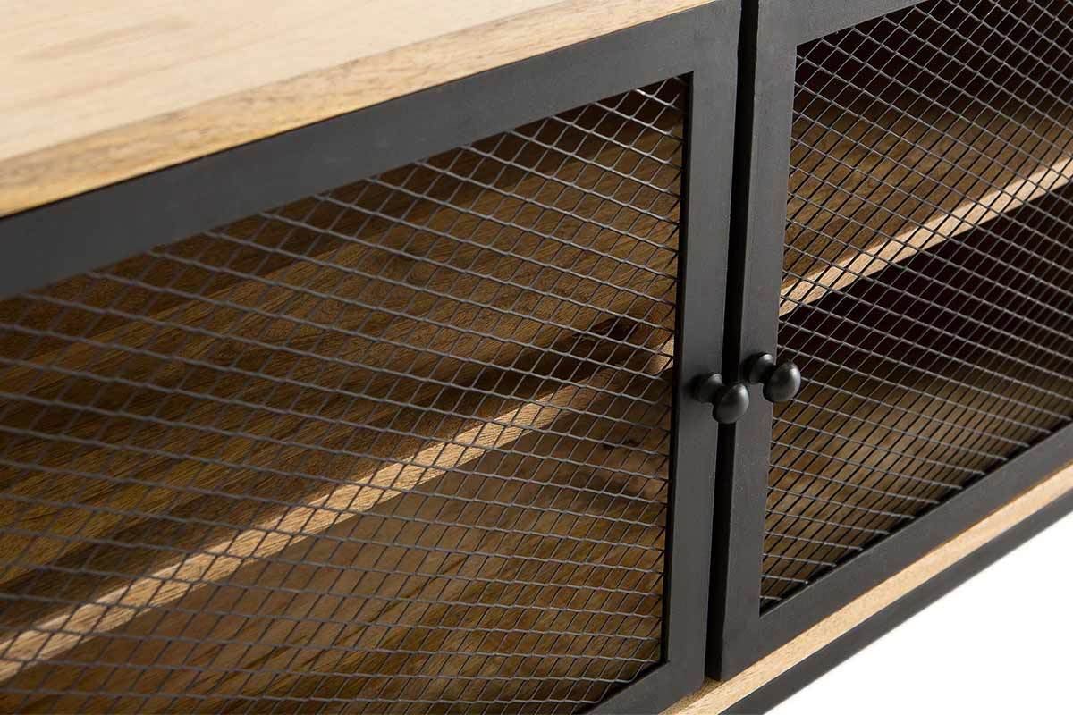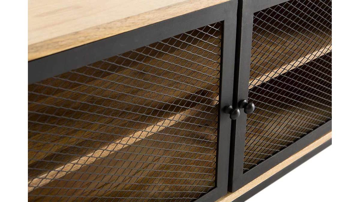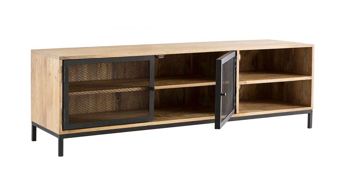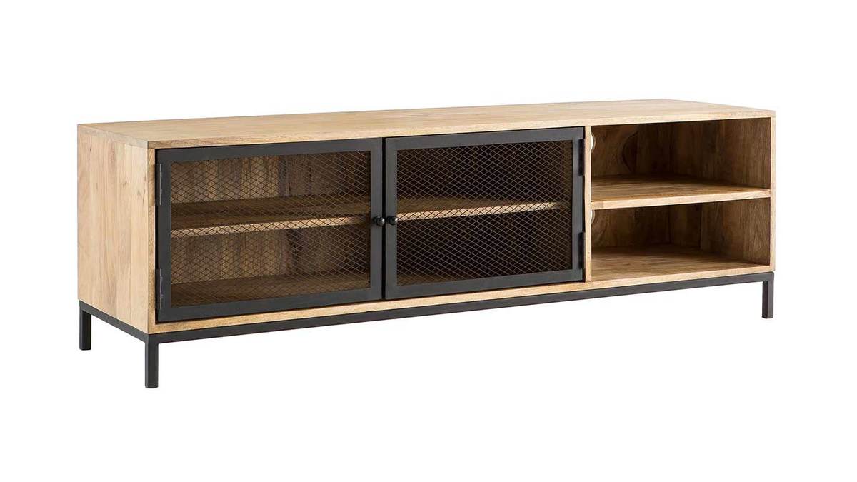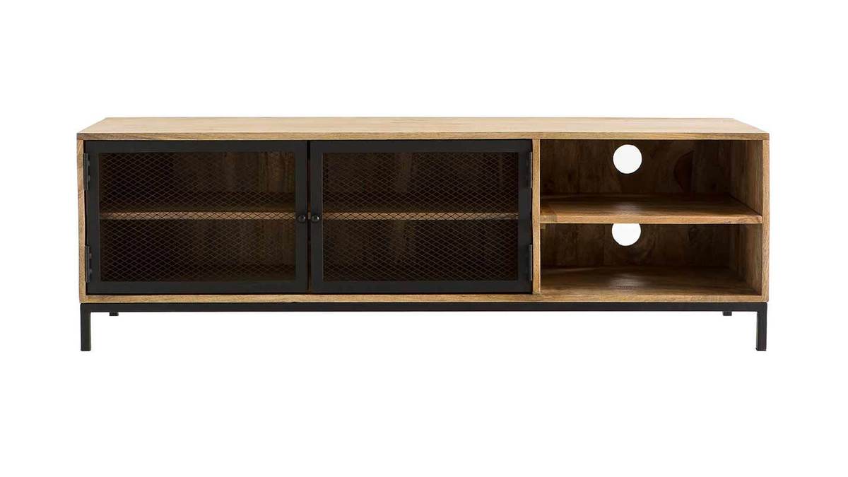Avec son mélange de matériaux, ce meuble TV ne passe pas inaperçu. Son piètement en métal noir et ses portes en métal perforé lui donne un côté industriel, idéal pour un séjour dans un esprit factory. Avec sa structure et ses étagères en manguier, ce meuble TV s'inscrit dans la tendance et réchauffera votre salon. Les tons chauds du manguier sont en effet parfaits pour un salon chaleureux et cosy.