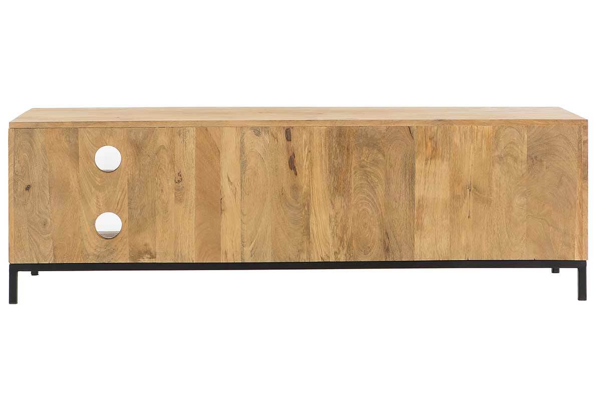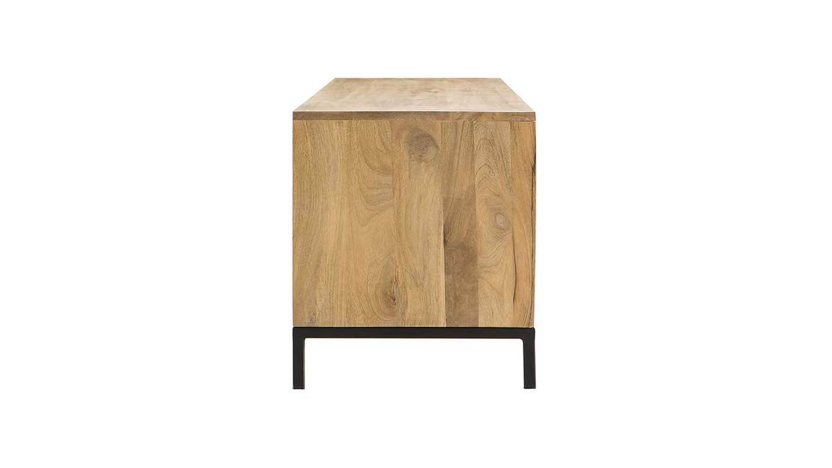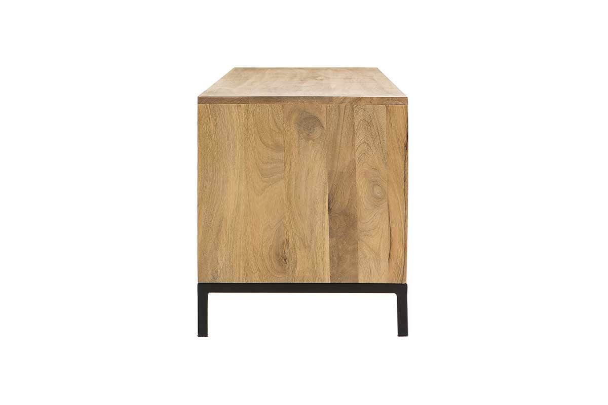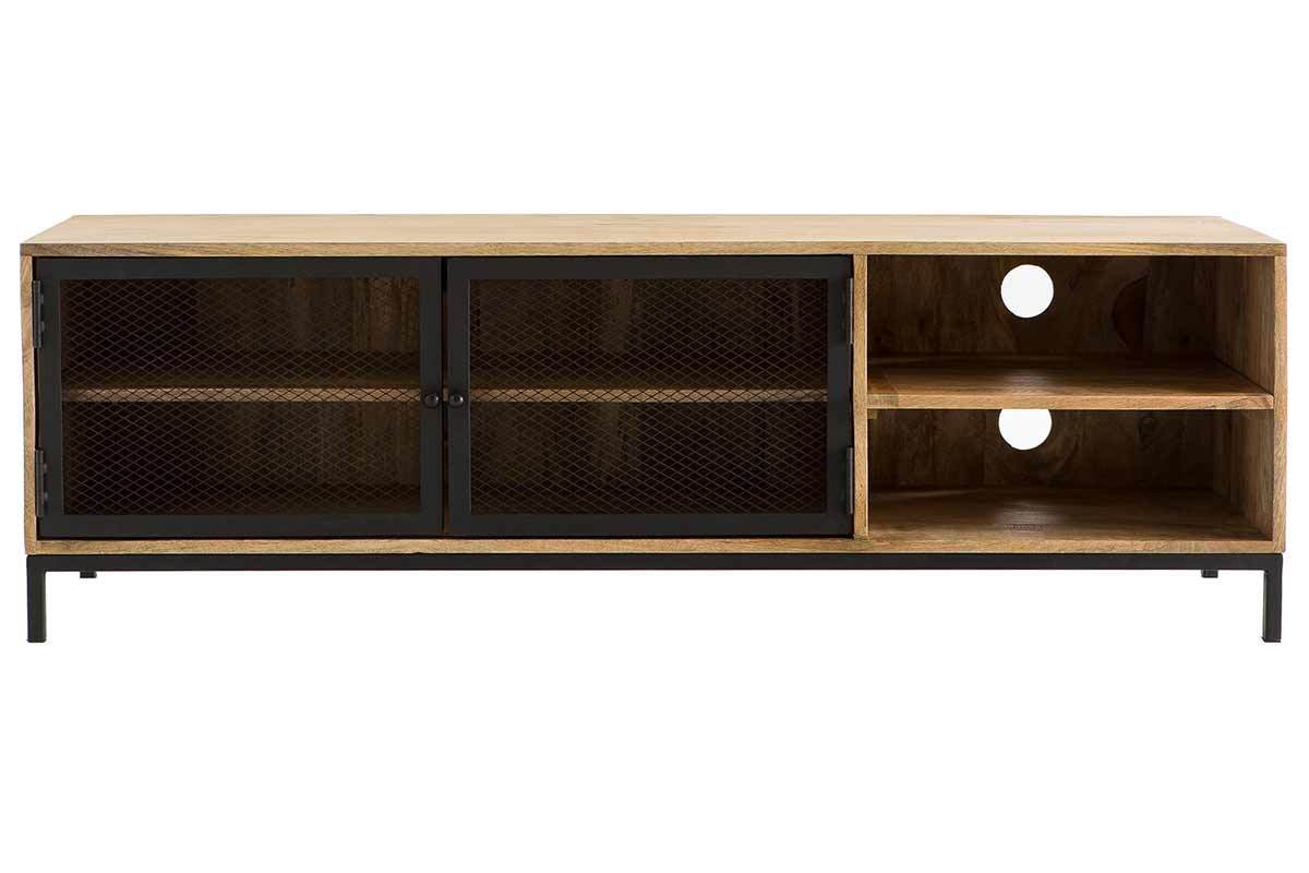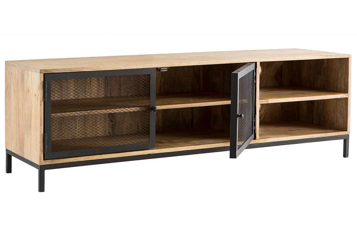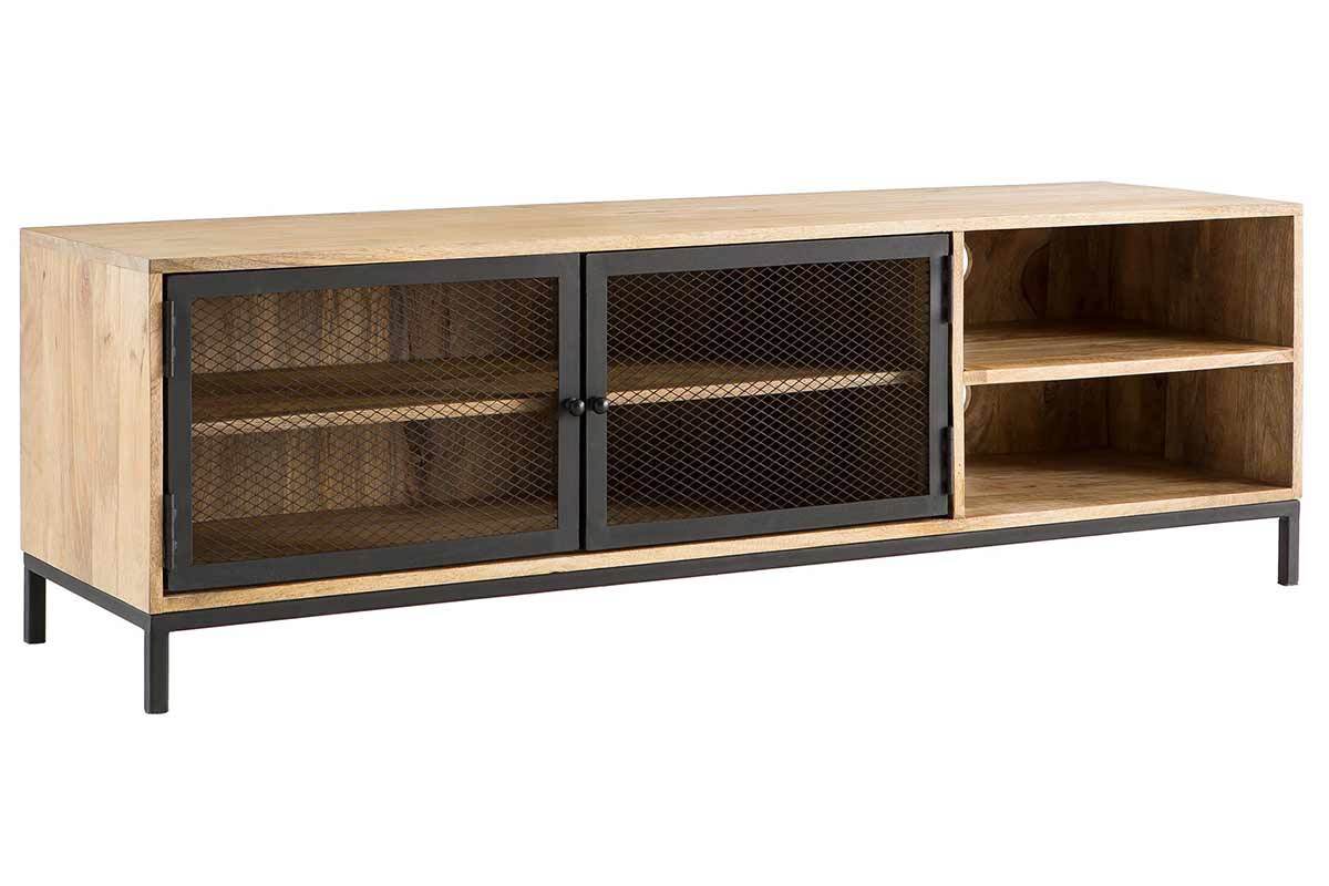 Avec son mélange de matériaux, ce meuble TV ne passe pas inaperçu. Son piètement en métal noir et ses portes en métal perforé lui donne un côté industriel, idéal pour un séjour dans un esprit factory. Avec sa structure et ses étagères en manguier, ce meuble TV s'inscrit dans la tendance et réchauffera votre salon. Les tons chauds du manguier sont en effet parfaits pour un salon chaleureux et cosy.