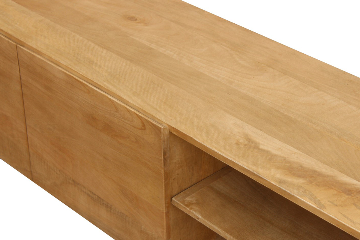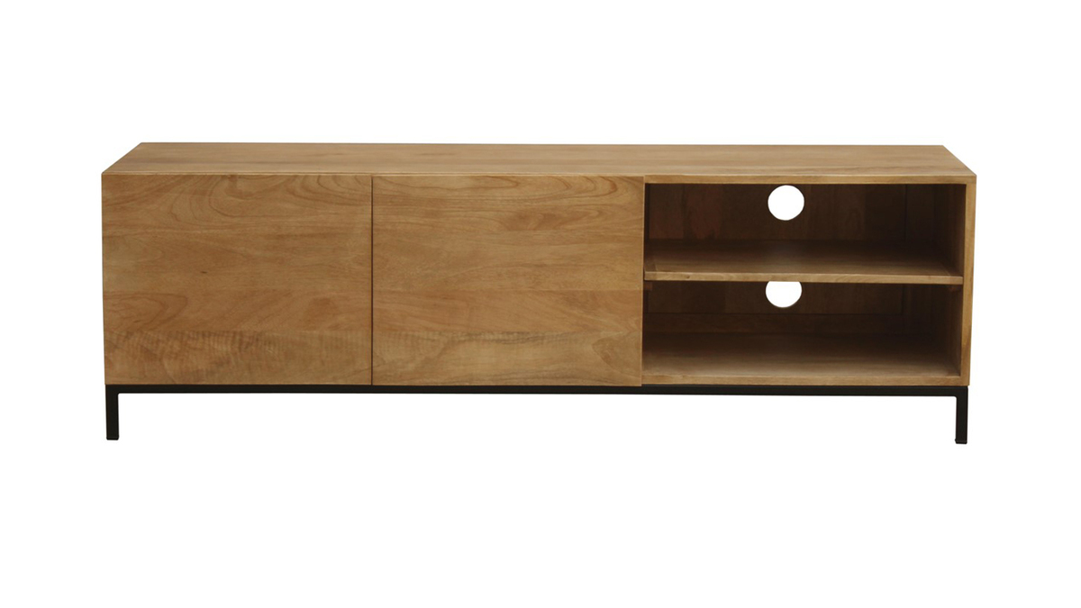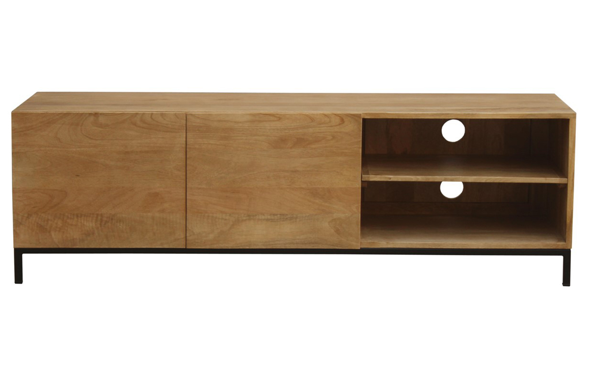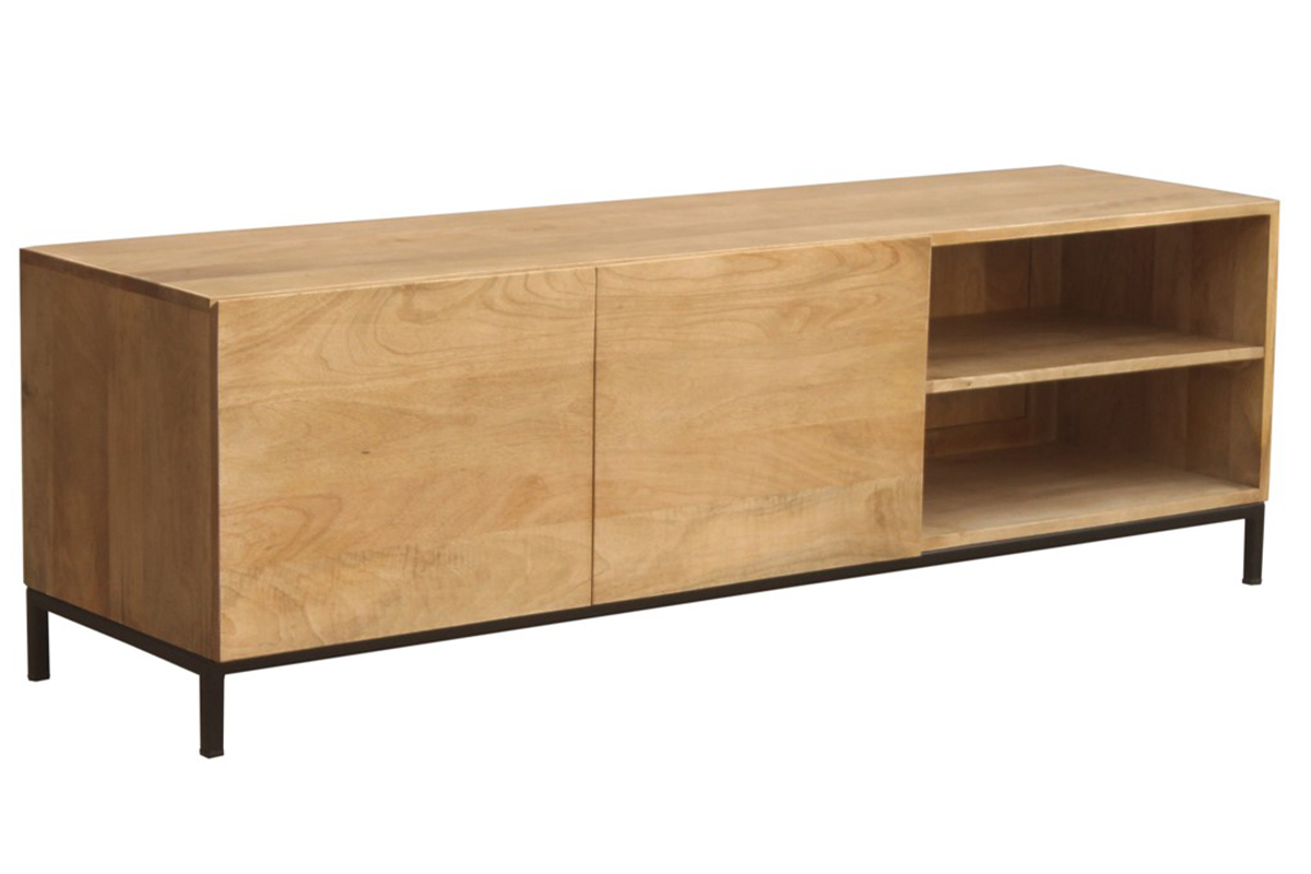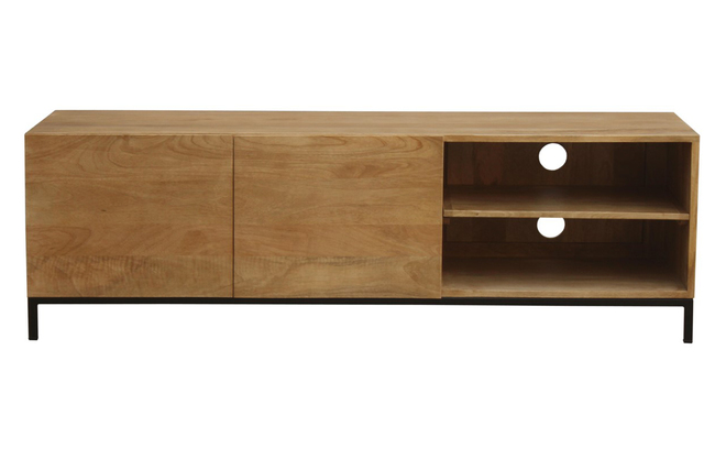 Unique, ce meuble TV apporte de la puissance à votre intérieur. Conçu entièrement en manguier, il possède une finition exemplaire avec sa couche de vernis. Robuste, il possède un piétement en métal qui supportera votre télévision ainsi que tous les appareils HiFi. Avec ses niches fermées et ses niches ouvertes, ce meuble TV dispose de nombreux rangements qui vous satisferont. Ses dimensions généreuses vous offrent la possibilité d'exposer vos objets déco en plus de votre téléviseur.