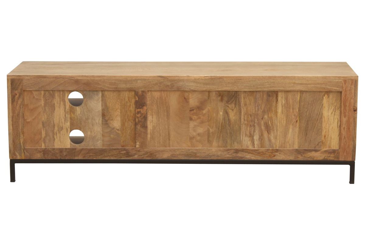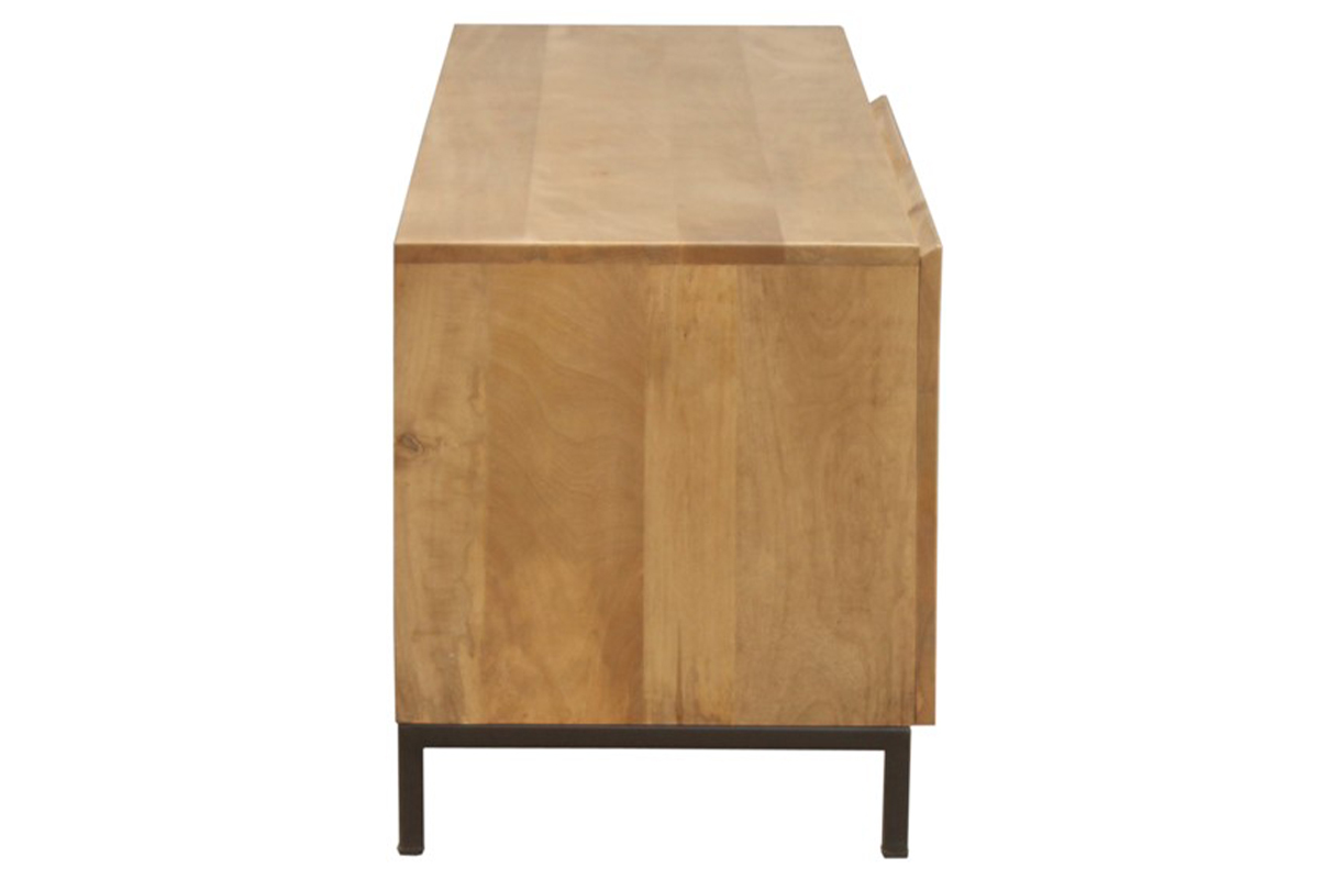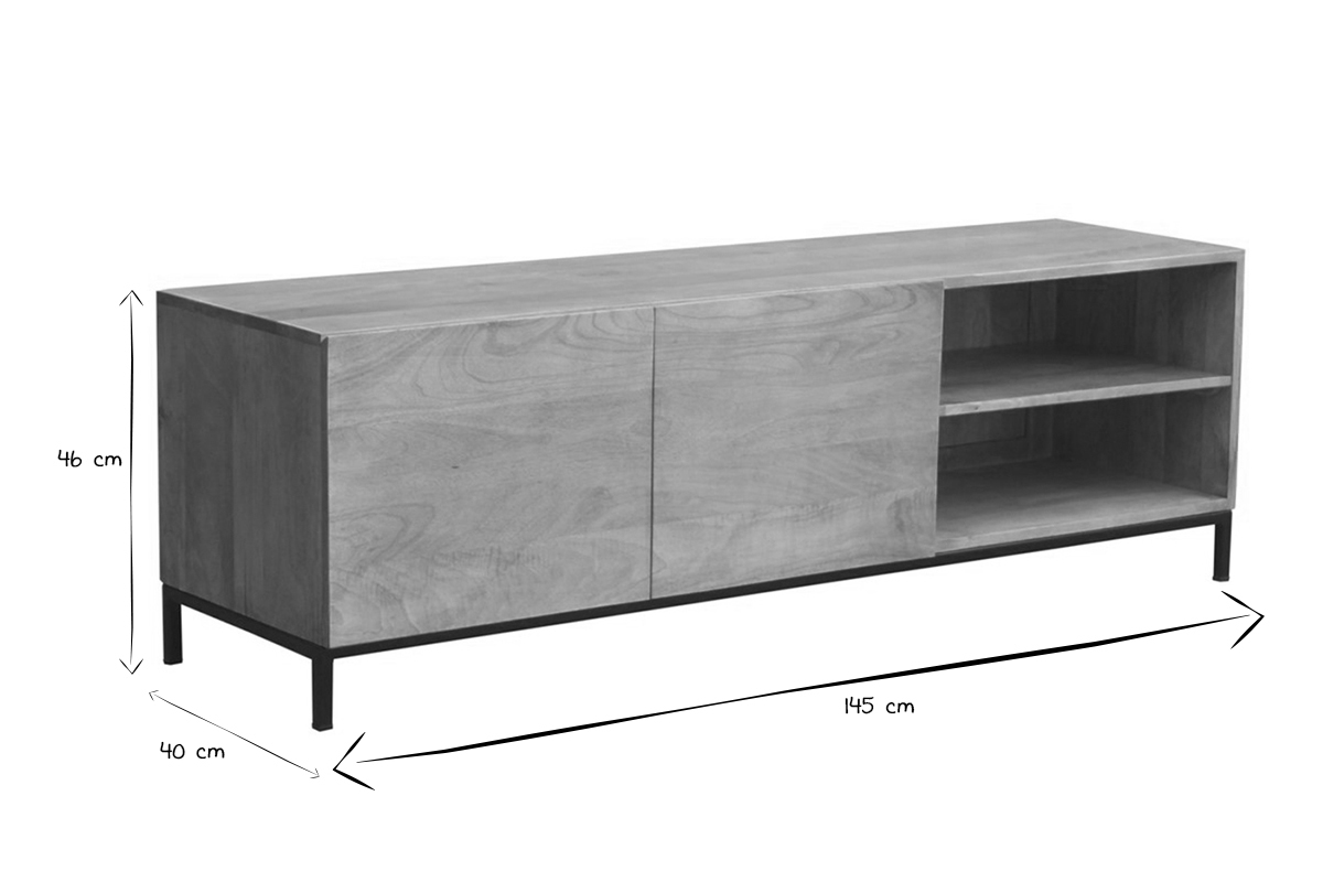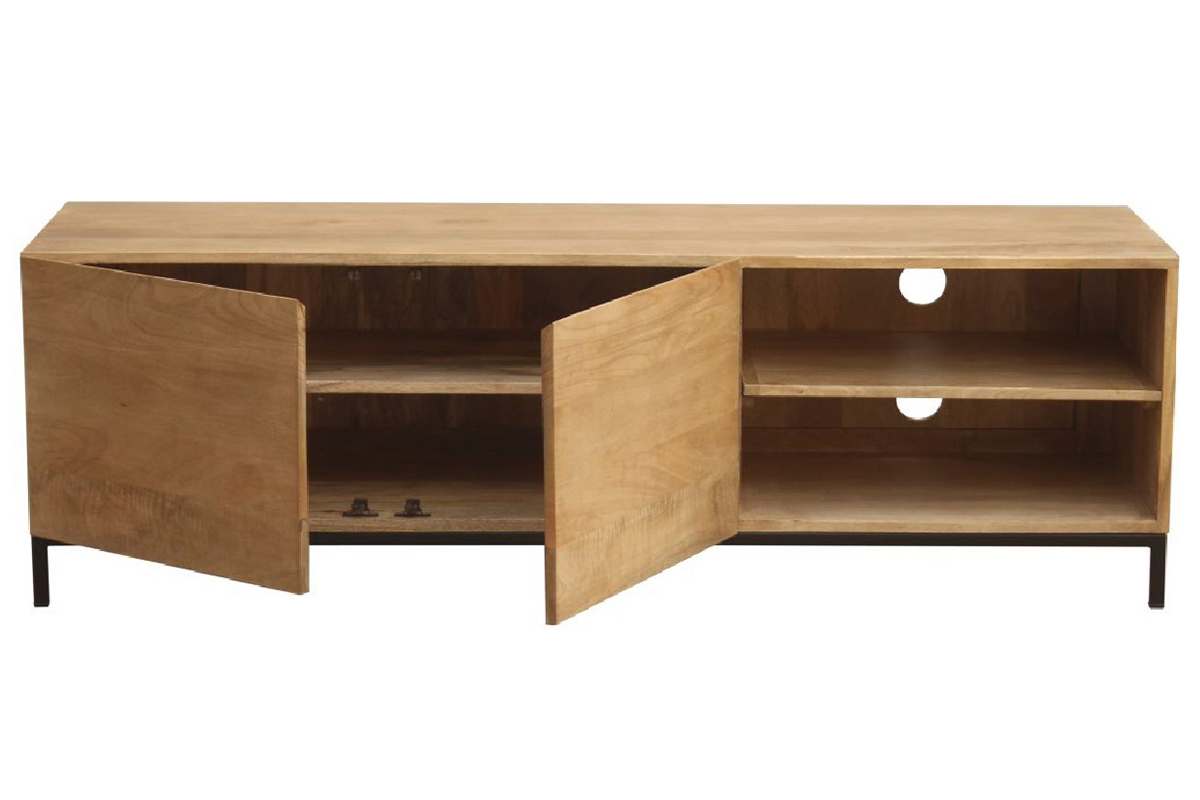 Unique, ce meuble TV apporte de la puissance à votre intérieur. Conçu entièrement en manguier, il possède une finition exemplaire avec sa couche de vernis. Robuste, il possède un piétement en métal qui supportera votre télévision ainsi que tous les appareils HiFi. Avec ses niches fermées et ses niches ouvertes, ce meuble TV dispose de nombreux rangements qui vous satisferont. Ses dimensions généreuses vous offrent la possibilité d'exposer vos objets déco en plus de votre téléviseur.