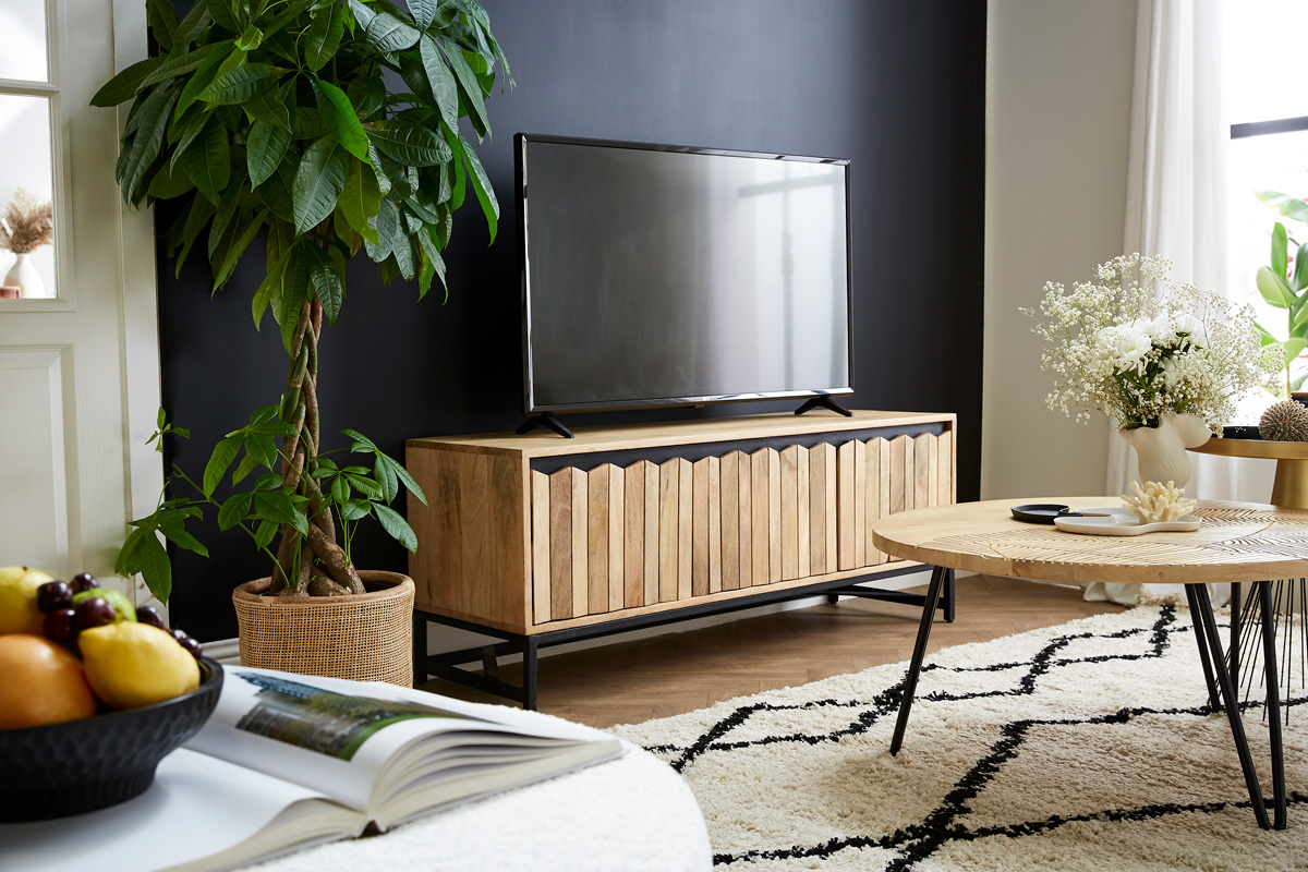 Avec les belles nuances et nervures naturelles qu'offent le manguier massif, ce meuble TV insuffle immédiatement une atmosphère chaleureuse dans notre intérieur. Allié à un piètement métallique noir, ESTY affirme toute son authenticité. En plus de réchauffer l'ambiance, le manguier est une essence de bois exotique appréciée pour sa solidité.