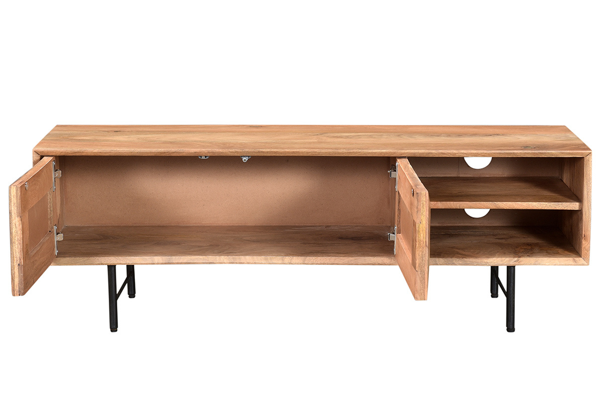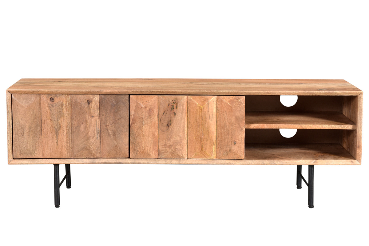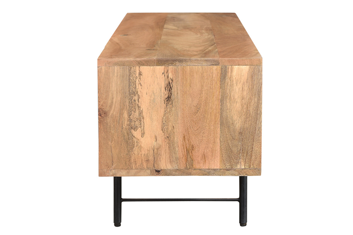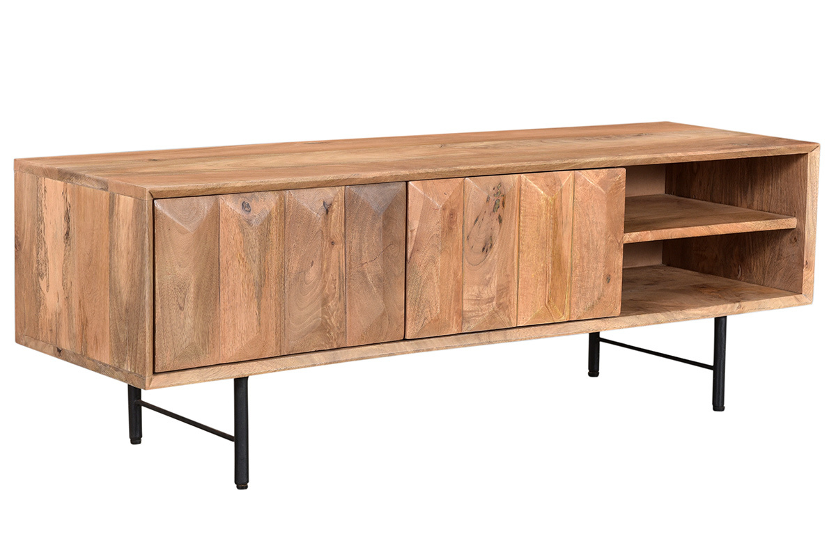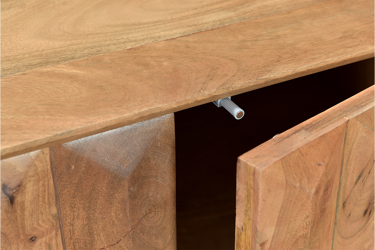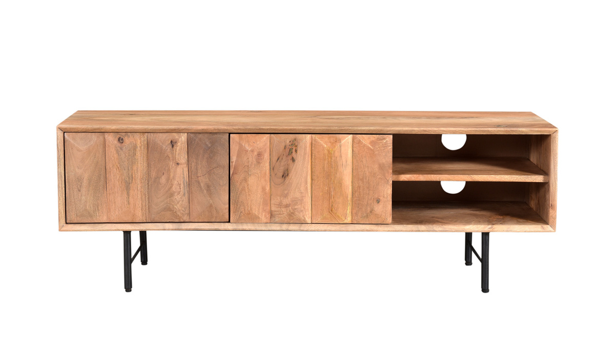 Des portes taillées comme des diamants : voilà qui fait toute la différence. Le manguier a été travaillé artisanalement pour offrir ce relief singulier qui fait le charme de ce meuble TV. Les volumes qui se dessinent donnent à l'ensemble un style très graphique, idéal dans nos salons modernes. On retrouve également l'aspect brut et authentique du bois massif et du "fait main" qui constrate à merveille avec la finesse du piètement en métal. Entre authenticité et modernité, le meuble TV AGRA est une pièce aux multiples facettes !