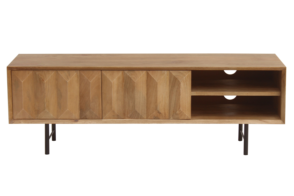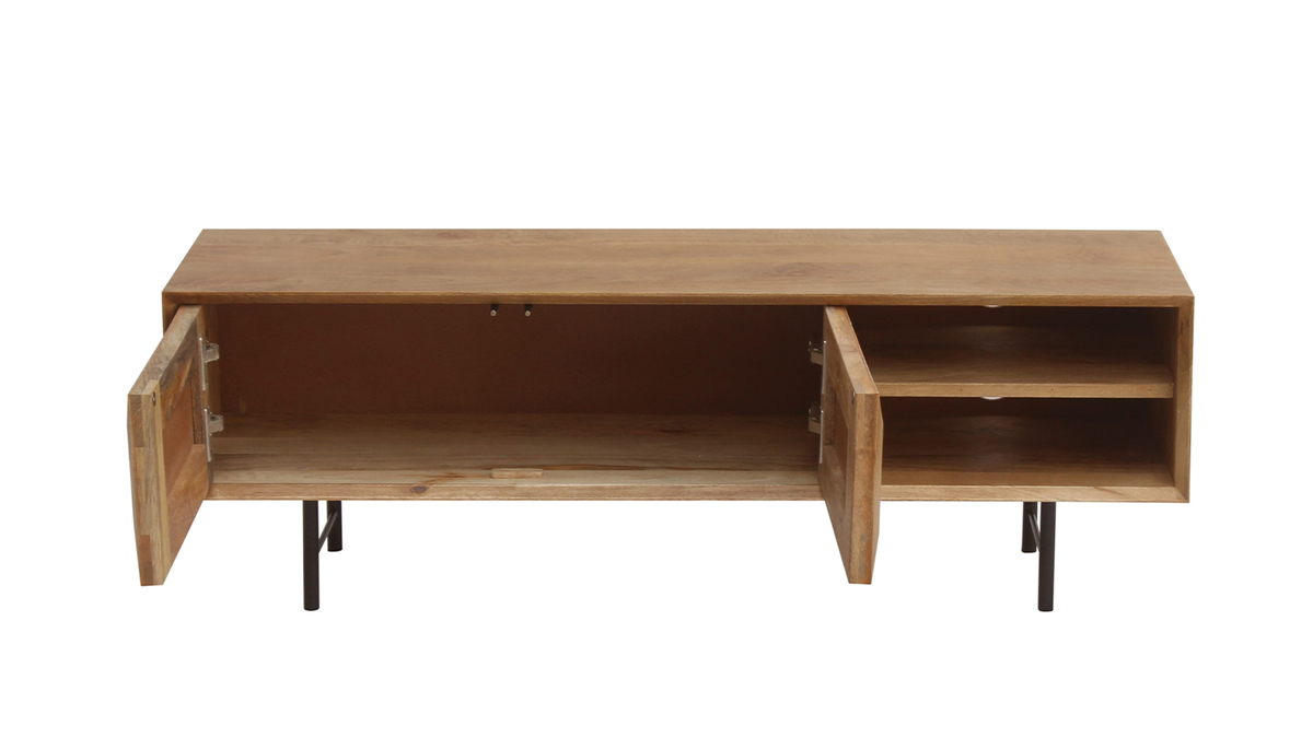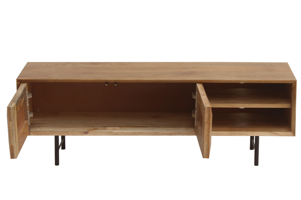 Ce petit meuble TV est composé d'une structure et portes en manguier massif, d'un fond en panneaux de fibres de bois et d'un piètement en métal noir.
