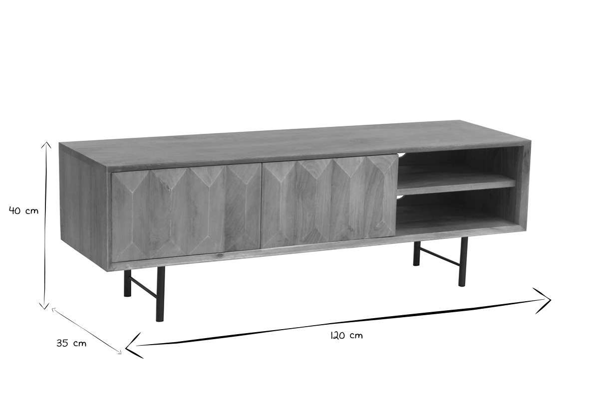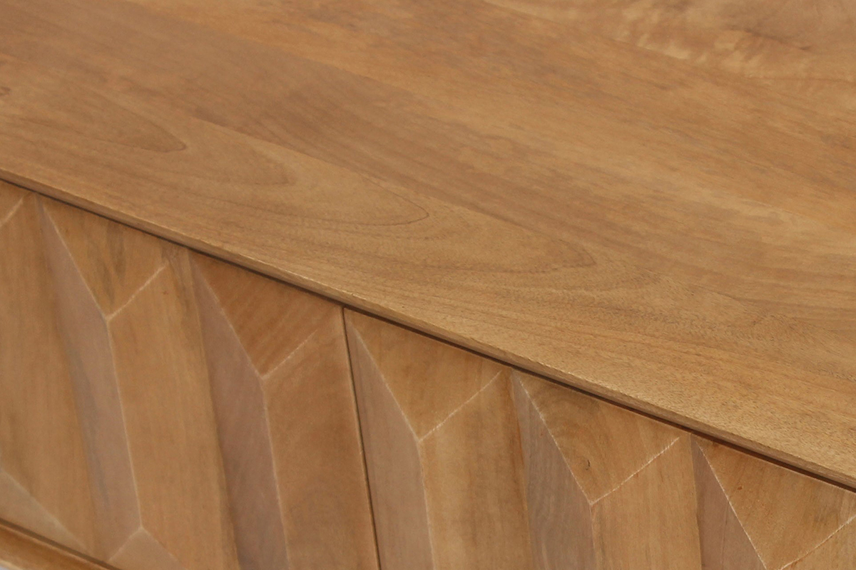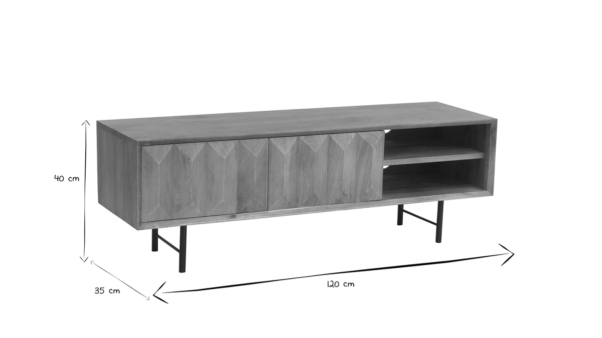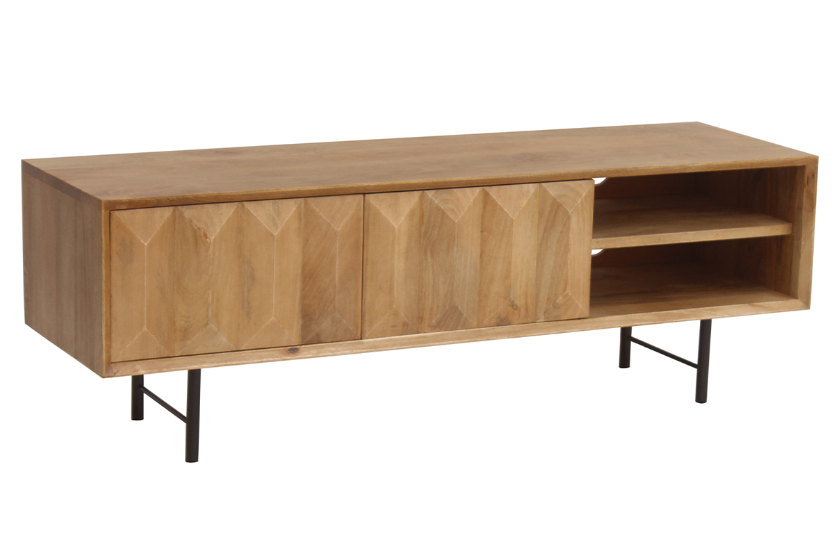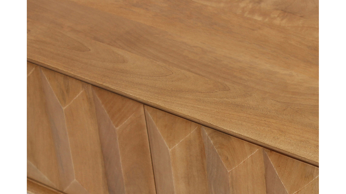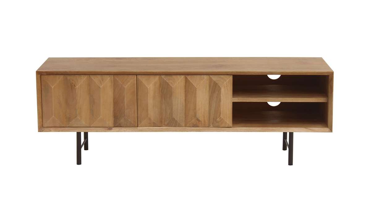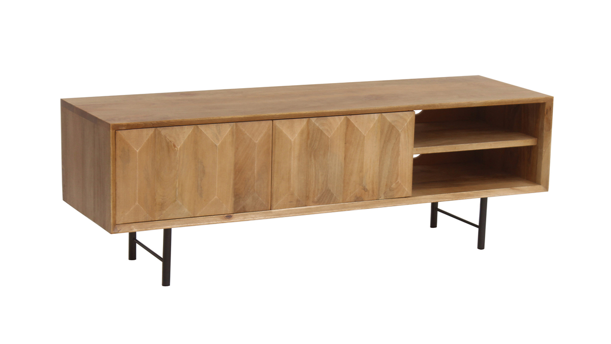 Des portes taillées comme des diamants : voilà qui fait toute la différence. Le manguier a été travaillé artisanalement pour offrir ce relief singulier qui fait tout le charme de ce meuble TV original. Les volumes qui se dessinent donnent à l'ensemble un style très graphique, idéal dans nos salons modernes. On retrouve également l'aspect brut et authentique du bois massif et du "fait main" qui constrate à merveille avec la finesse du piètement en métal. Entre authenticité et modernité, ce meuble TV artisanal est une pièce aux multiples facettes !