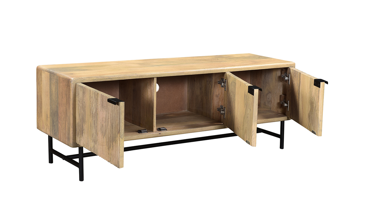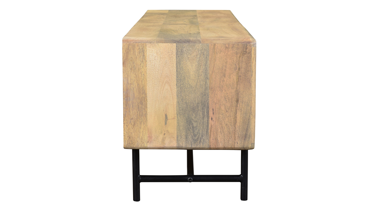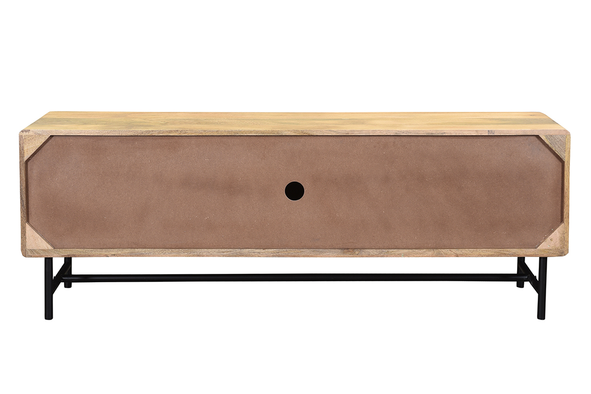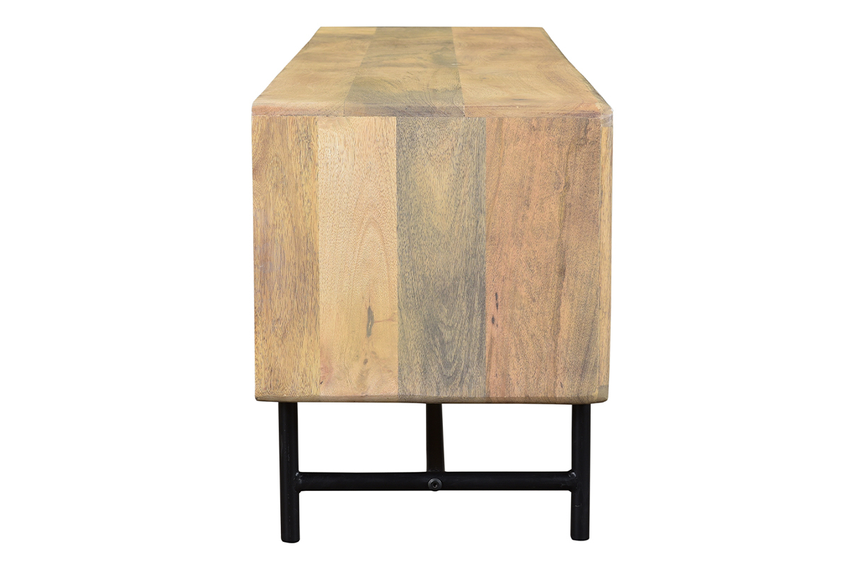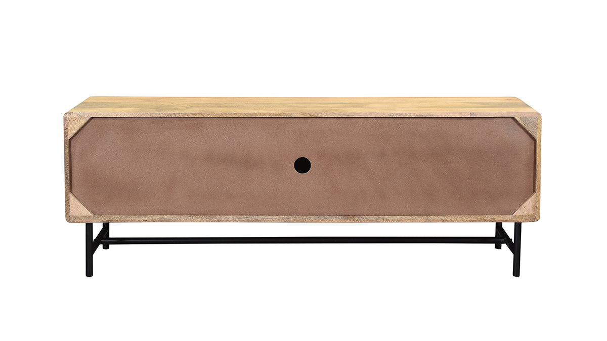 Bois et métal se rencontrent pour offrir un meuble TV à l'allure véritablement authentique. Composé d'une structure en manguier massif, ce meuble TV confectionné de manière artisanale apporte un esprit chaleureux dans la pièce. JUNO associe cette essence de bois exotique à un piètement et des poignées métalliques noirs, le tout pour former un objet déco au charme intemporel (le fond du meuble est en panneaux de fibres de bois).