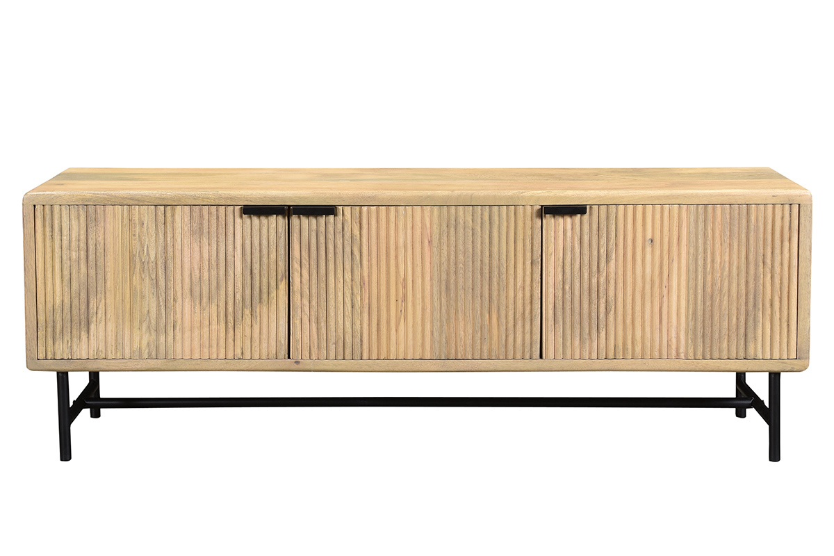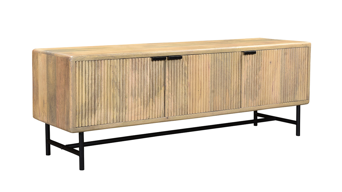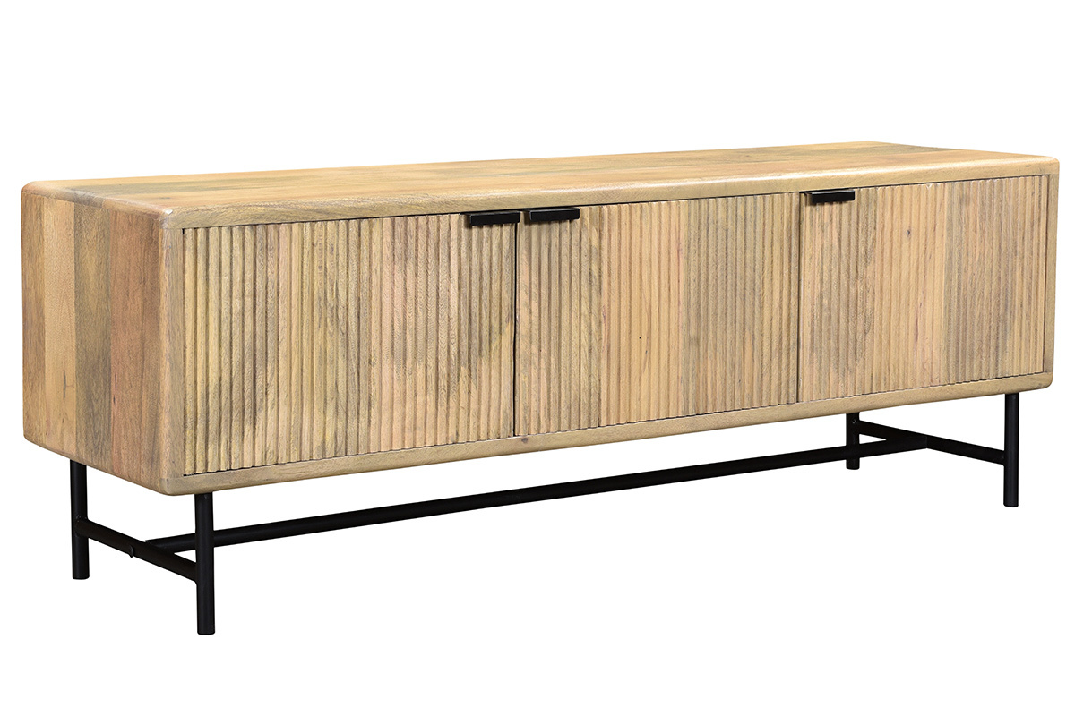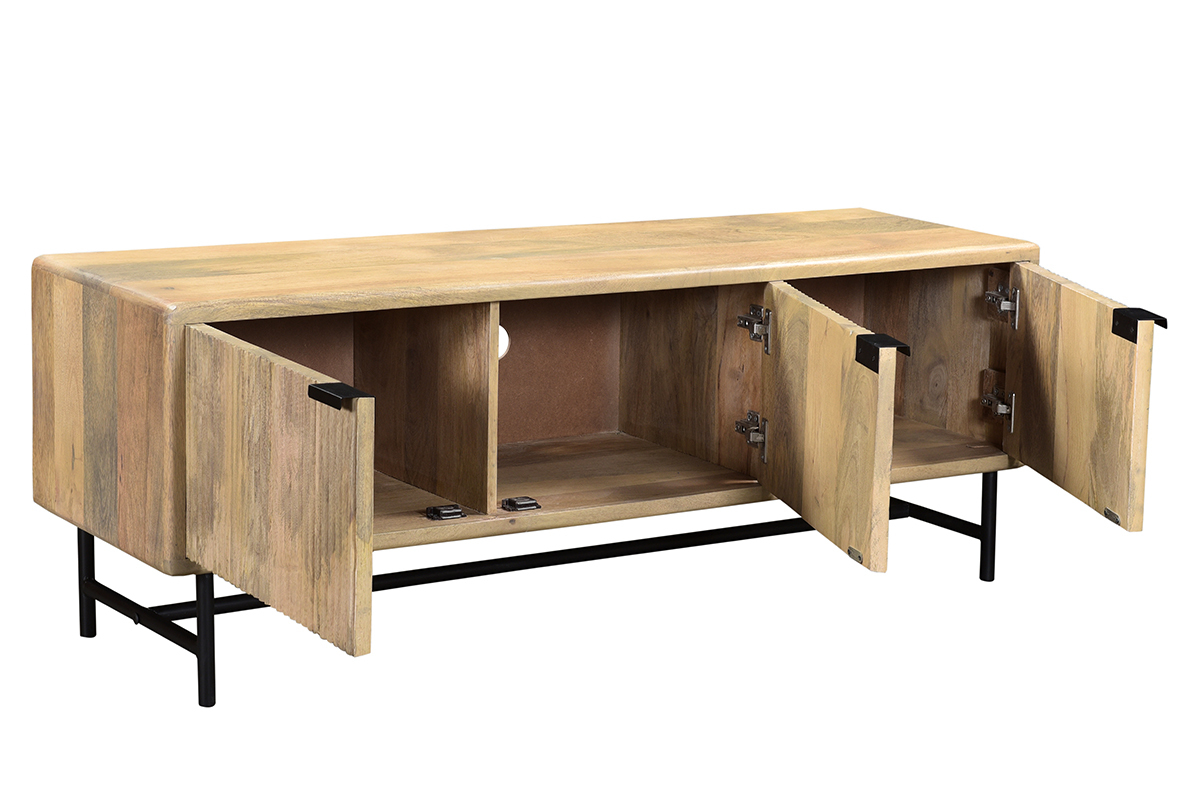 Bois et métal se rencontrent pour offrir un meuble TV à l'allure véritablement authentique. Composé d'une structure en manguier massif, ce meuble TV confectionné de manière artisanale apporte un esprit chaleureux dans la pièce. JUNO associe cette essence de bois exotique à un piètement et des poignées métalliques noirs, le tout pour former un objet déco au charme intemporel (le fond du meuble est en panneaux de fibres de bois).