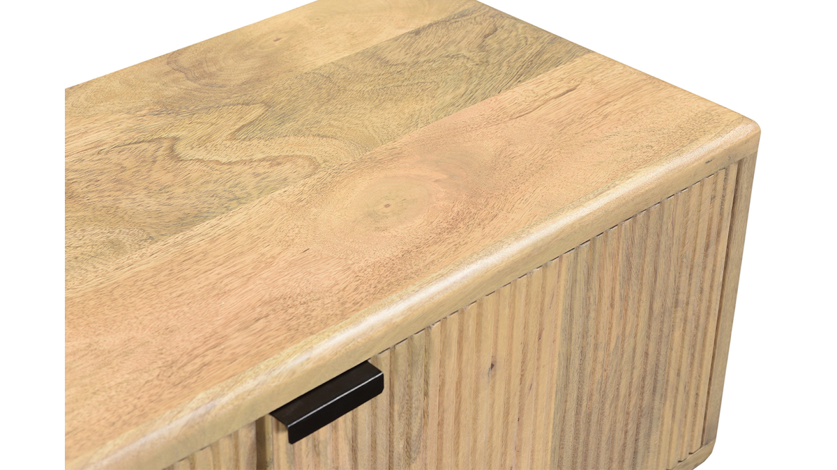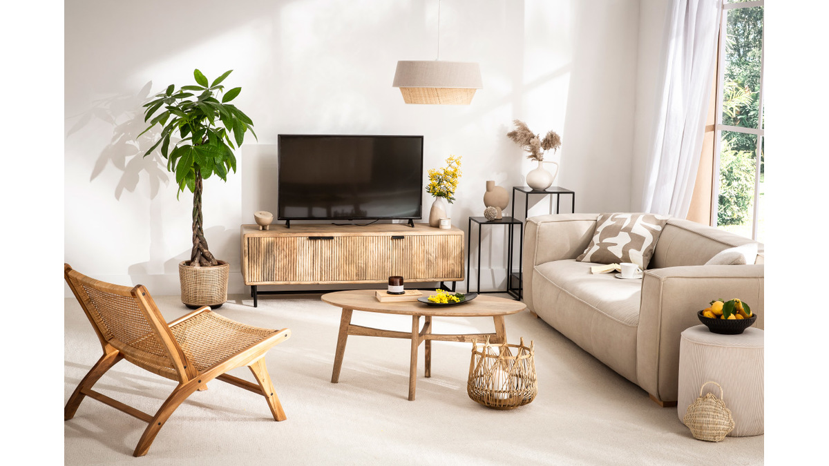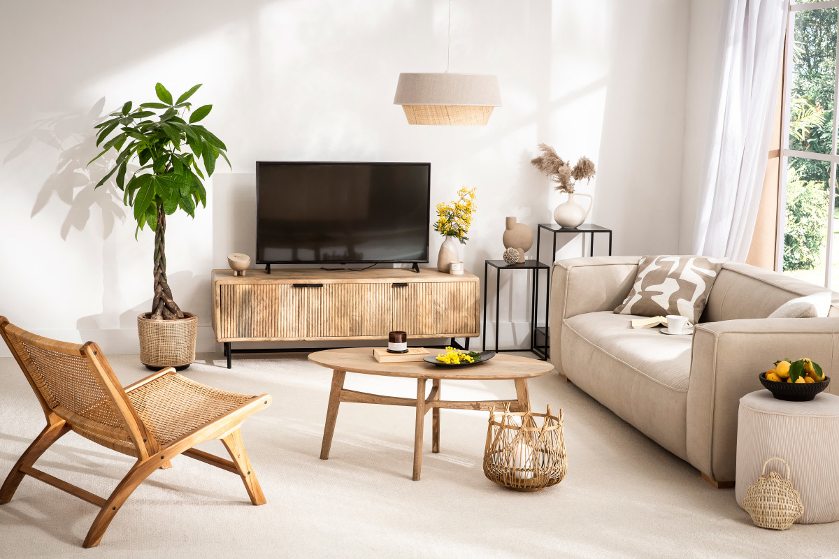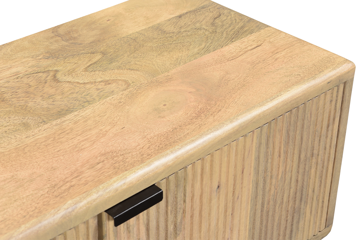 Pour un design unique, le bois a été travaillé de sorte à créer des motifs graphiques tout en relief sur les portes des rangements. Original et rempli de charme, c'est un meuble TV qui fait toute la différence dans un salon cosy. Une table basse en bois accompagnera à merveille ce meuble TV au cachet indéniable.