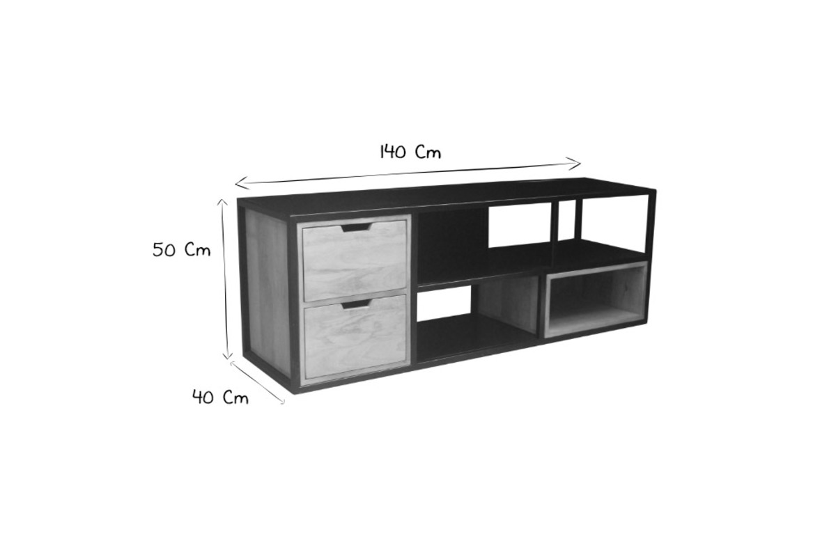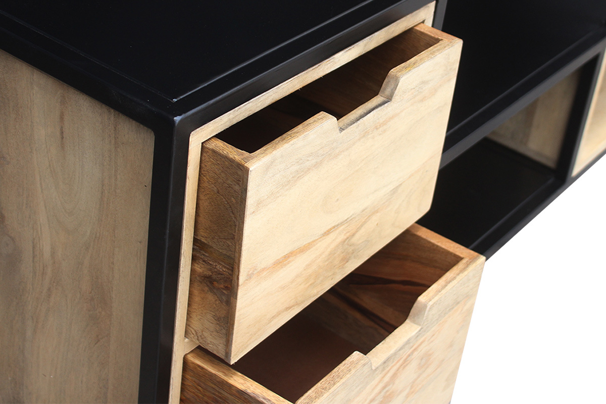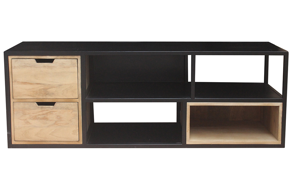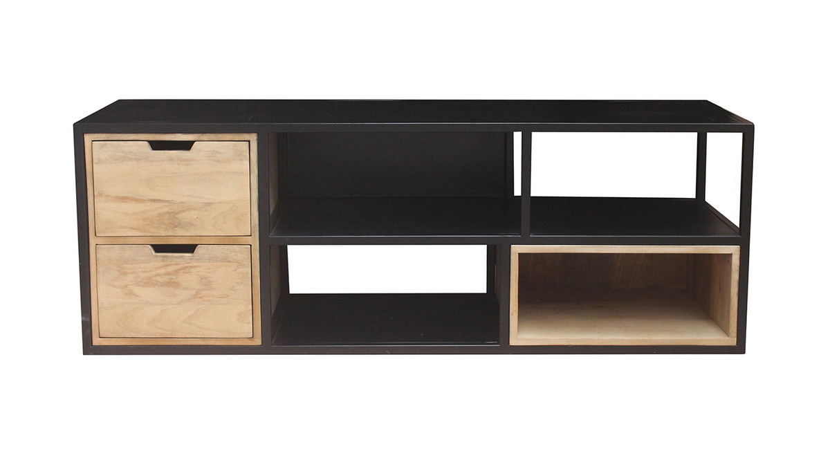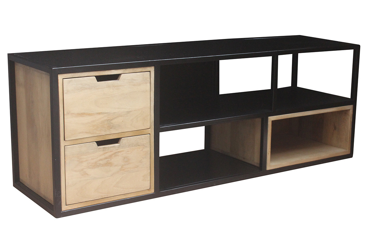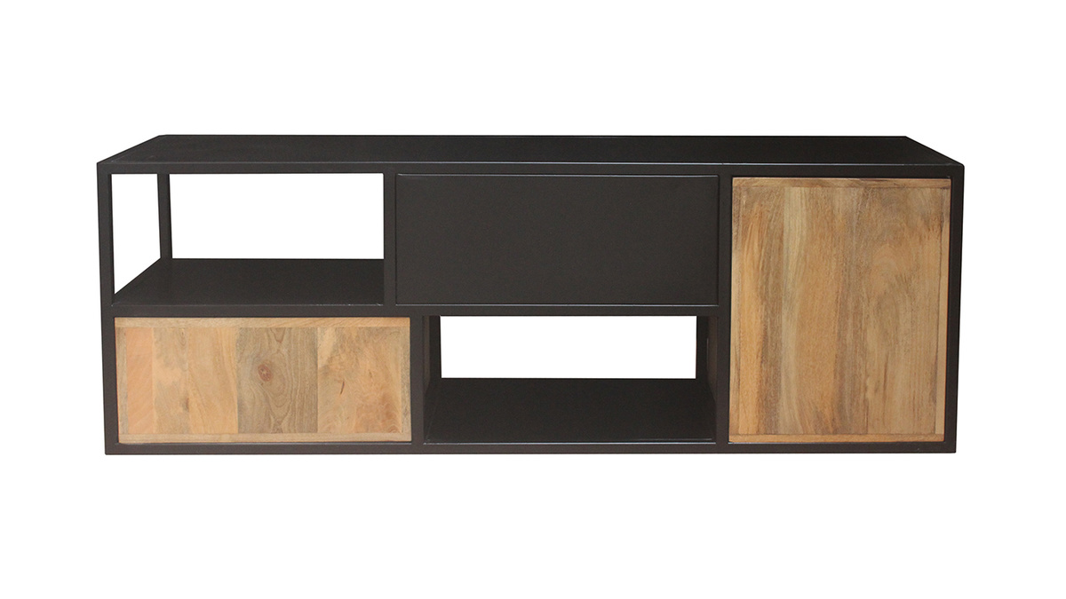 Le meuble TV JAIPUR, un modèle où tout est parfaitement équilibré : les rangements fermés en bois massif répondent aux niches ouvertes travaillées tout en finesse ; le manguier, bois chaleureux et exotique, à la structure métallique noire. La variété de taille des éléments ajoute une touche de fantaisie à l'ensemble pour un rendu original.