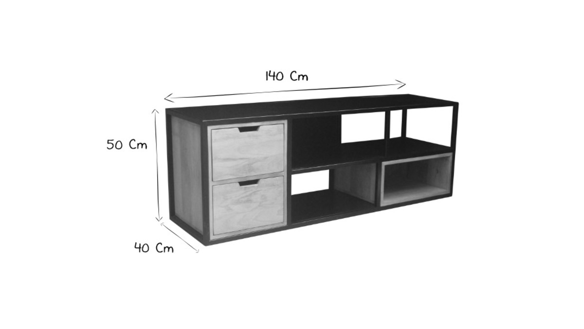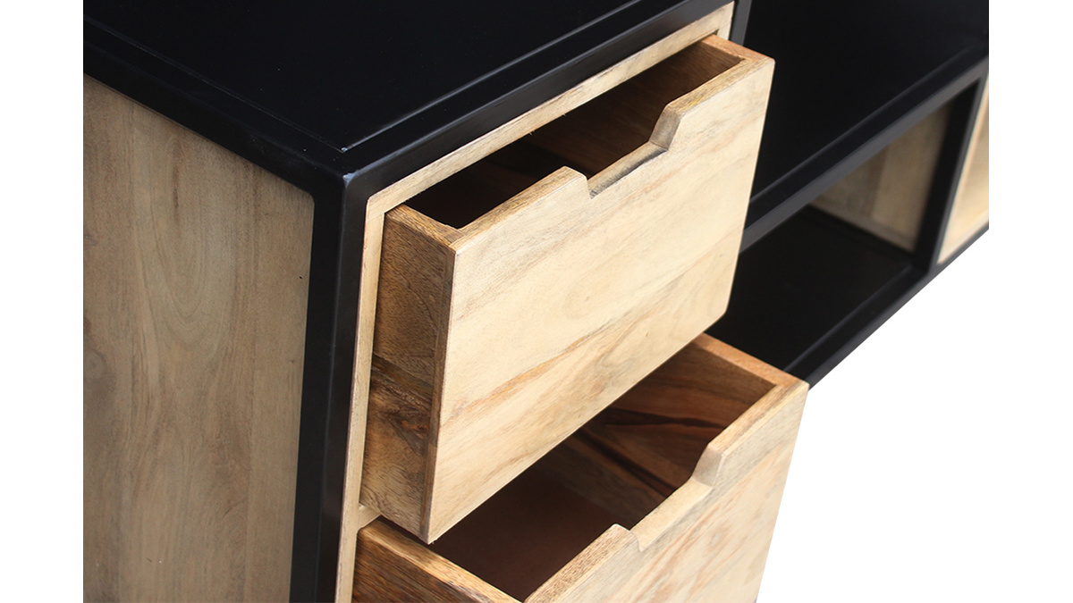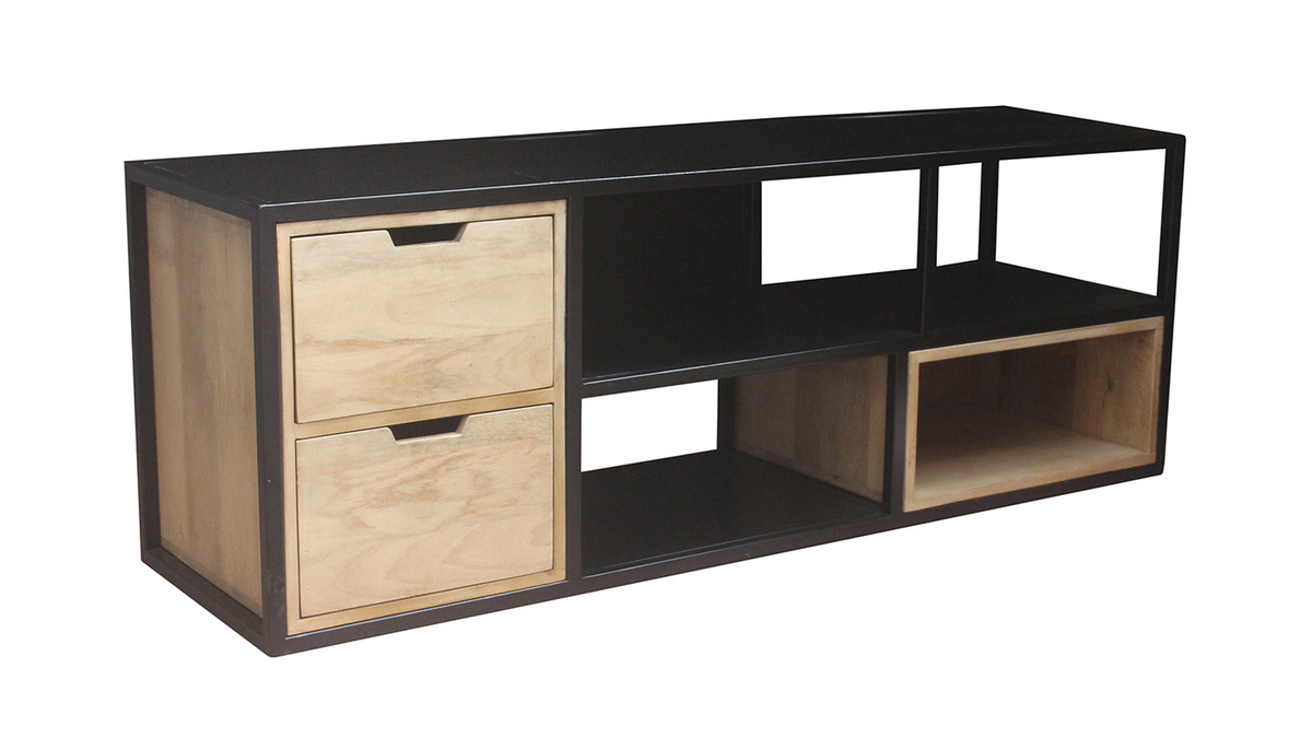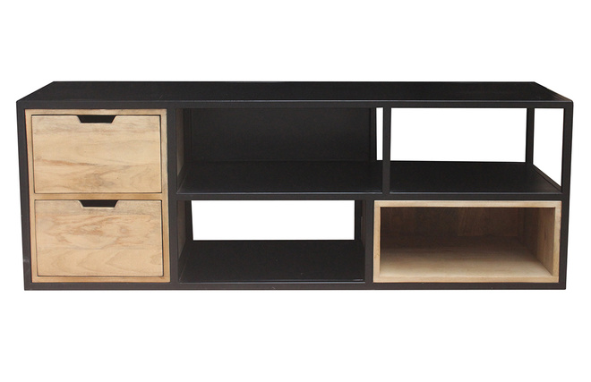 Le meuble TV JAIPUR, un modèle où tout est parfaitement équilibré : les rangements fermés en bois massif répondent aux niches ouvertes travaillées tout en finesse ; le manguier, bois chaleureux et exotique, à la structure métallique noire. La variété de taille des éléments ajoute une touche de fantaisie à l'ensemble pour un rendu original.
