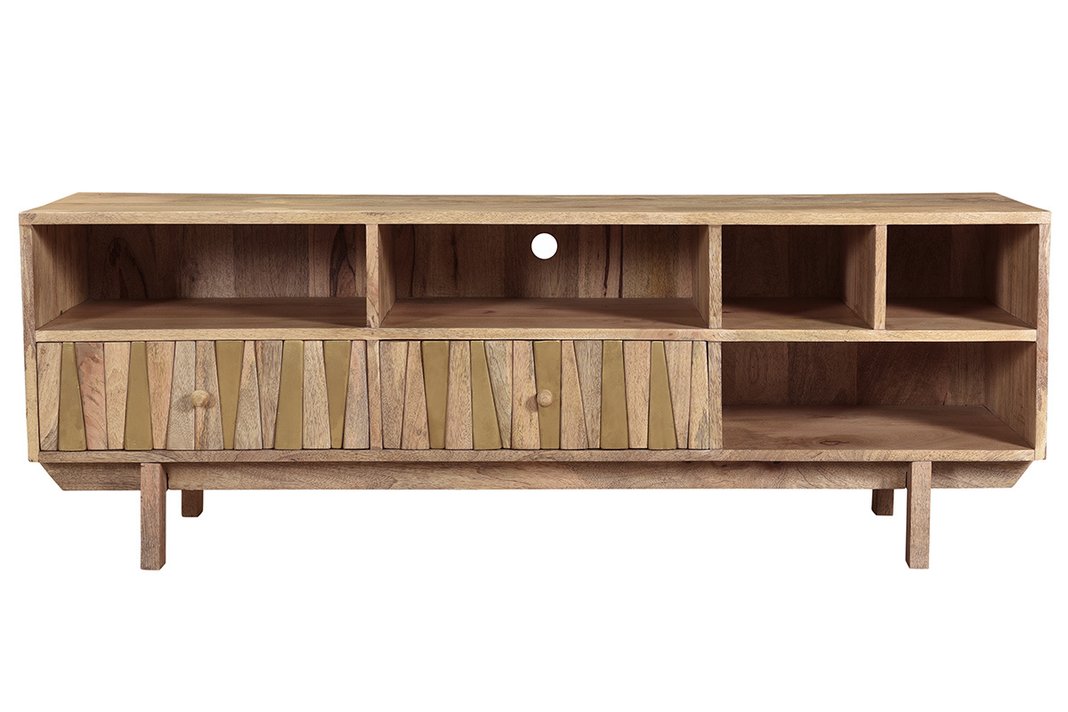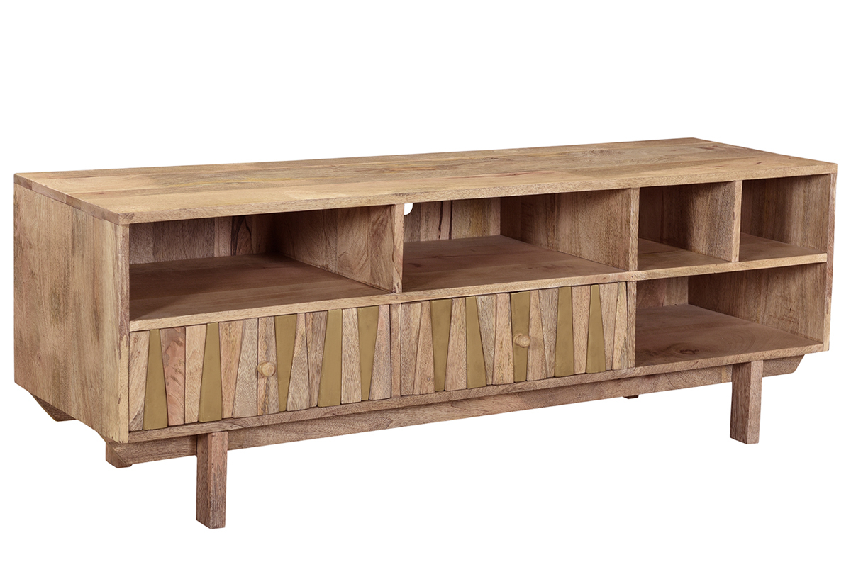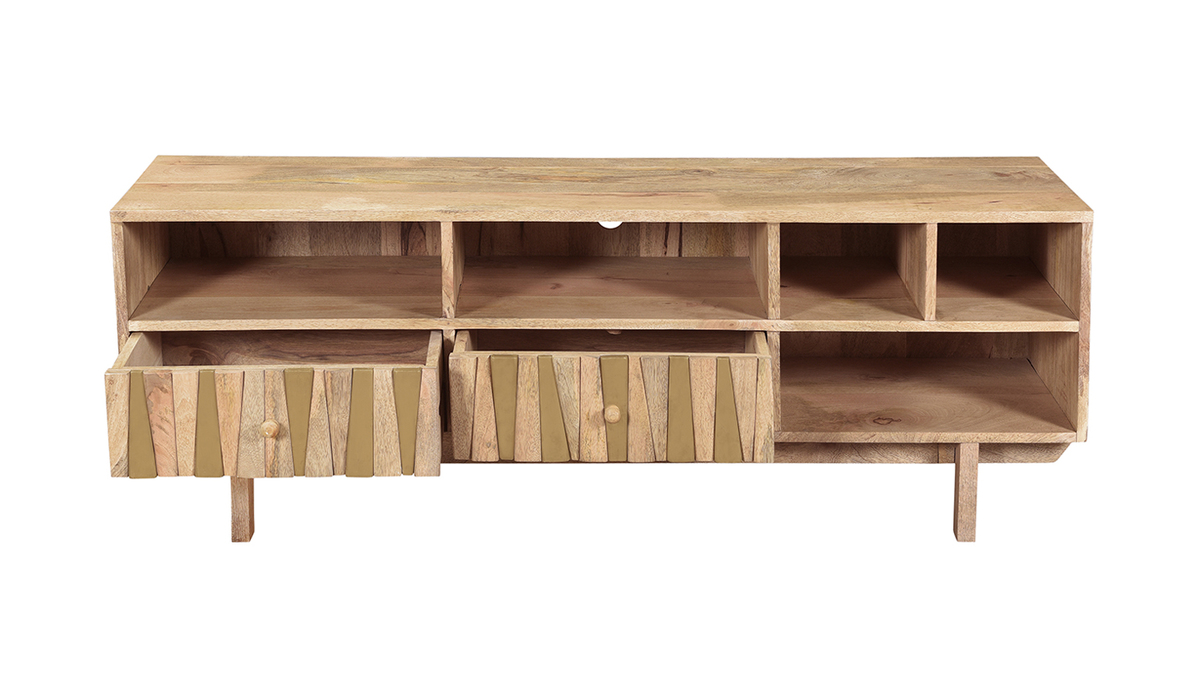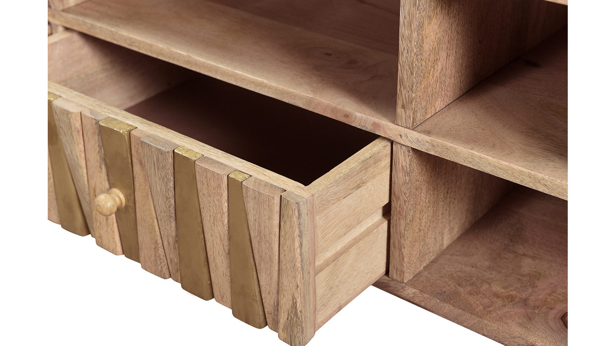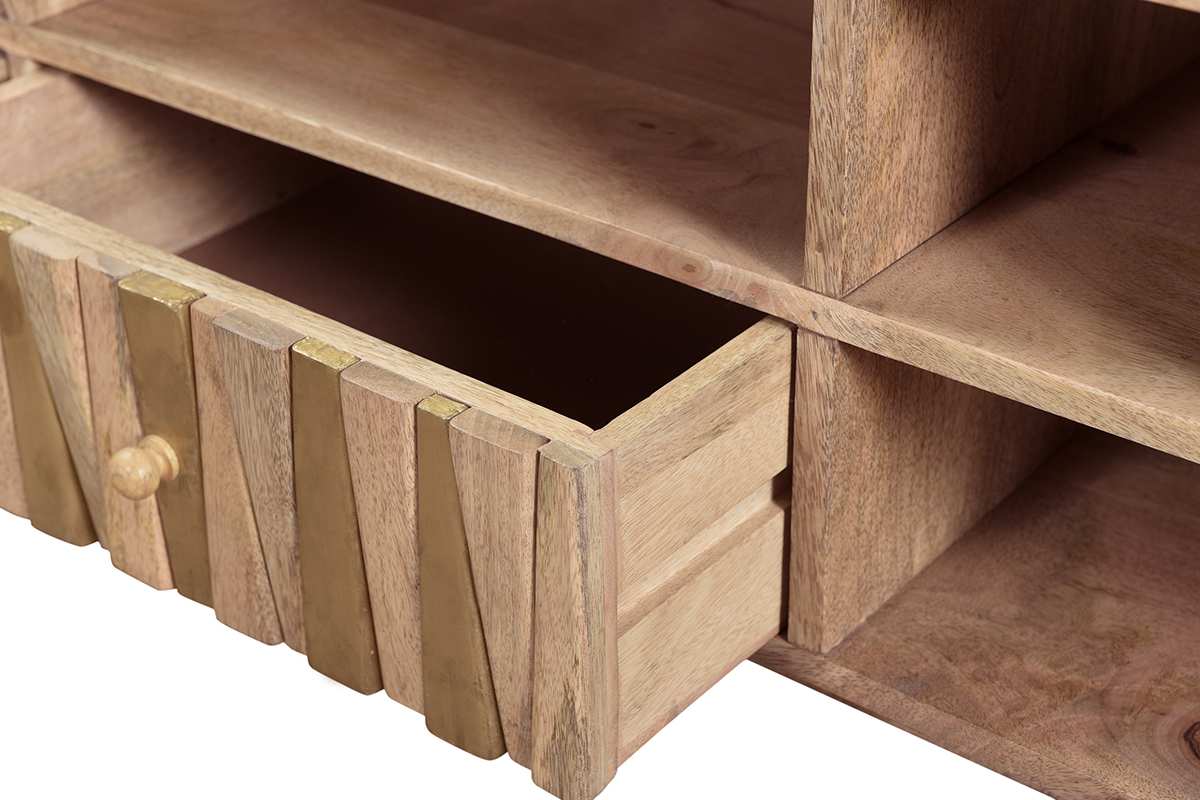 Imaginé par notre designer Caroline Marliac, ce meuble TV design ZAIKA est conçu de manière artisanale et apporte donc du cachet à une pièce. Fabriqué en manguier, une essence de bois exotique et chaleureuse, il possède différentes nuances et des nervures caractéristiques qui font de chaque meuble des pièces uniques. Ce meuble est également solide puisqu'il est entièrement composé de bois massif. Pour le côté décoratif, les tiroirs sont ornés de formes géométriques en manguier et détails dorés. Le mélange de ces deux matières en fait une pièce lumineuse et originale.