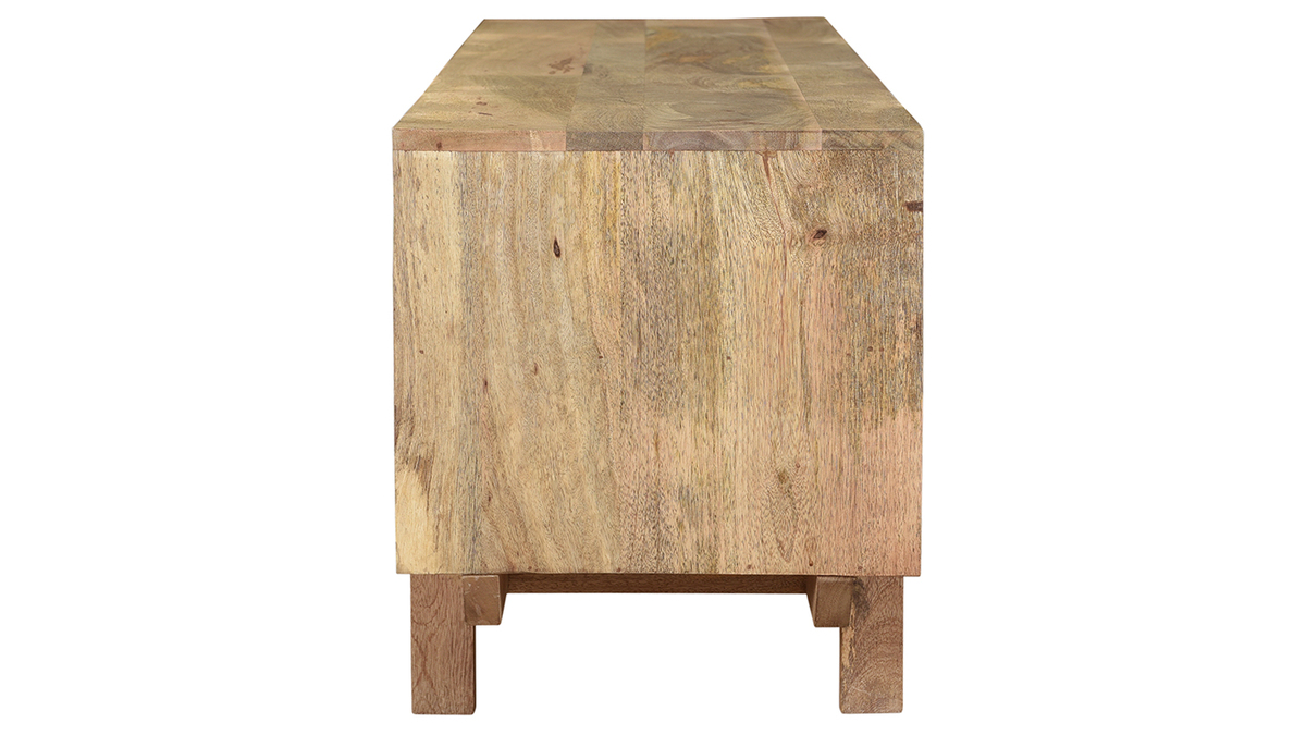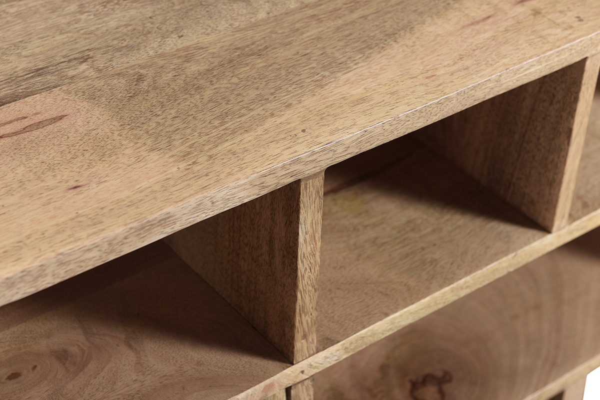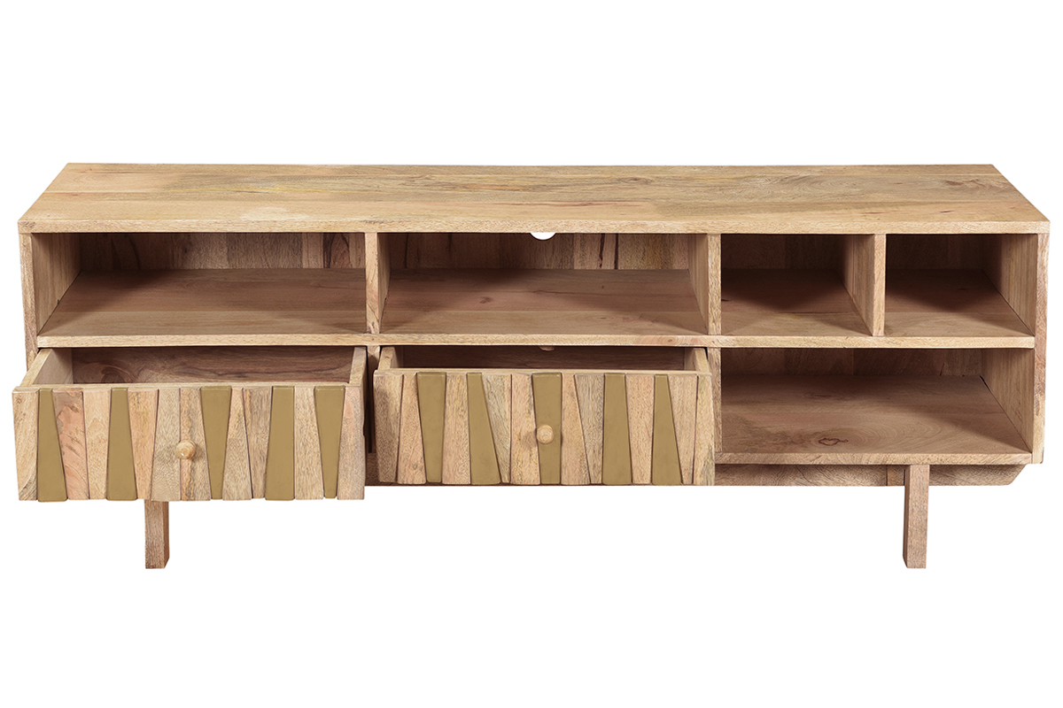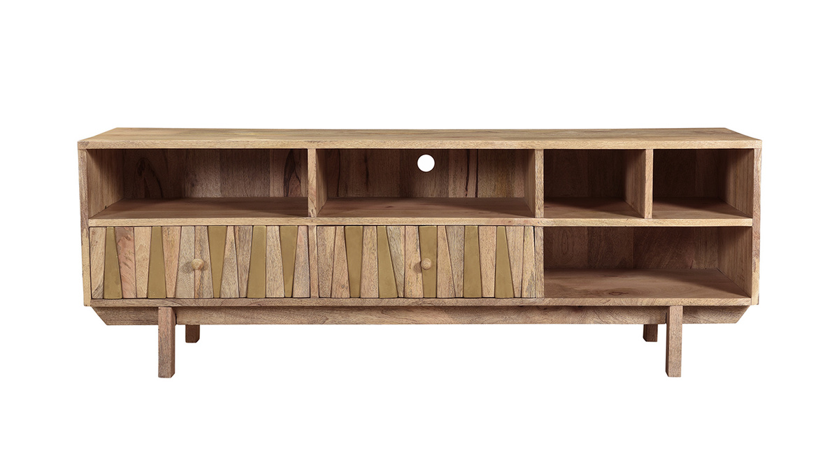 Imaginé par notre designer Caroline Marliac, ce meuble TV design ZAIKA est conçu de manière artisanale et apporte donc du cachet à une pièce. Fabriqué en manguier, une essence de bois exotique et chaleureuse, il possède différentes nuances et des nervures caractéristiques qui font de chaque meuble des pièces uniques. Ce meuble est également solide puisqu'il est entièrement composé de bois massif. Pour le côté décoratif, les tiroirs sont ornés de formes géométriques en manguier et détails dorés. Le mélange de ces deux matières en fait une pièce lumineuse et originale.