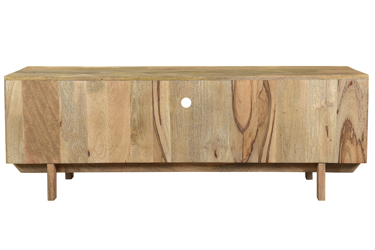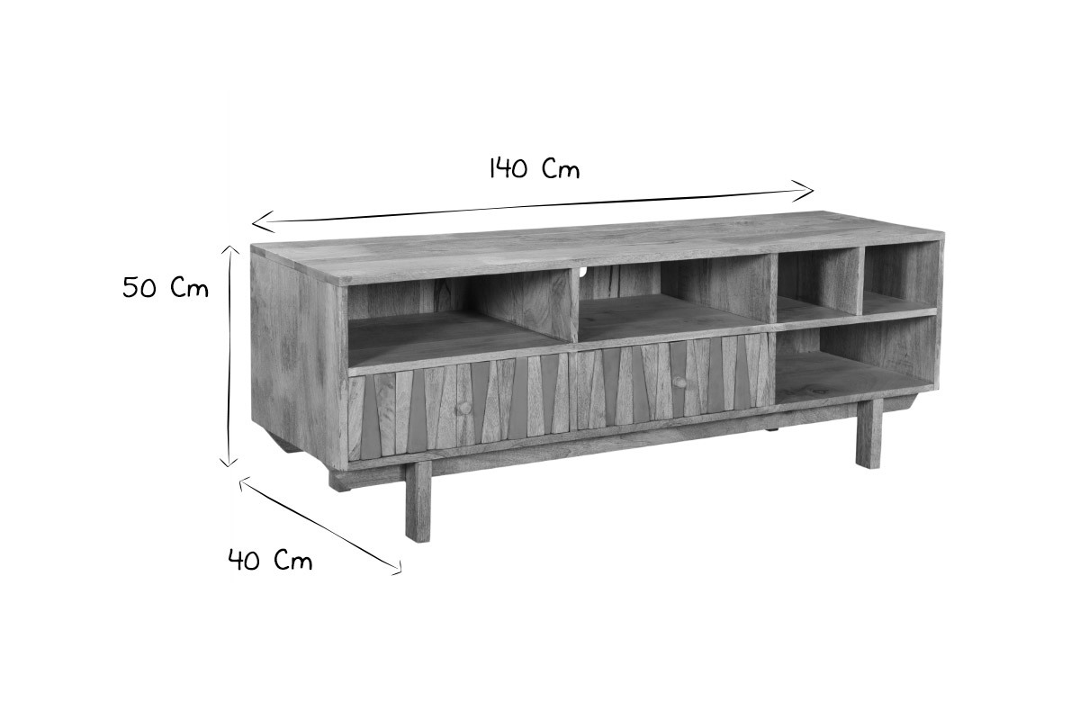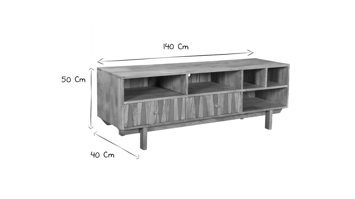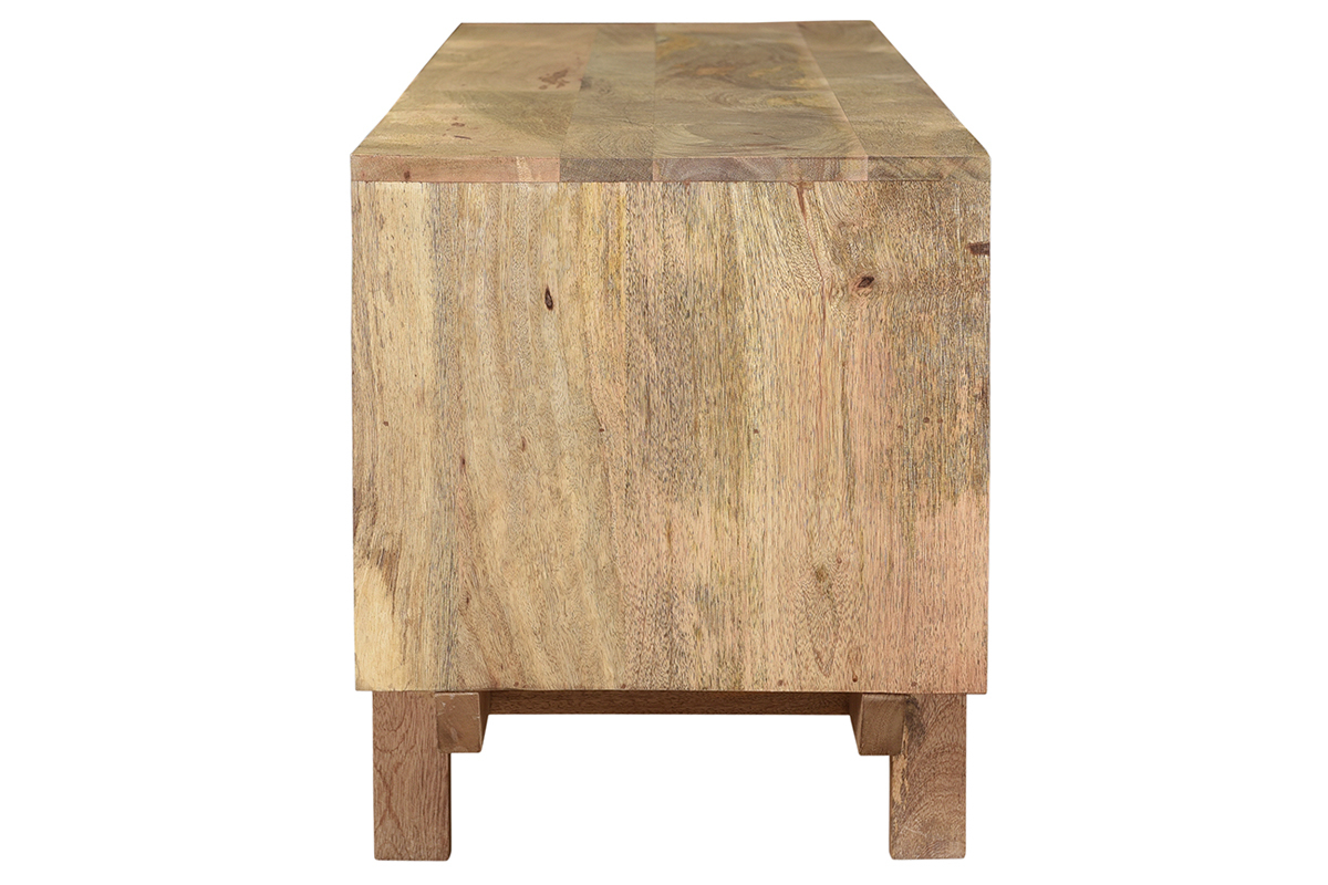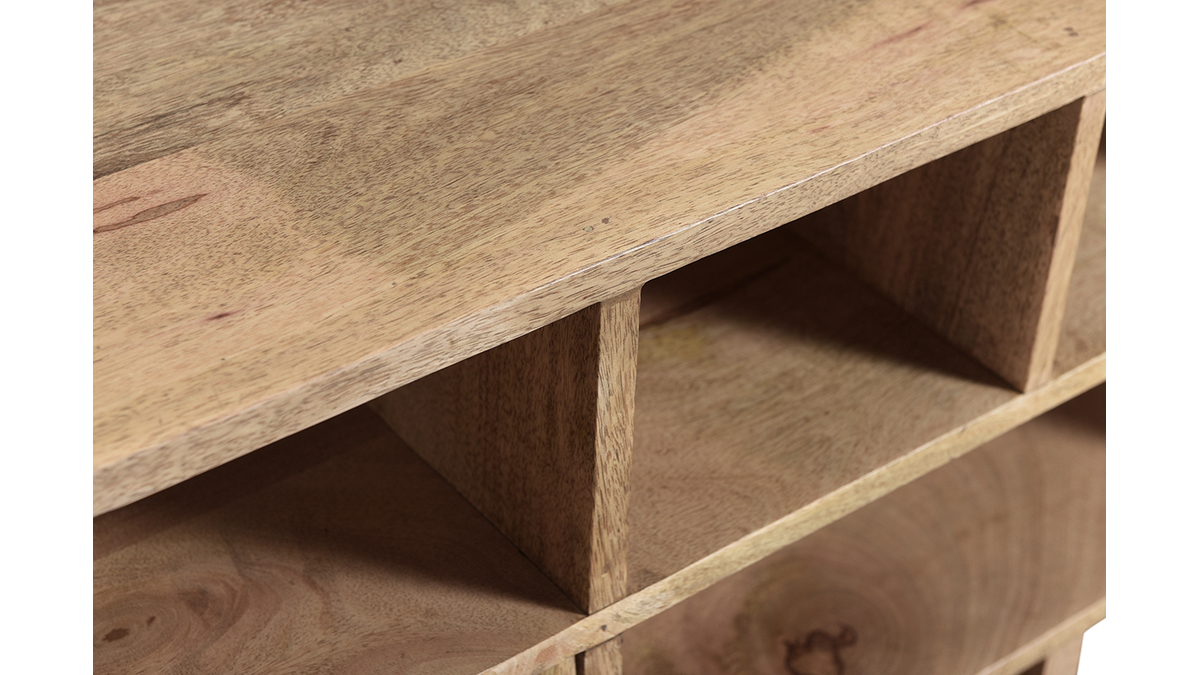 Imaginé par notre designer Caroline Marliac, ce meuble TV design ZAIKA est conçu de manière artisanale et apporte donc du cachet à une pièce. Fabriqué en manguier, une essence de bois exotique et chaleureuse, il possède différentes nuances et des nervures caractéristiques qui font de chaque meuble des pièces uniques. Ce meuble est également solide puisqu'il est entièrement composé de bois massif. Pour le côté décoratif, les tiroirs sont ornés de formes géométriques en manguier et détails dorés. Le mélange de ces deux matières en fait une pièce lumineuse et originale.