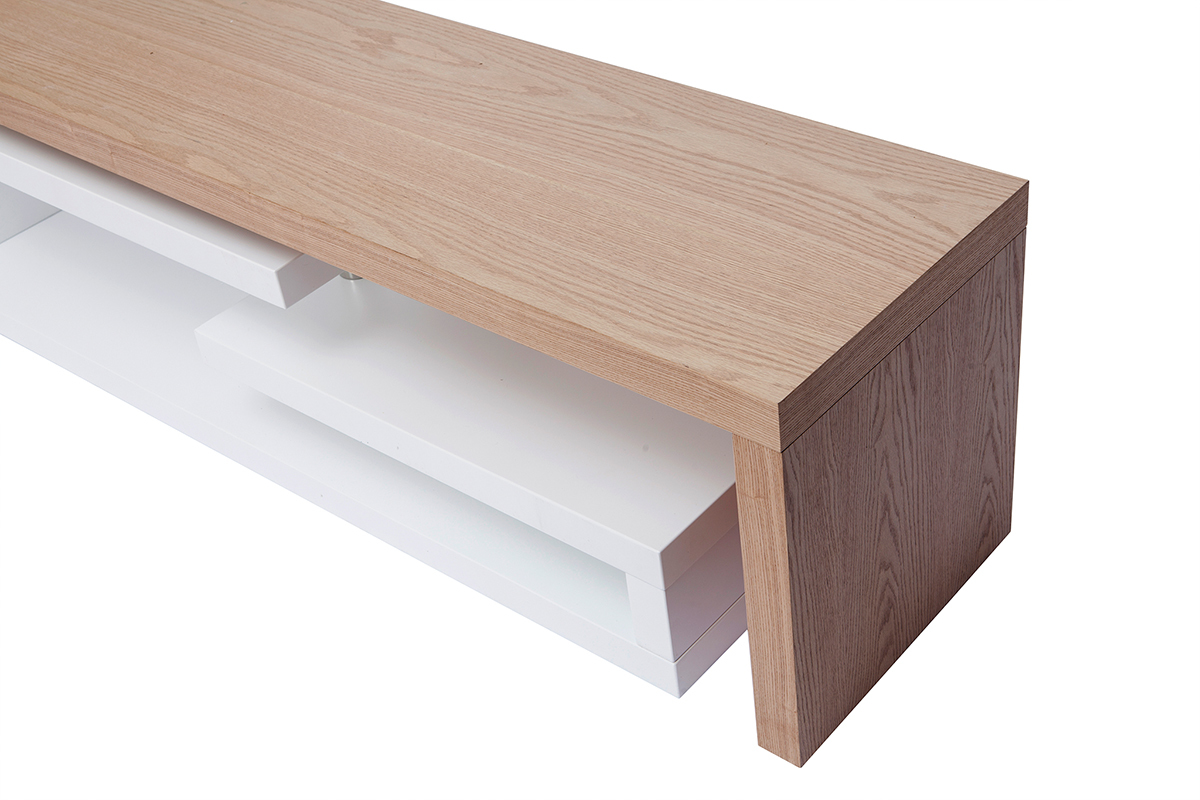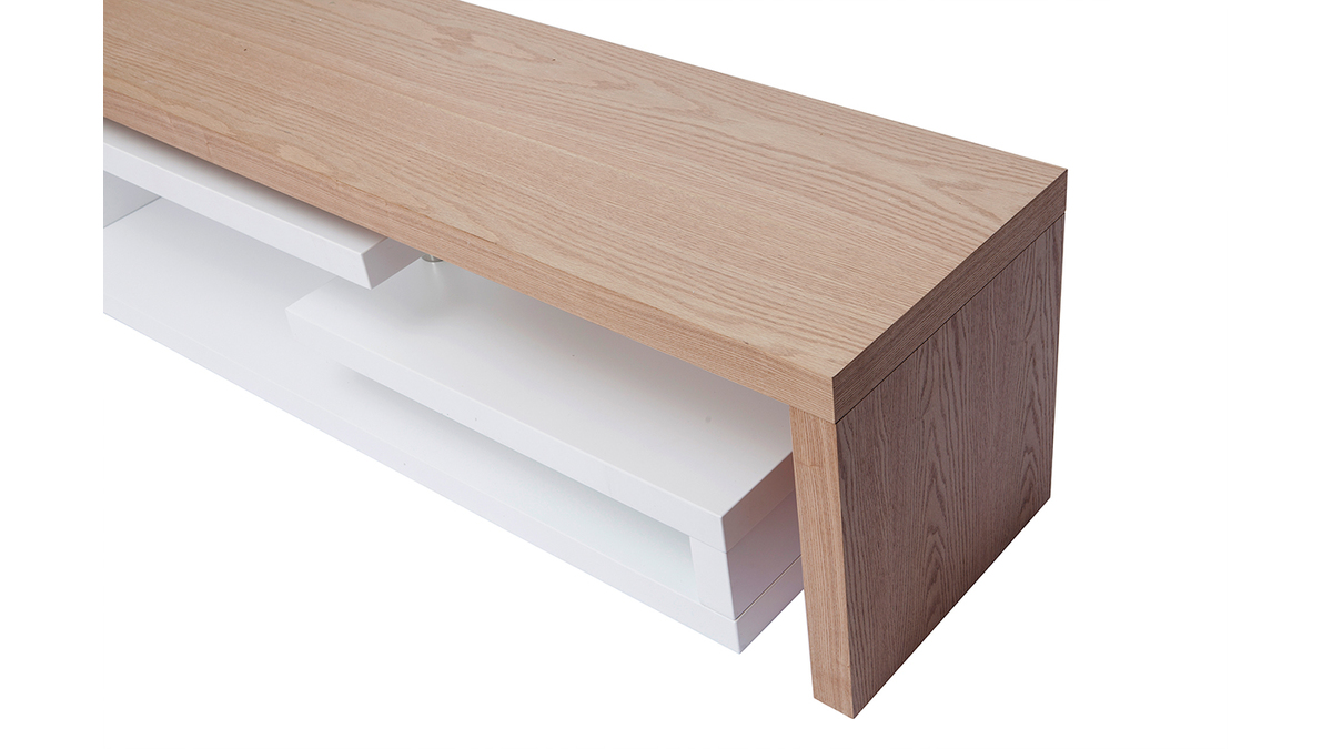 Equilibre parfait entre le beau et l'utile, ce meuble TV modulable s'intègre facilement dans un salon moderne. Il associe un plateau en panneaux de fibres de bois placage chêne et des étagères blanc laqué mat pour un rendu unique. La légèreté visuelle de ce meuble TV design convient à merveille aux petits espaces à ne pas encombrer.