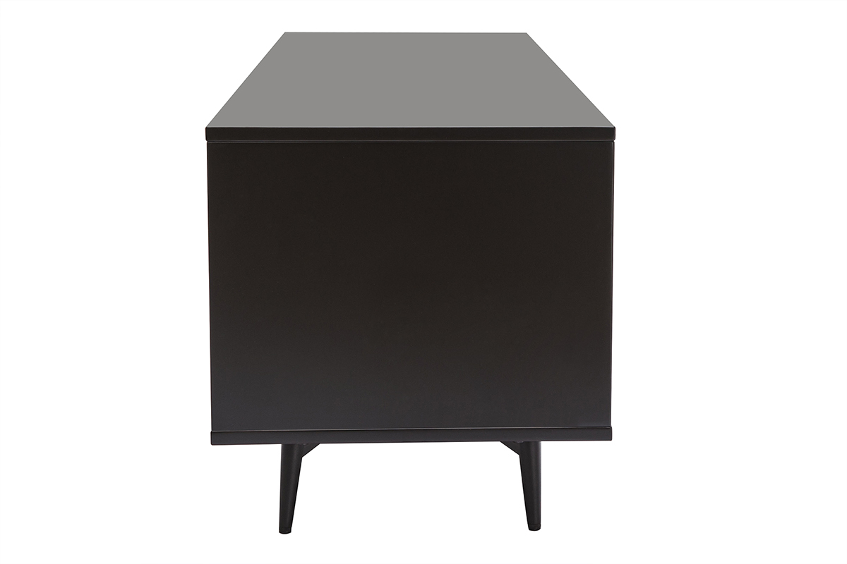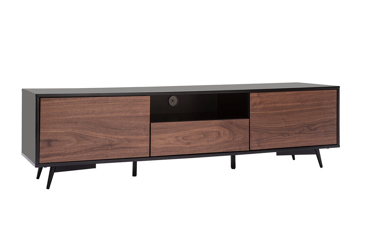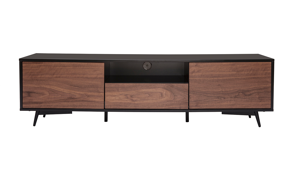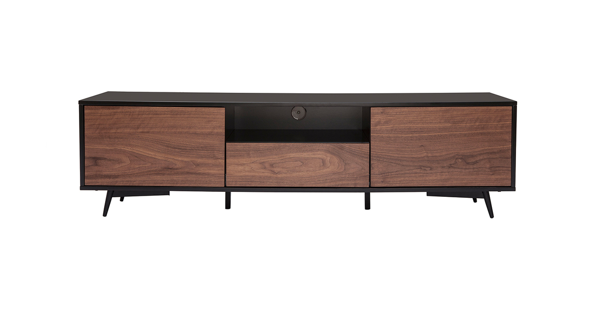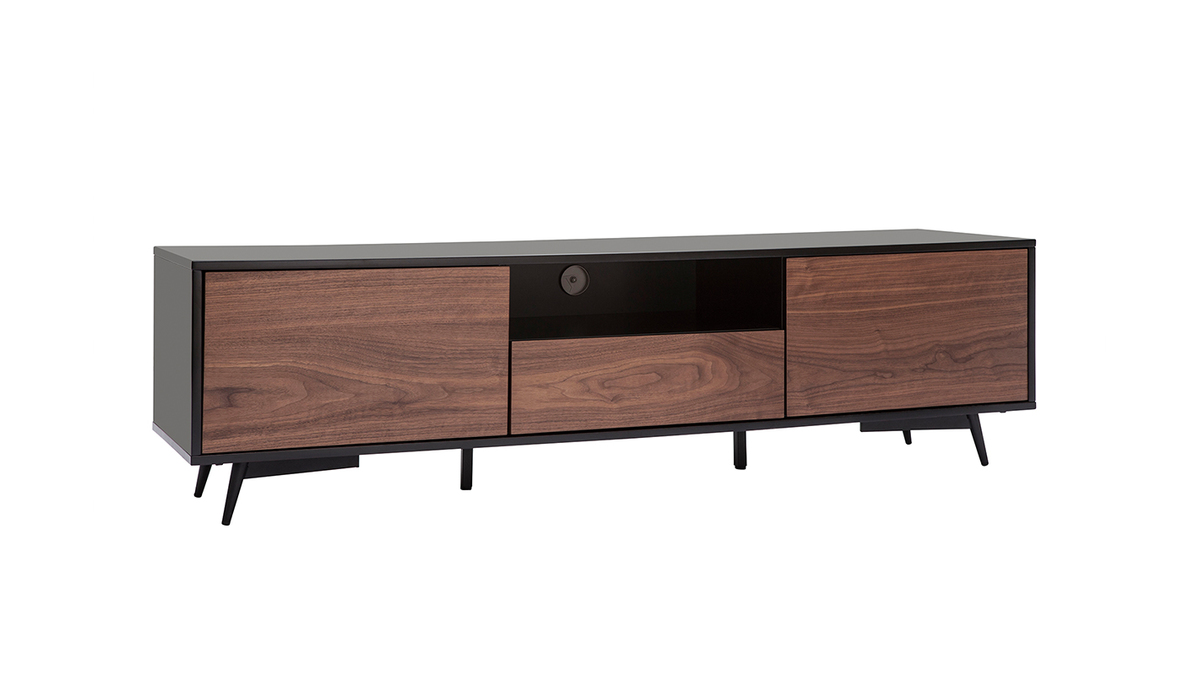 Mises en relief par un brun profond et nuancé, soulignées par le piètement compas en métal noir et les volumes minimalistes du caisson en panneaux de fibres de bois finition noir mat, les portes battantes plaquées noyer ne manquent pas d'apporter du cachet à ce meuble TV design. Prêts à envelopper de douceur un salon en quête d'élégance, bois foncé et noir forment une combinaison dont on ne fait plus l'éloge et offrent un résultat visuel des plus harmonieux. Inspiration vintage et lignes modernes se partagent la vedette d'une silhouette raffinée qu'on imagine prendre ses marques dans de nombreux styles d'intérieur.