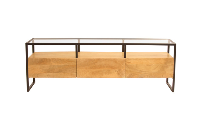 Ici, le bois donne la réplique au métal... Et au verre ! Manguier massif, métal noir et verre transparent forment ensemble un meuble TV design à la personnalité affirmée. On aime la manière par laquelle sa silhouette fait ressortir la beauté de chacune des matières !