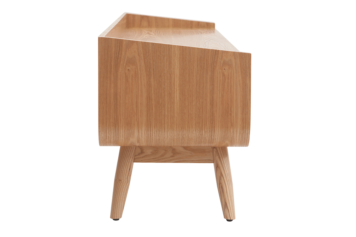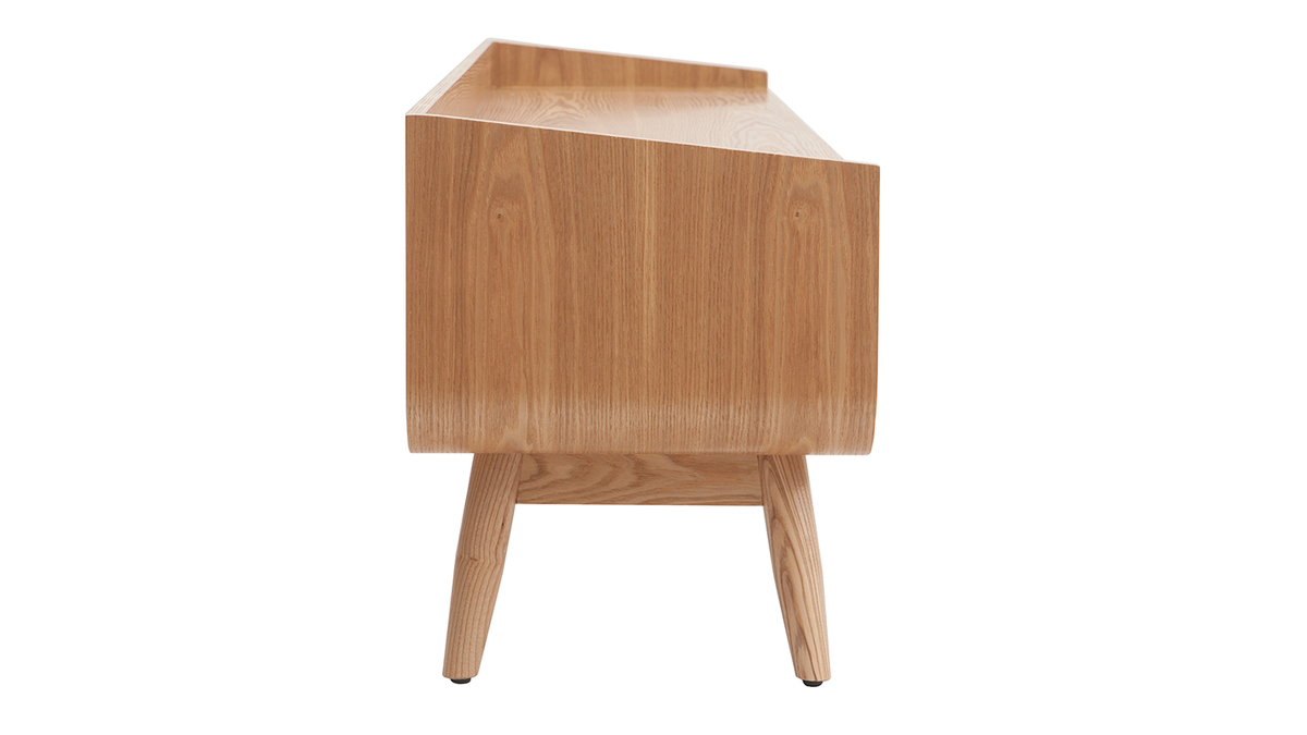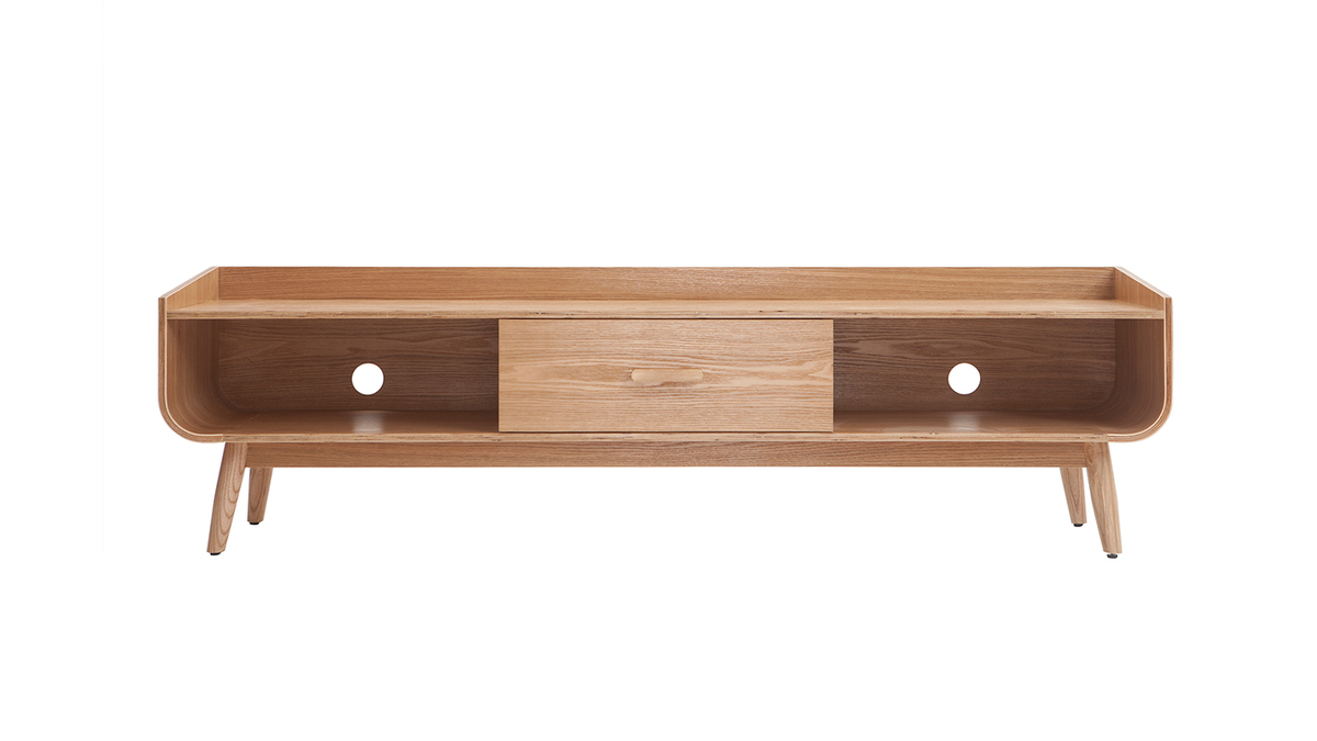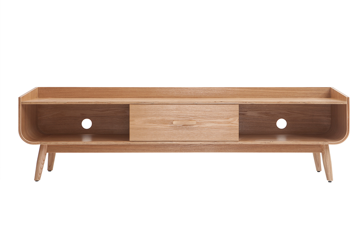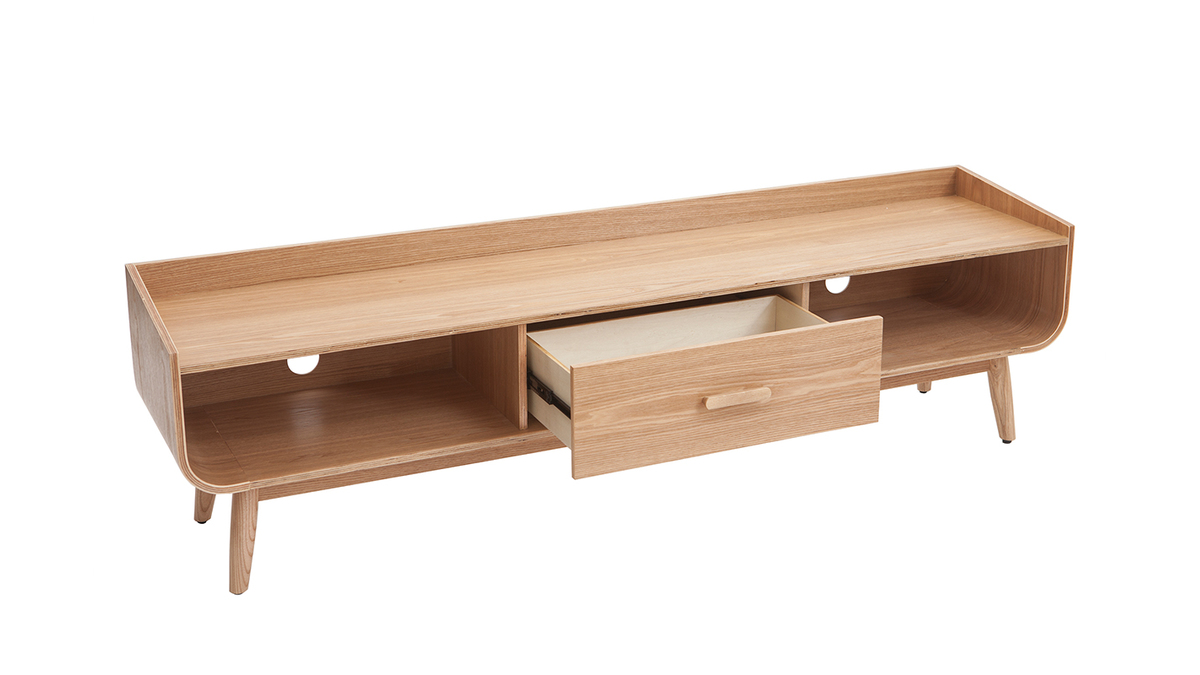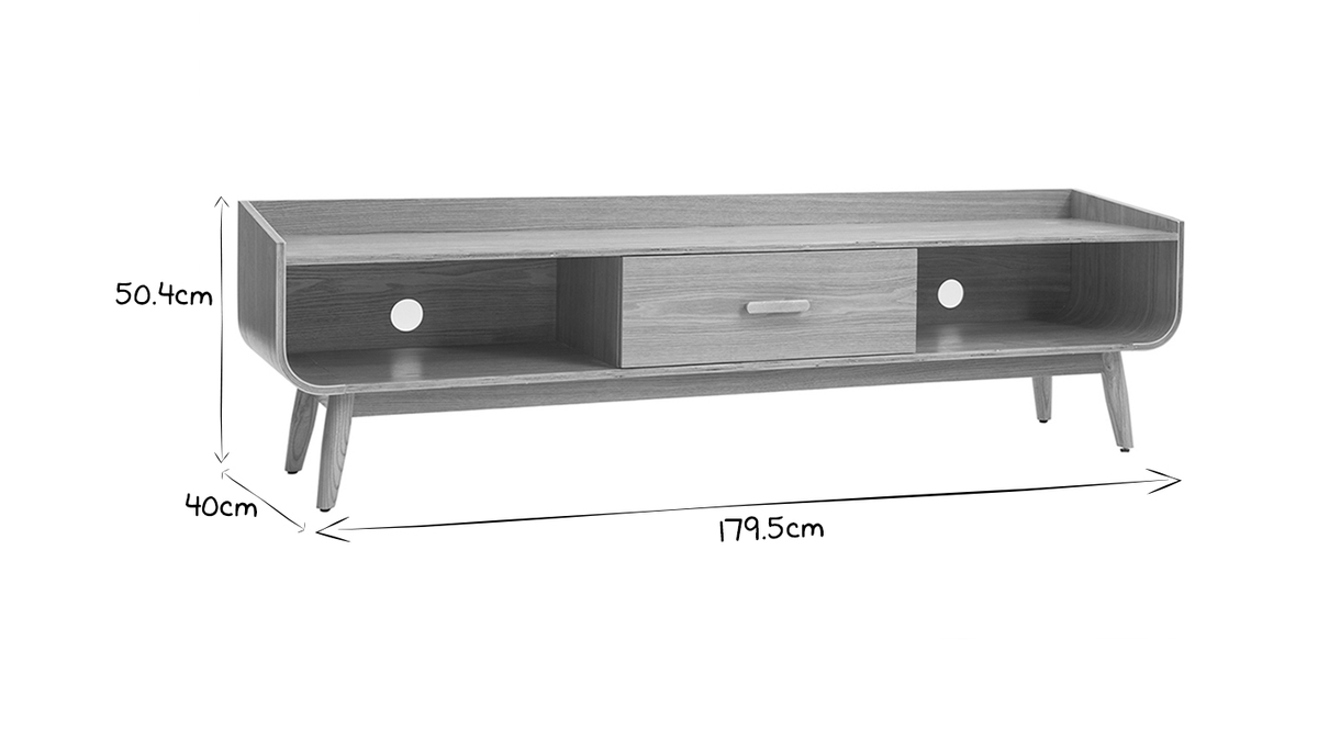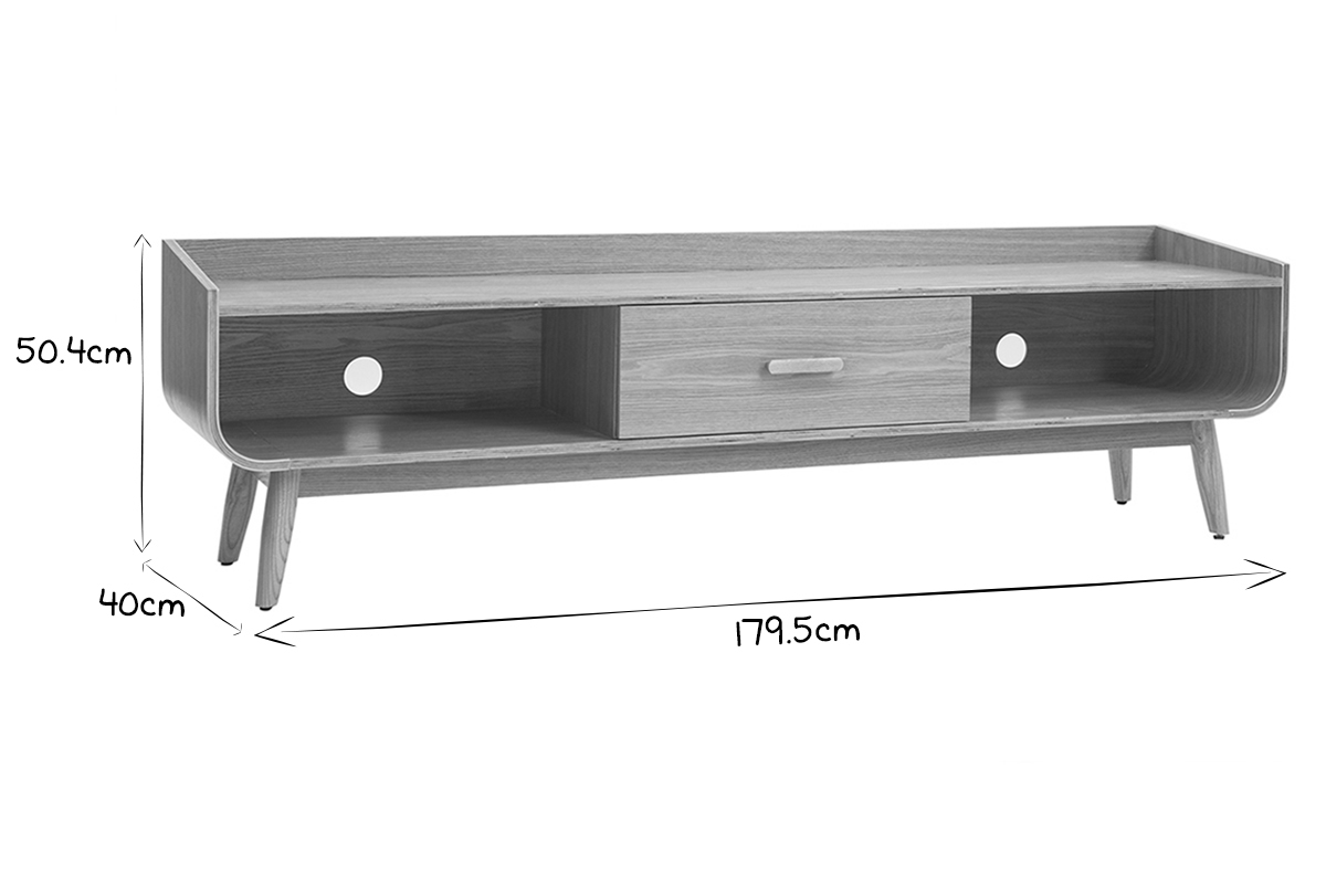 Les lignes arrondies et épurées de ce meuble TV sont très agréables, elles apportent de la douceur à votre intérieur ainsi qu'un look naturel tendance. Le meuble TV HALLEN se compose d'un long plateau de 180 cm ainsi que de deux niches et un tiroir central. Pour plus d'esthétisme, deux trous à l'arrière du meuble ont été réalisés pour laisser passer les câbles de vos appareils électroniques. Ce long meuble TV L180 cm est composé de panneaux de fibres de bois placage frêne et de frêne massif pour le piètement.
