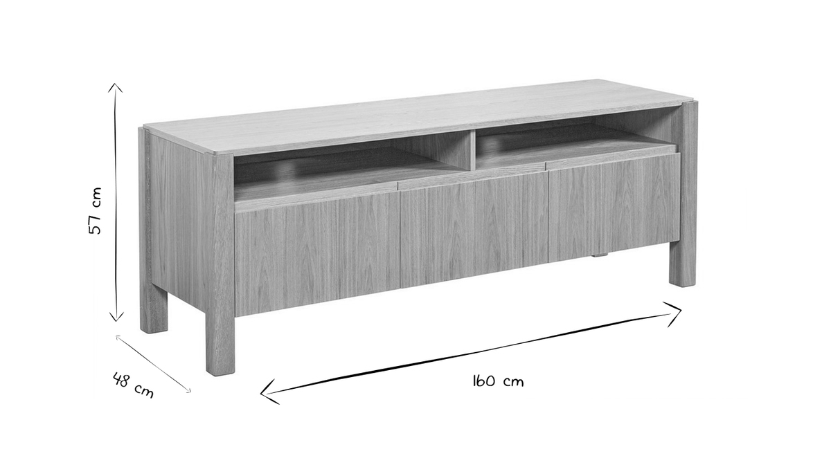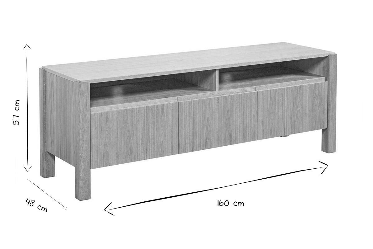 Long de 160 cm, AGALI accueillera facilement un grand écran TV. Il est composé de deux niches ouvertes avec passe-câbles et de trois rangements fermés. Fonctionnelle, vous pourrez facilement y installer votre box internet et autres accessoires high-tech.