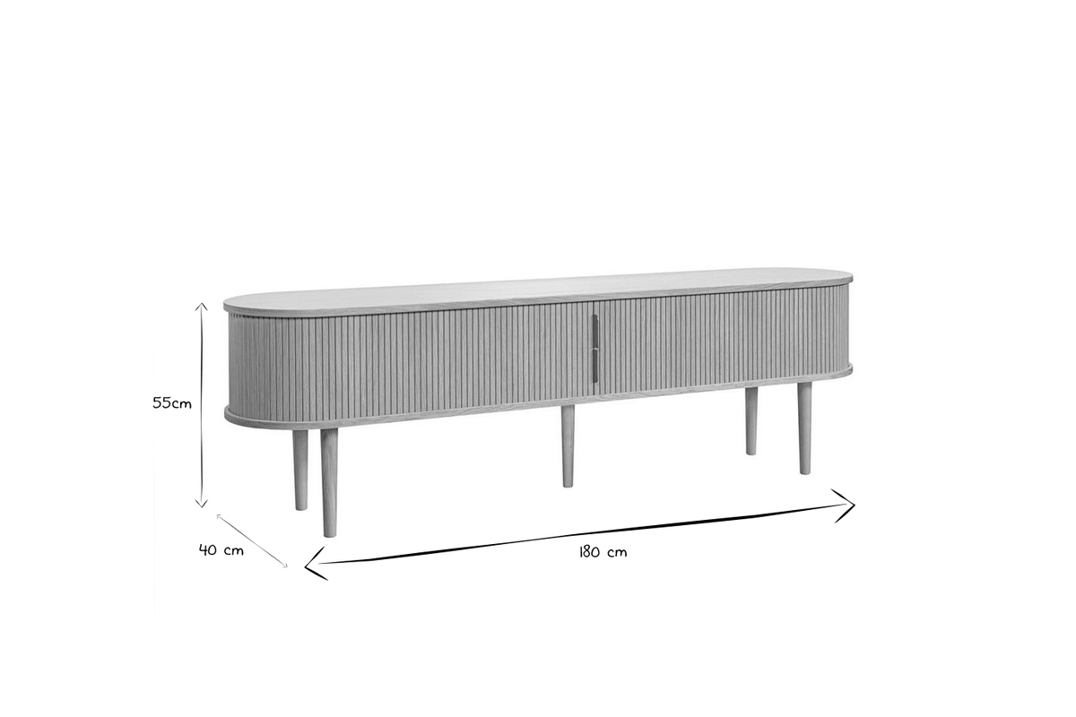 Derrière ses 2 portes coulissantes, ce grand meuble TV en bois (L180 x P40 x H55 cm) cache 4 niches (L69 x P16 x H31 cm) qui accueilleront votre box internet et tous vos autres essentiels.