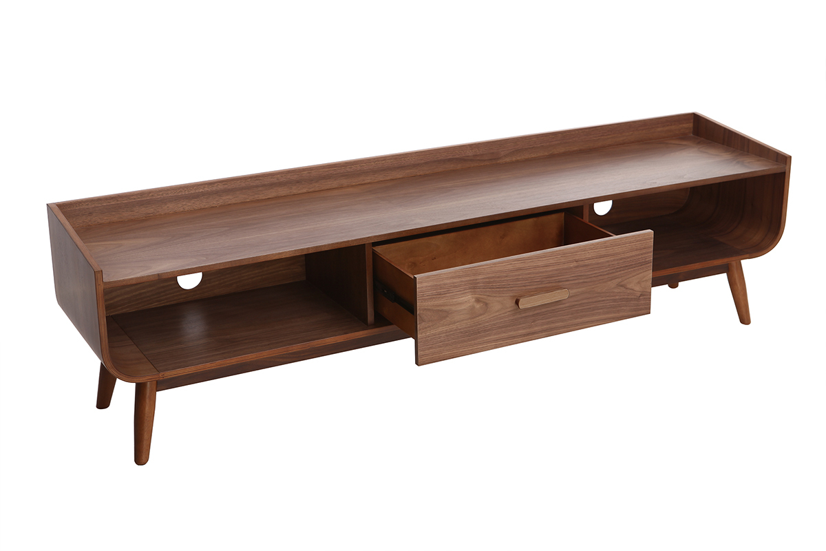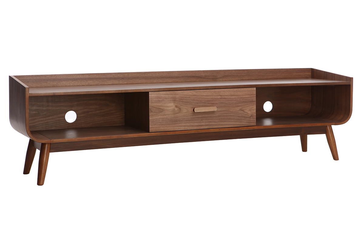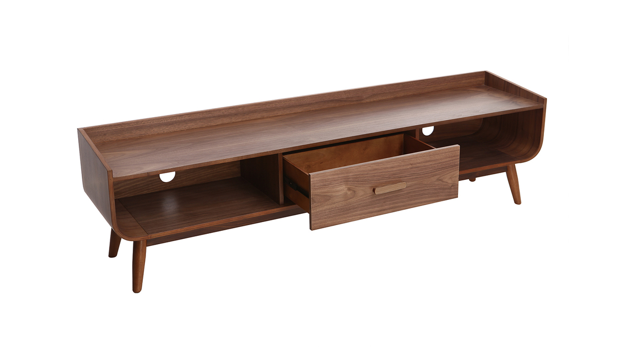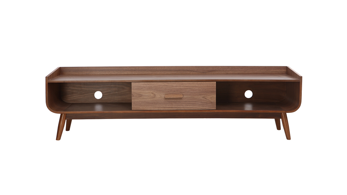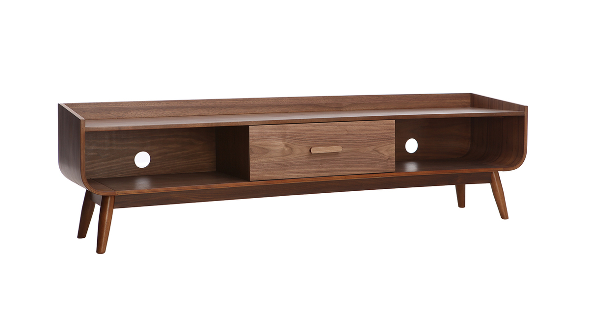 Les lignes arrondies et épurées de ce meuble TV sont très agréables, elles apportent de la douceur à votre intérieur ainsi qu'un look vintage tendance. Le meuble TV HALLEN se compose d'un long plateau de 180 cm ainsi que de deux niches et un tiroir central. Pour plus d'esthétisme, deux trous à l'arrière du meuble ont été réalisés pour laisser passer les câbles de vos appareils électroniques. Ce meuble TV est composé de panneaux de fibres de bois placage noyer et de bois de noyer massif pour le piètement.