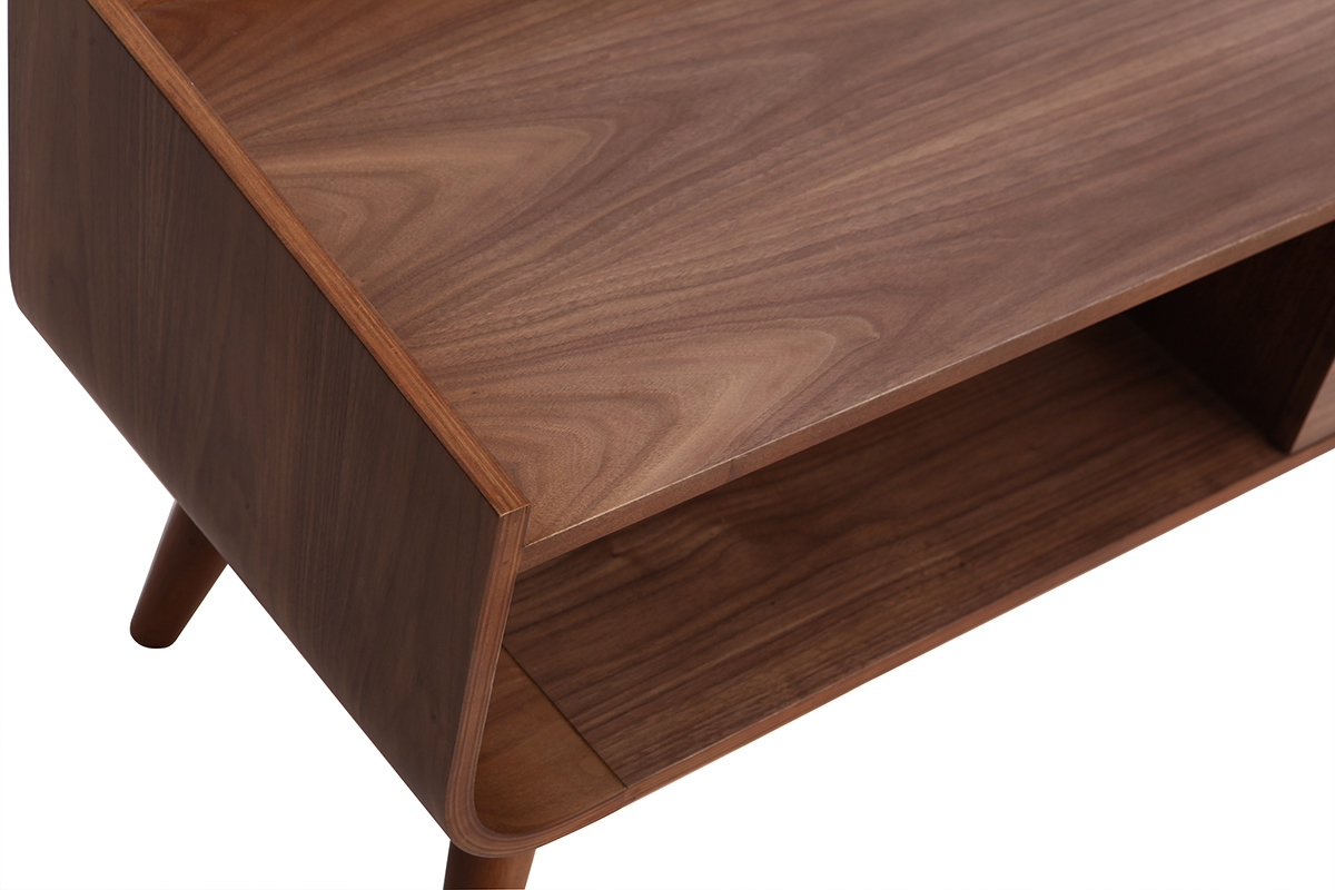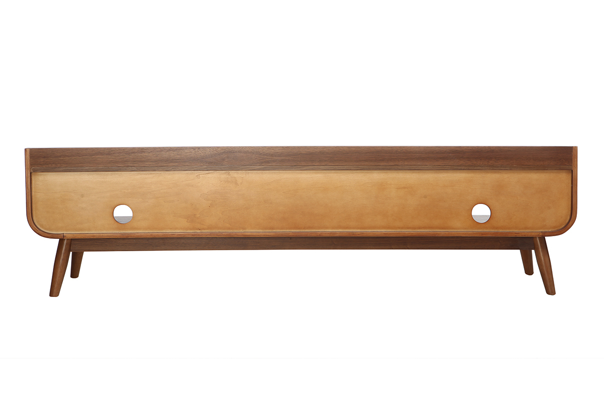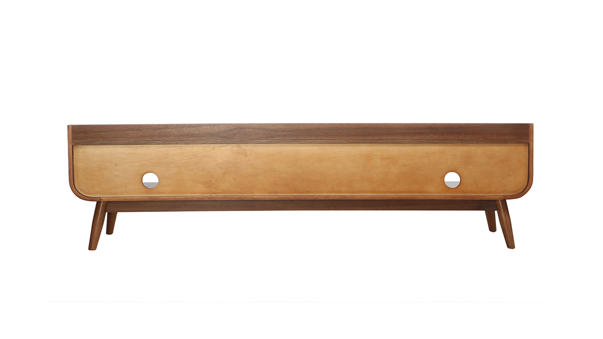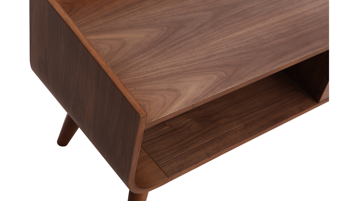 Les lignes arrondies et épurées de ce meuble TV sont très agréables, elles apportent de la douceur à votre intérieur ainsi qu'un look vintage tendance. Le meuble TV HALLEN se compose d'un long plateau de 180 cm ainsi que de deux niches et un tiroir central. Pour plus d'esthétisme, deux trous à l'arrière du meuble ont été réalisés pour laisser passer les câbles de vos appareils électroniques. Ce meuble TV est composé de panneaux de fibres de bois placage noyer et de bois de noyer massif pour le piètement.