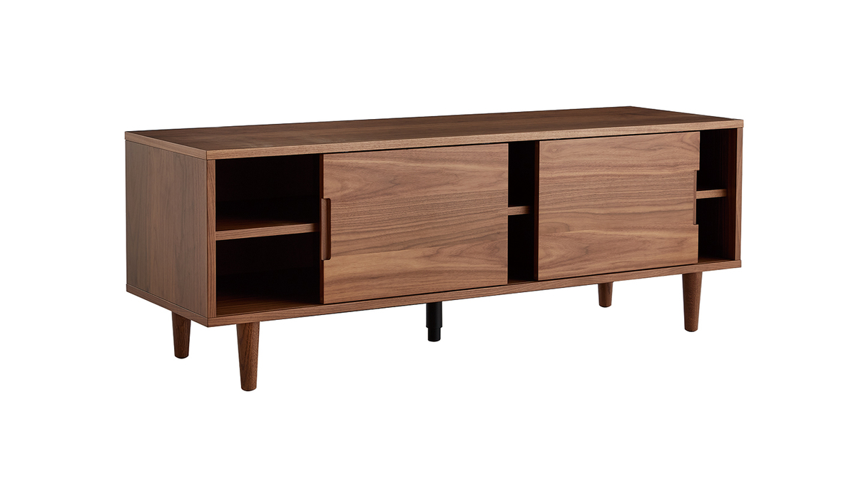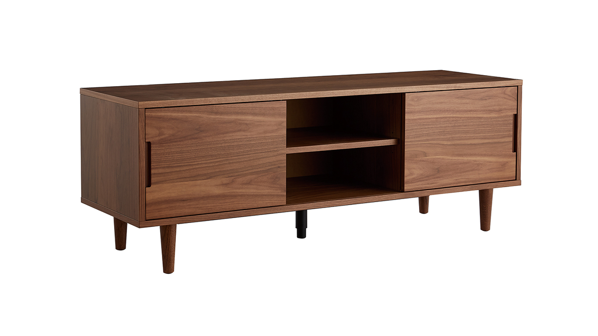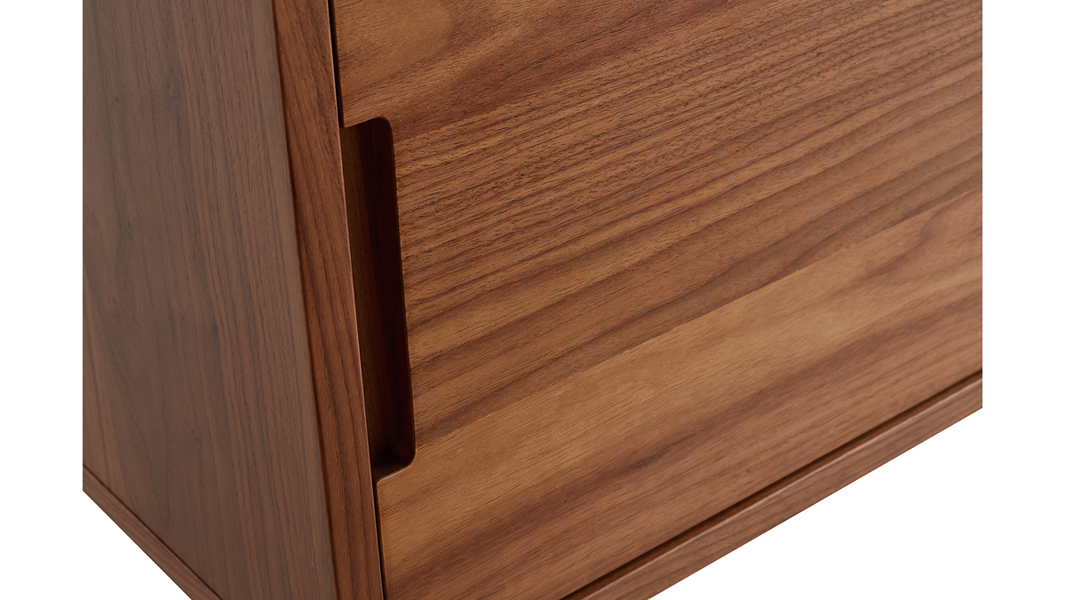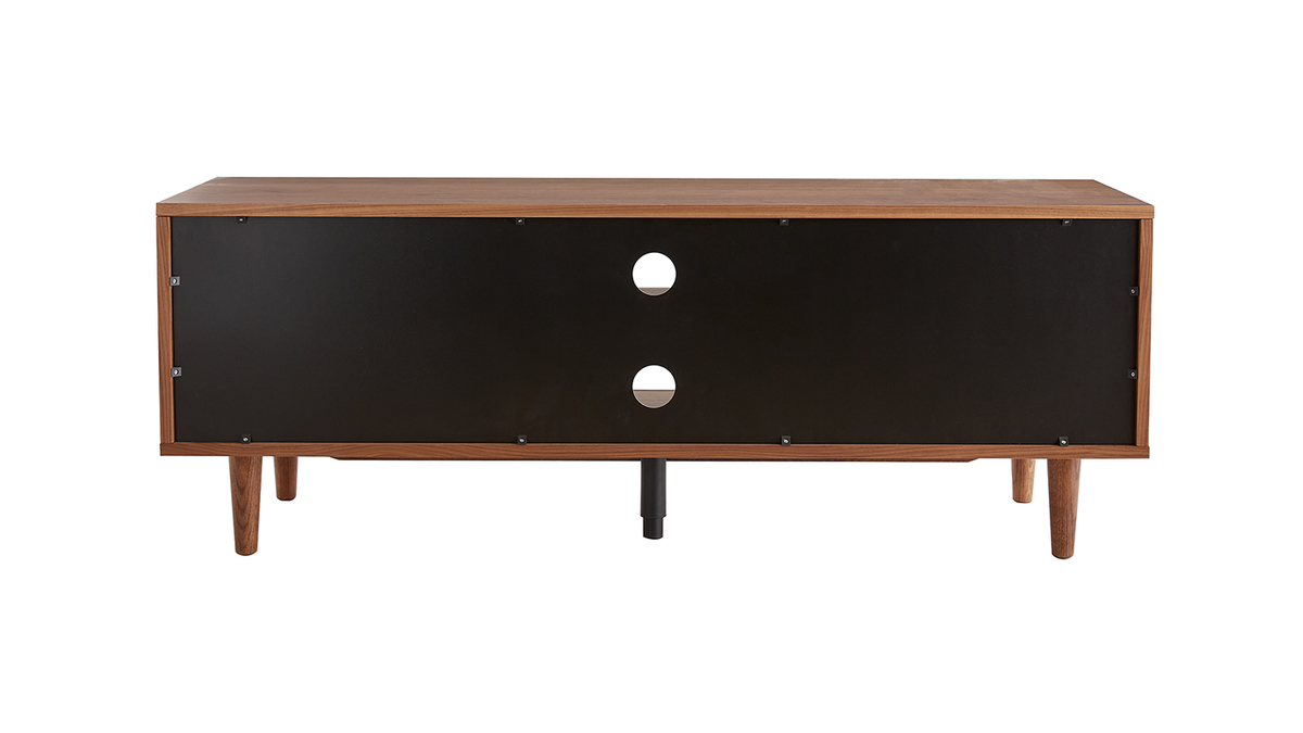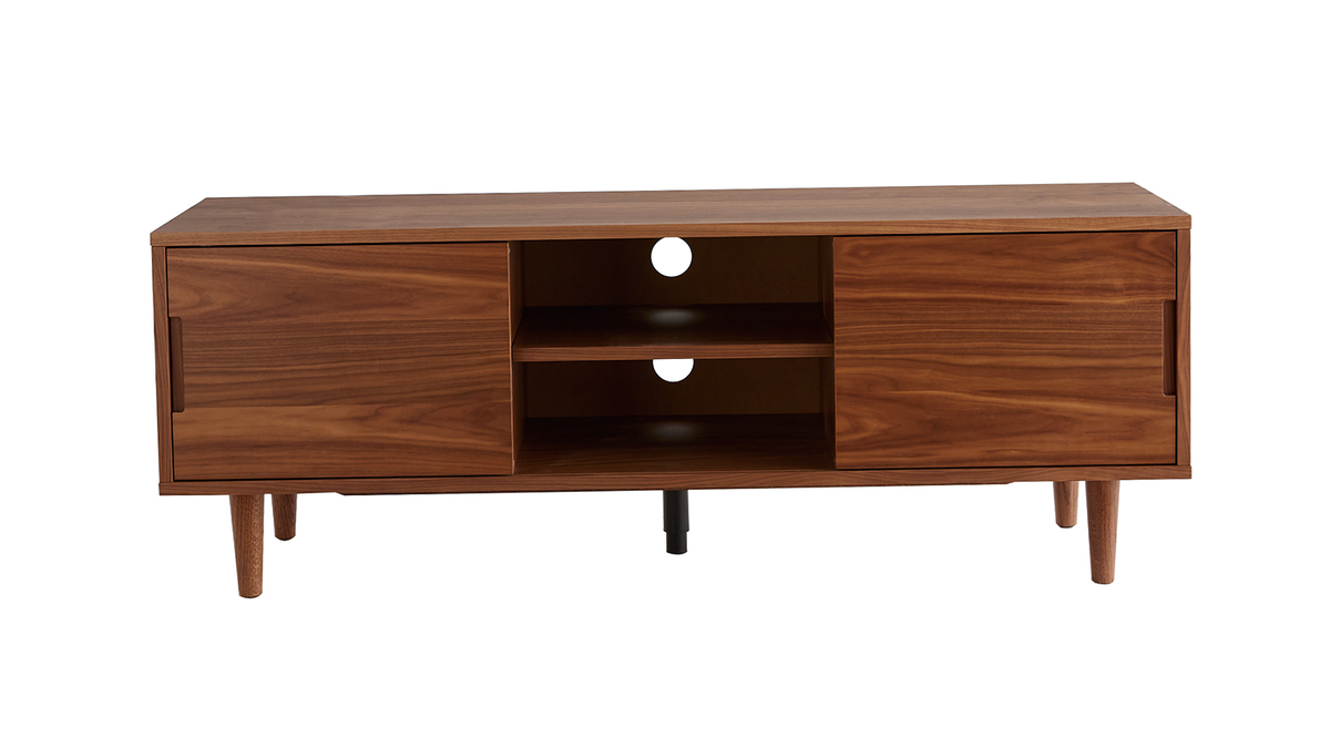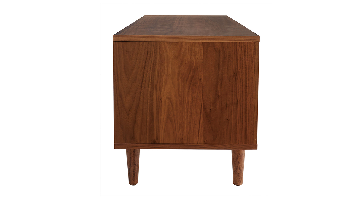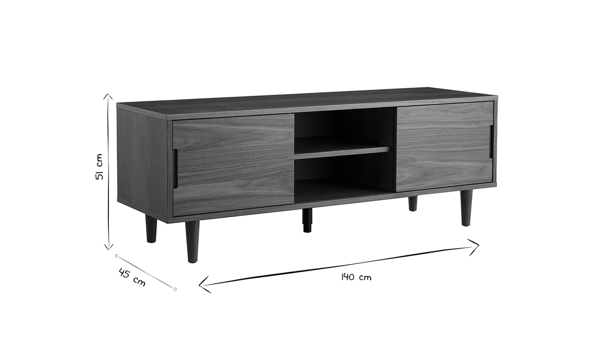 Si RYDD séduit par son design, il n'en est pas moins robuste et fonctionnel. Ce petit meuble TV aux dimensions L140 x P45 x H51 cm est composé d'un caisson en panneaux de fibres de bois placage noyer soutenu par quatre solides pieds en chêne massif teinté noyer. Côté rangement : six niches (L44 x P40 x H15.1 cm) ouvertes ou fermées selon vos envies, grâce au jeu de portes coulissantes, vous permettront de ranger sans tout cacher ! Une place de choix pour accueillir votre télévision et compartimenter vos consoles, box internet et accessoires hi-fi ! Les disgracieux fils électriques seront camouflés par les deux passe-câbles.