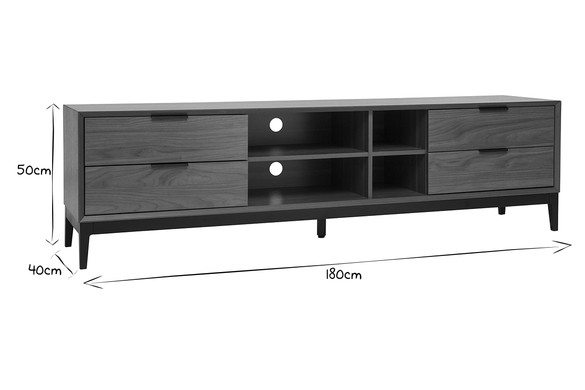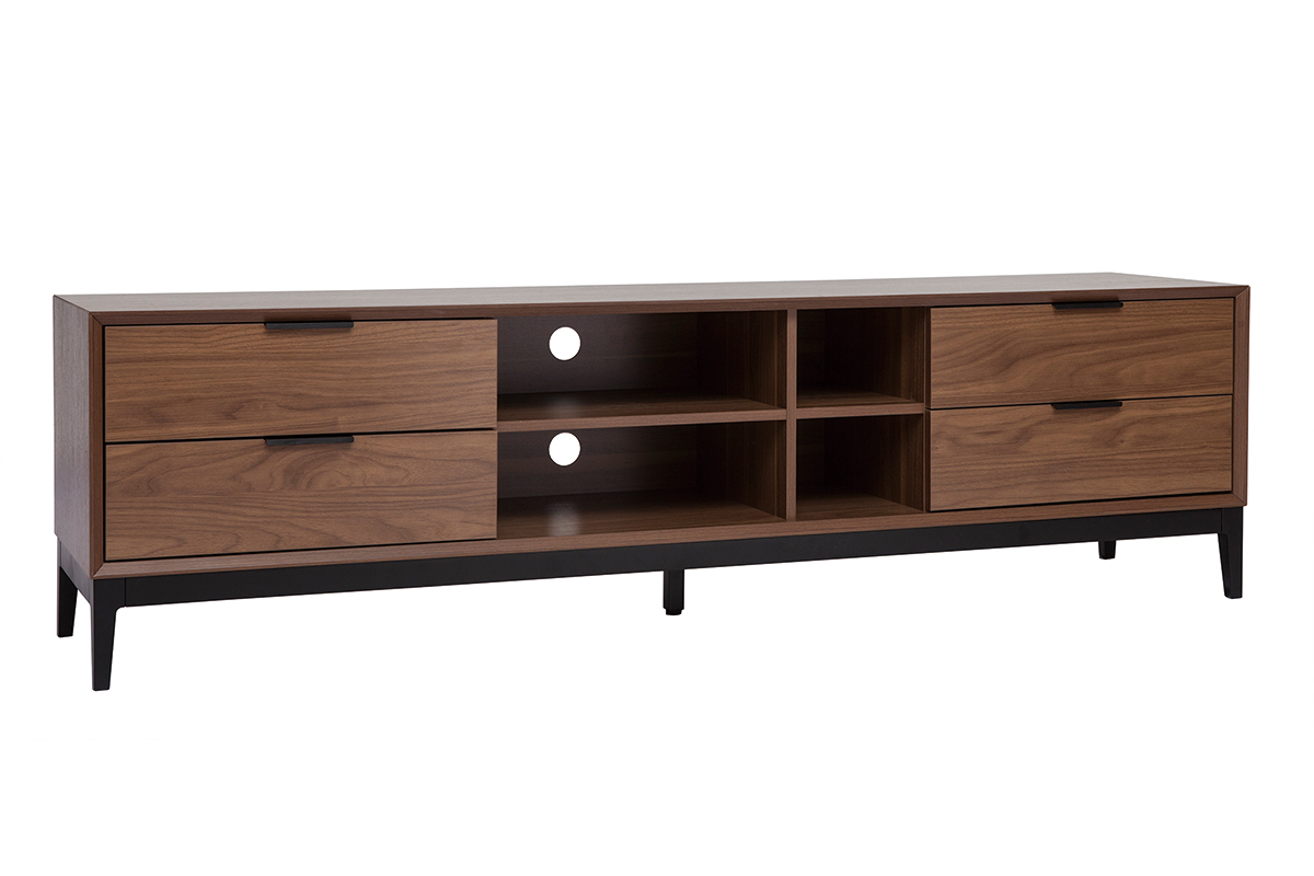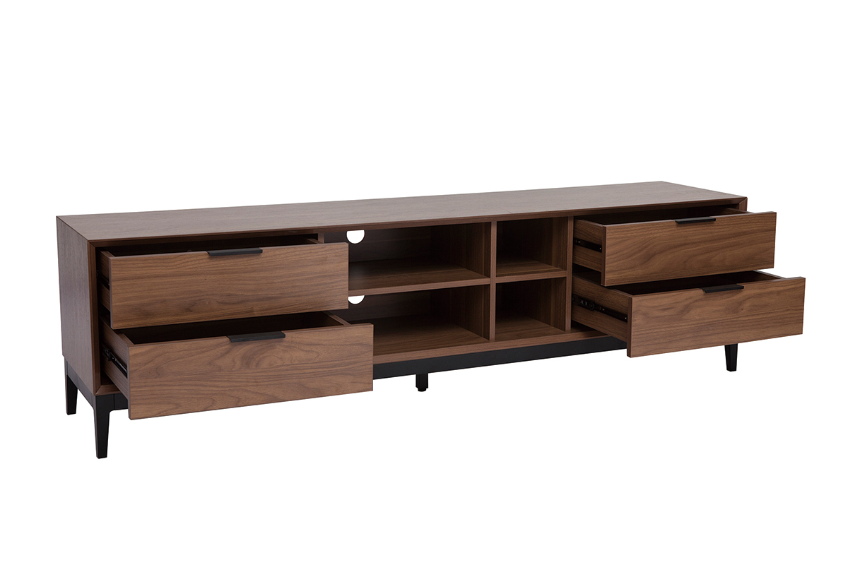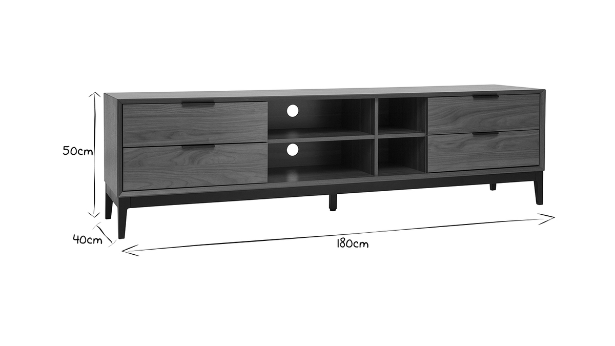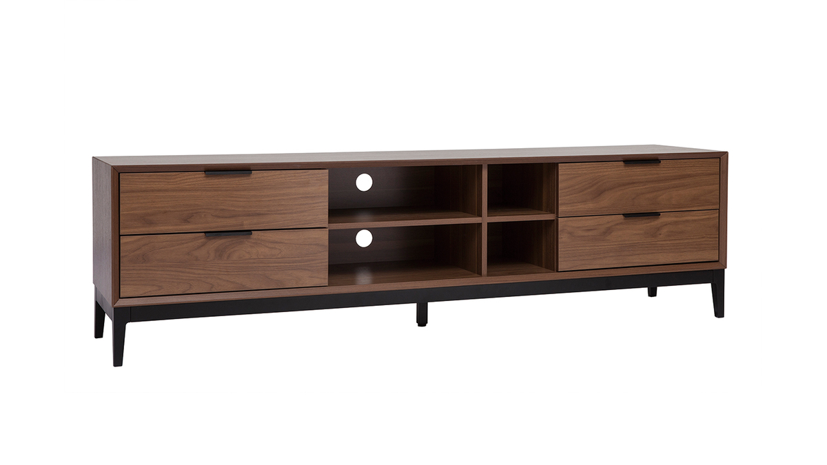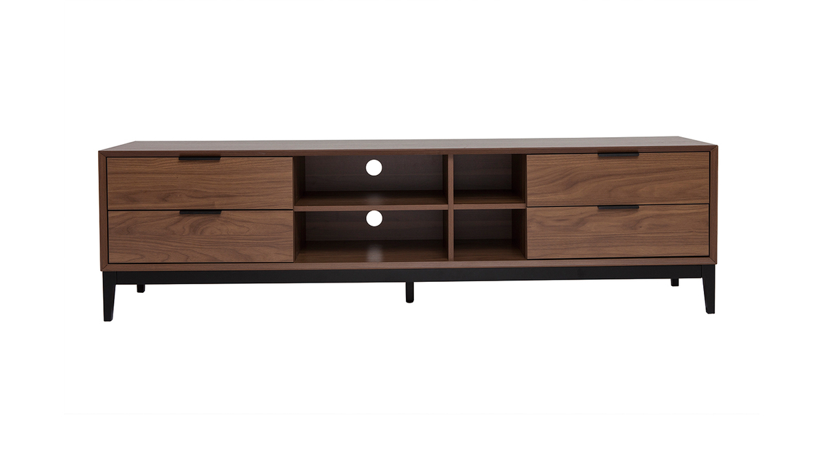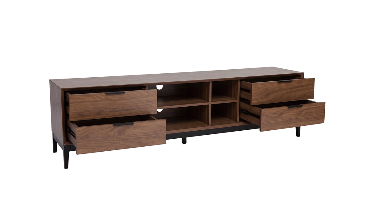 À la belle capacité de rangement, ce meuble TV qui oscille entre univers rétro et sphère contemporaine se révélera ultra pratique au quotidien ! Ses 4 niches ouvertes s'accompagnent de 4 grands tiroirs pour encore plus de fonctionnalités. Box TV, console de jeux, mais aussi livres et accessoires high-tech trouveront forcément une place au sein de ce meuble TV avec rangements.