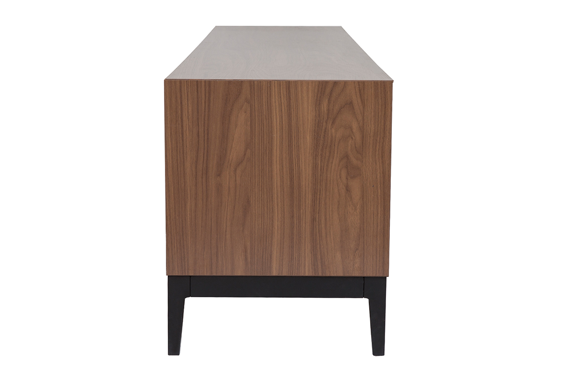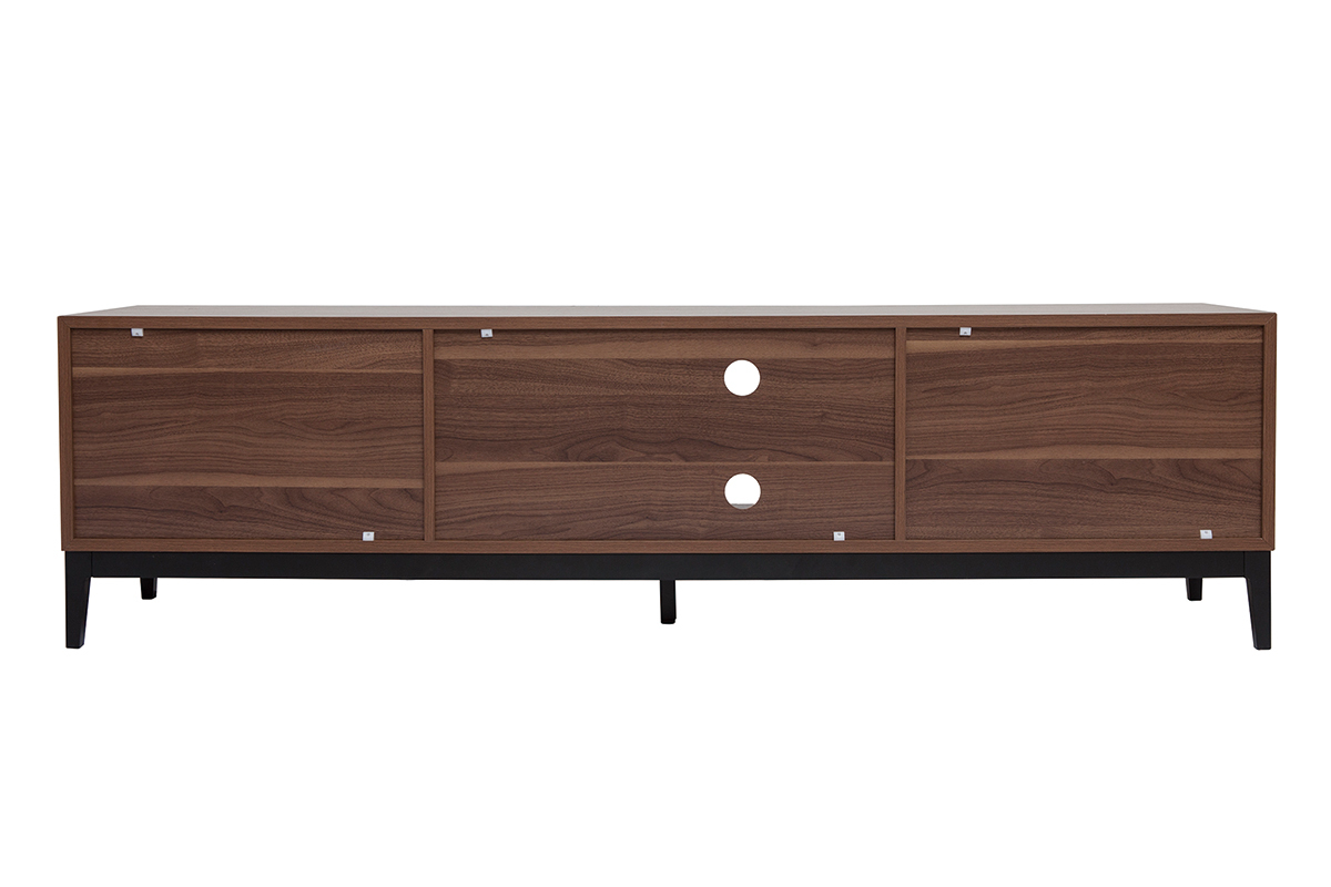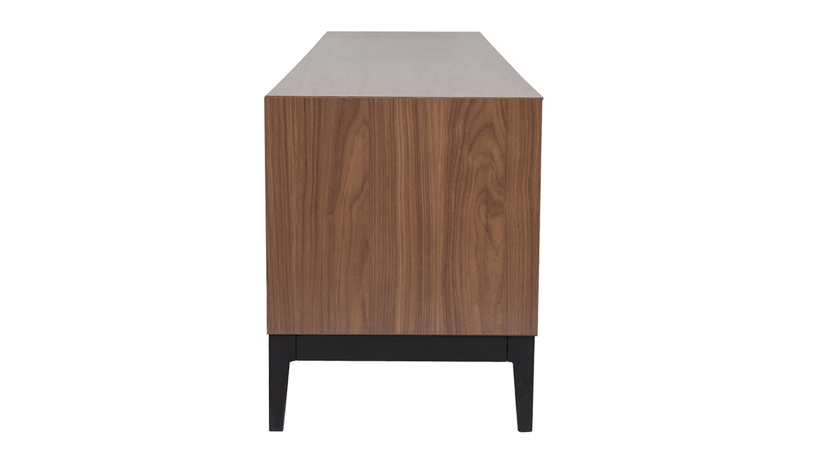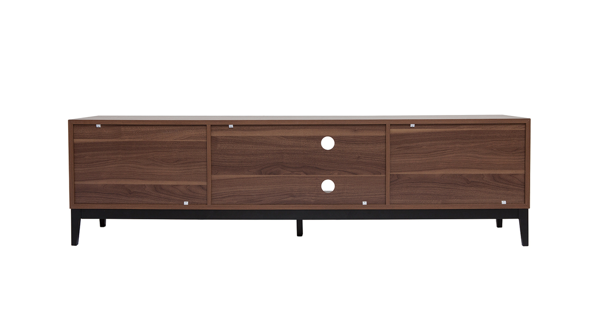 Élégante et profonde, mais également authentique et emblématique des 70's, sa couleur noyer nous comble par sa versatilité. Jolies nuances brunes et nervures apparentes donnent un caractère inimitable à ce meuble TV finition bois foncé qui allie parfaitement les influences d'hier à celles d'aujourd'hui.