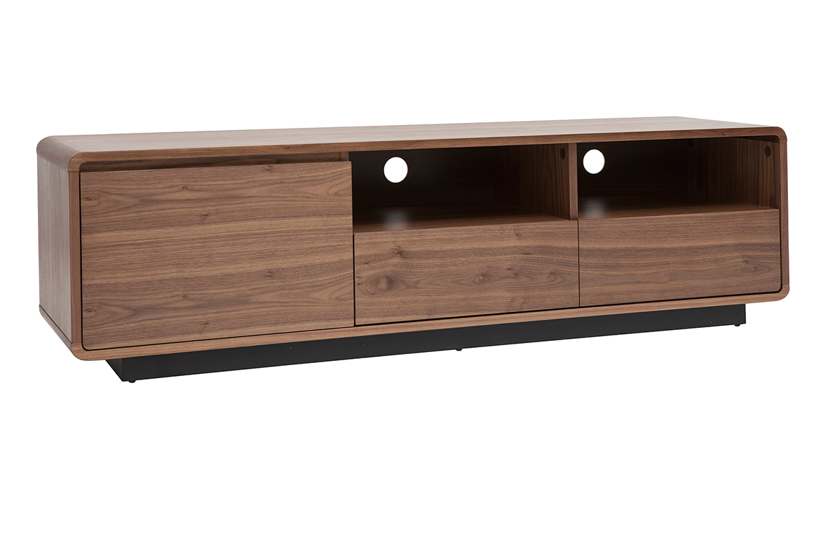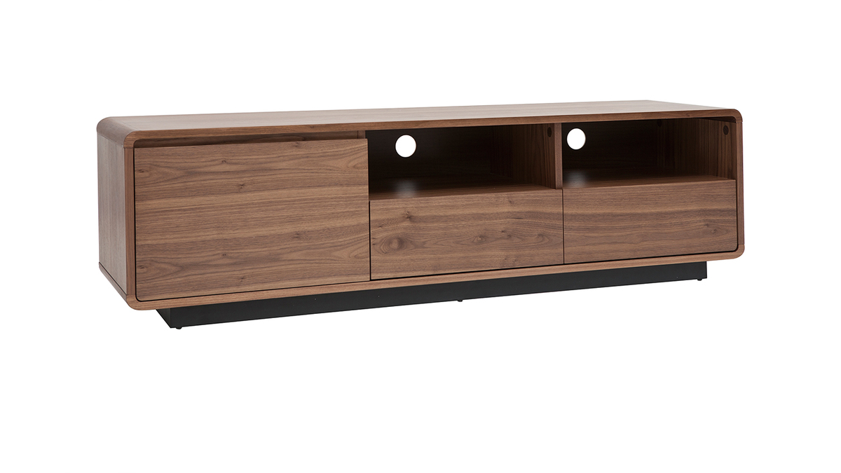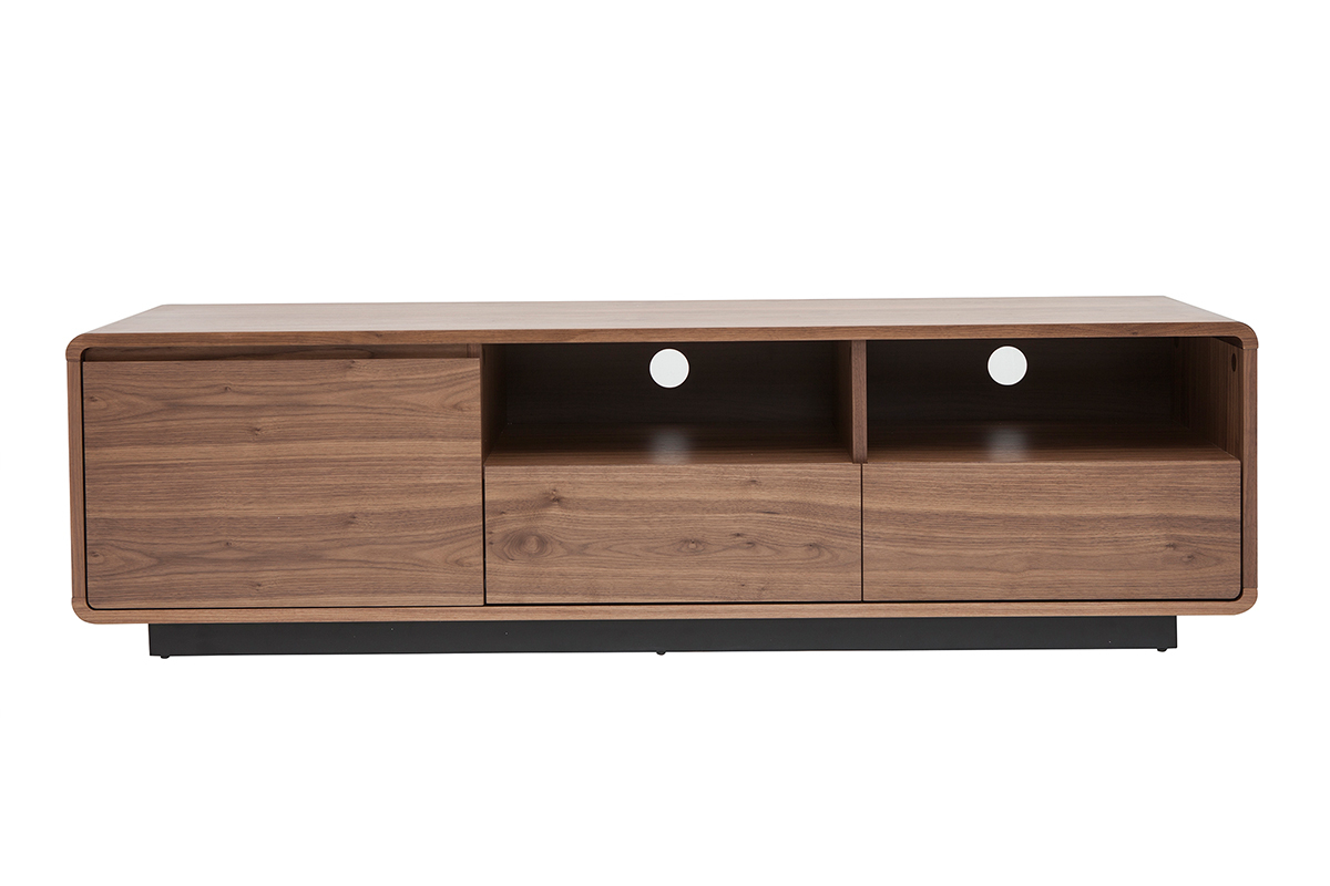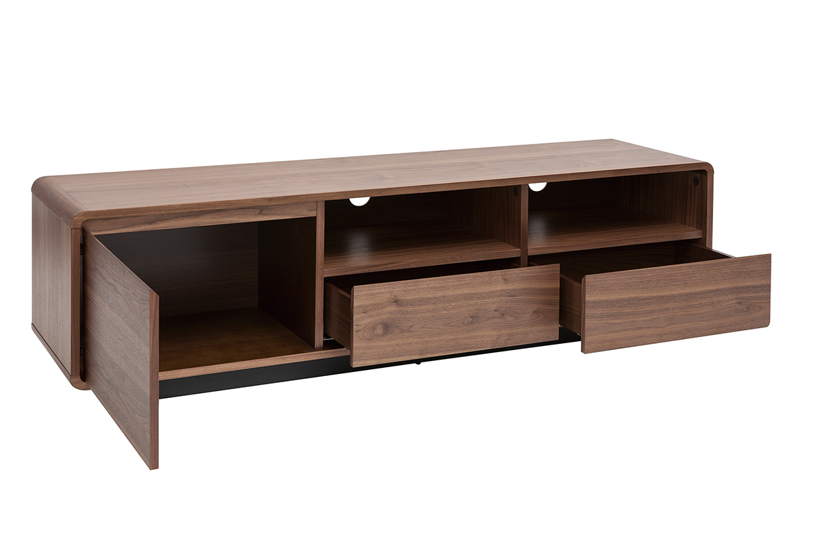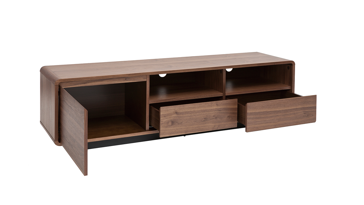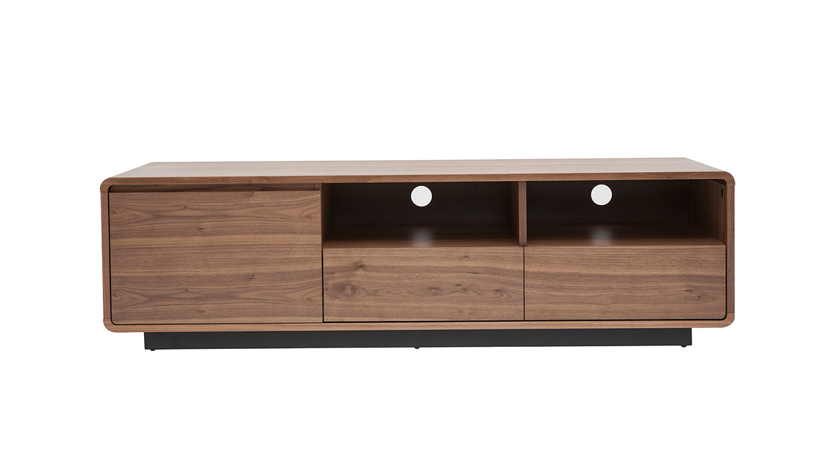 Fonctionnel et aux dimensions bien pensées (L160 x P42 x H45 cm), ce grand meuble TV en bois foncé noyer et métal noir mettra à disposition ses nombreux rangements sans encombrer l'espace ! Grâce à ses deux niches ouvertes, deux tiroirs et sa spacieuse niche fermée, vous ne manquerez pas de place pour vos objets connectés, accessoires hi-fi, magazines et petits objets du quotidien.
