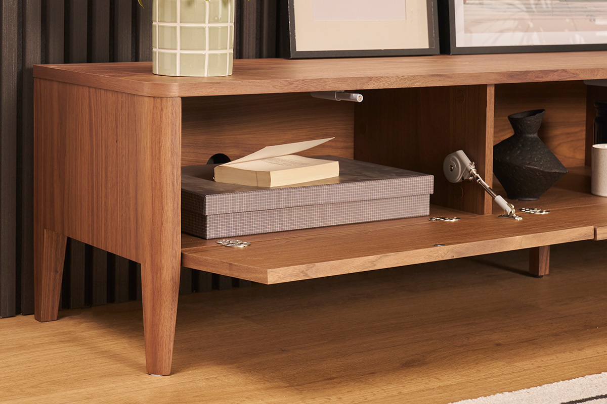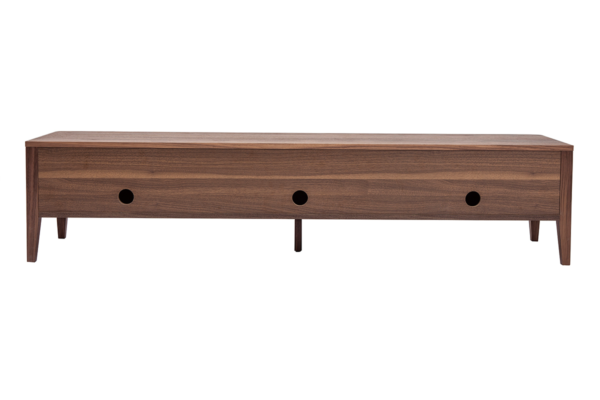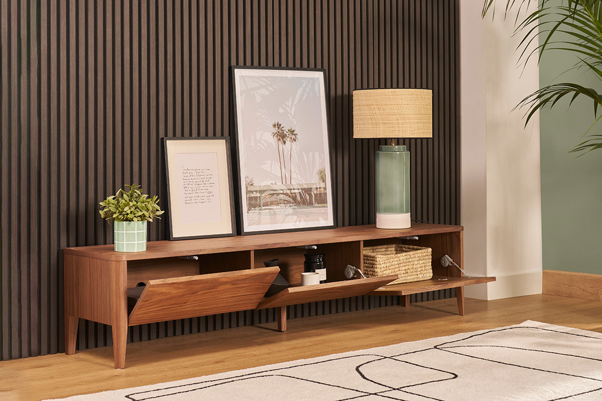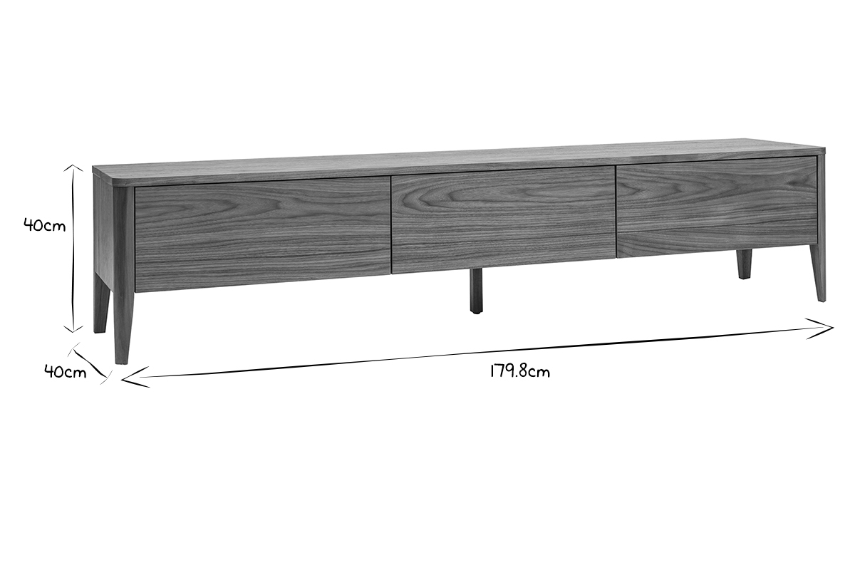 Des lignes bien pensées pour organiser votre coin télévision ! Campé sur 4 solides pieds, le caisson en panneaux de fibres de bois placage noyer vous permettra d'accueillir un grand téléviseur ou soulignera de toute sa longueur (L180 cm) un écran plat fixé au mur. Les 3 grandes niches (L55.6 x P36 x H21.3 cm) fermées sont toutes équipées de passe-câbles : rangez ainsi vos appareils numériques, box, consoles de jeux... En toute discrétion ! Dépourvu de poignées pour un look des plus épurés, accédez facilement aux différents espaces de rangement grâce à une légère pression sur les portes abattantes équipées d'un système d'ouverture et fermeture à charnières « push-pull ». De faible profondeur (P40 cm) le meuble TV BENJA habillera votre pièce de vie sans pour autant encombrer l'espace.