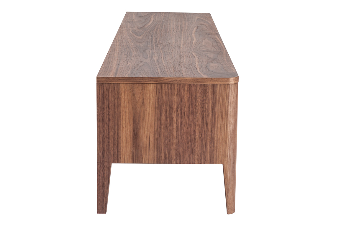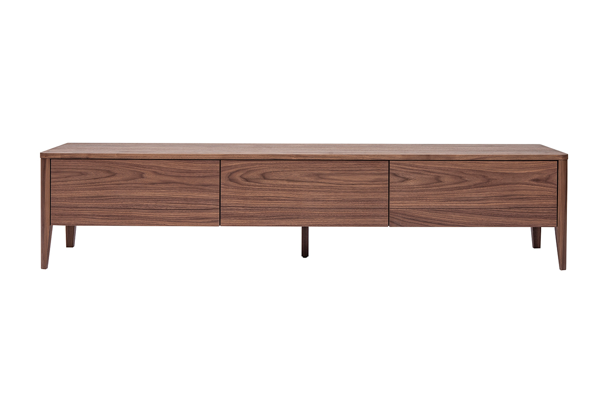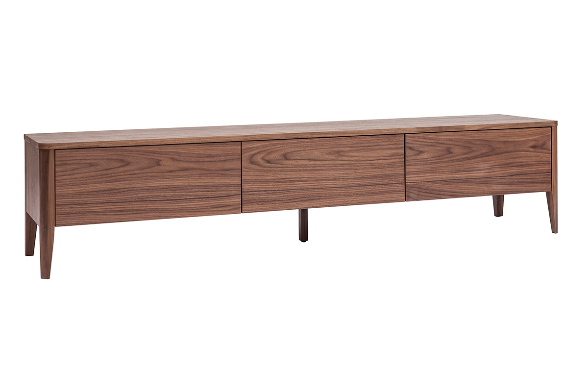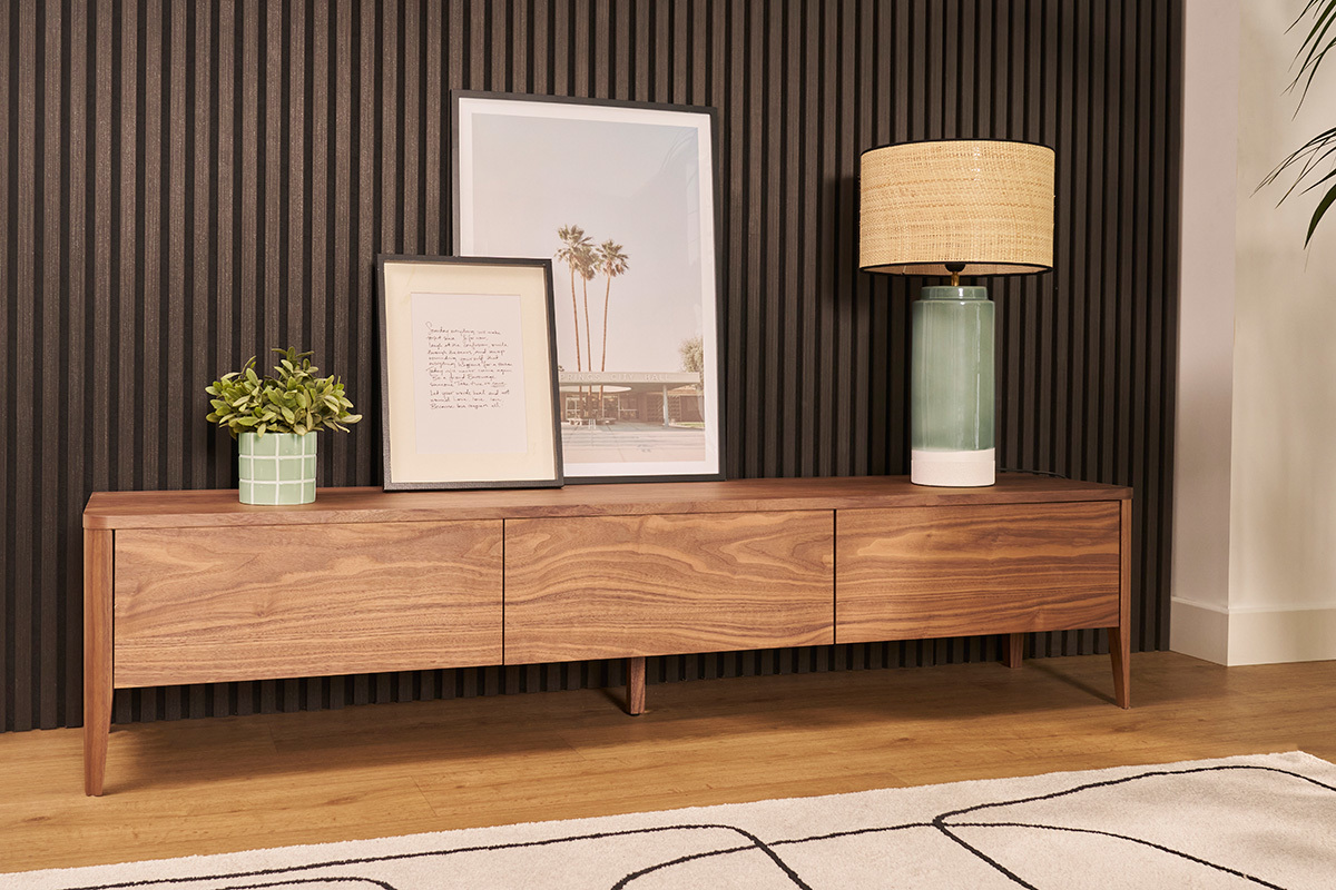 Des lignes bien pensées pour organiser votre coin télévision ! Campé sur 4 solides pieds, le caisson en panneaux de fibres de bois placage noyer vous permettra d'accueillir un grand téléviseur ou soulignera de toute sa longueur (L180 cm) un écran plat fixé au mur. Les 3 grandes niches (L55.6 x P36 x H21.3 cm) fermées sont toutes équipées de passe-câbles : rangez ainsi vos appareils numériques, box, consoles de jeux... En toute discrétion ! Dépourvu de poignées pour un look des plus épurés, accédez facilement aux différents espaces de rangement grâce à une légère pression sur les portes abattantes équipées d'un système d'ouverture et fermeture à charnières « push-pull ». De faible profondeur (P40 cm) le meuble TV BENJA habillera votre pièce de vie sans pour autant encombrer l'espace.