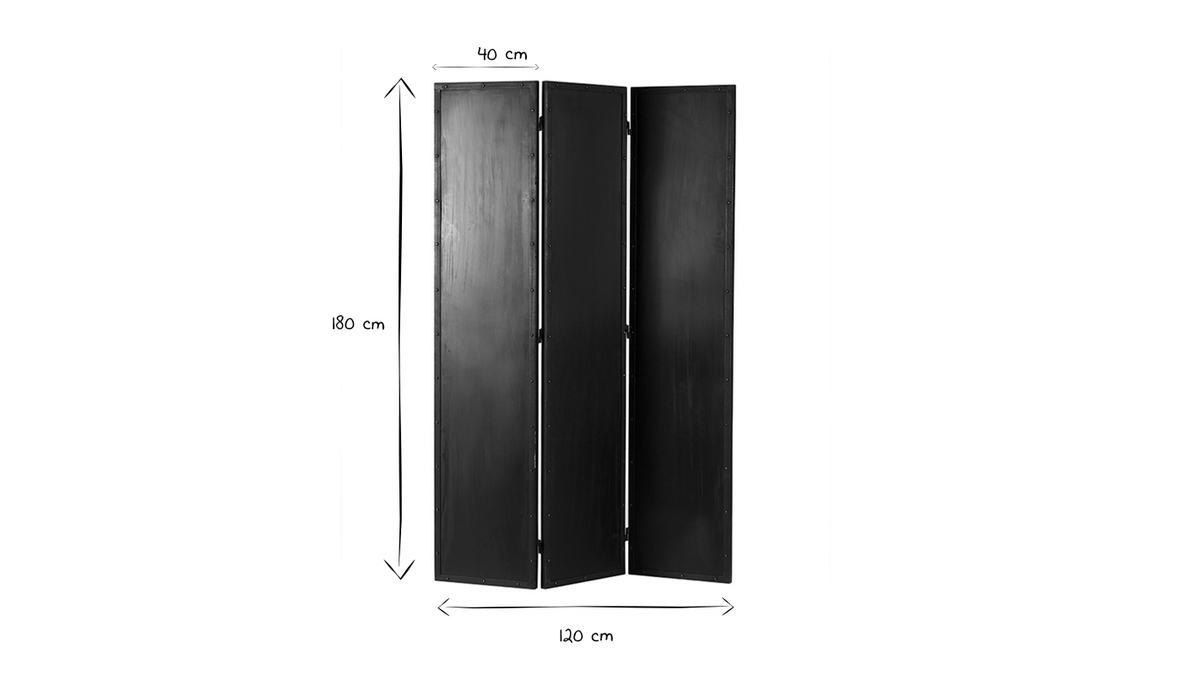 Voilà de quoi apportera de la présence dans votre pièce, une façon habile de sublimer une déco factory et répondre à un besoin de cloisonner. Créer un coin bureau dans la chambre ou un espace nuit dans le salon n'aura jamais été aussi simple ! Ce petit paravent en métal noir composé de 3 vantaux se déplie à l'envi et en un tournemain pour vous offrir une belle cloison modulable aux dimensions maximales L120 x P1.2 x H180 cm.