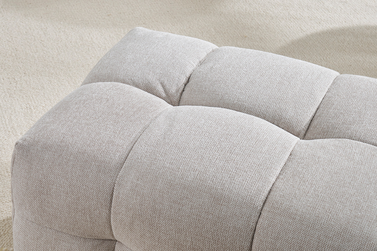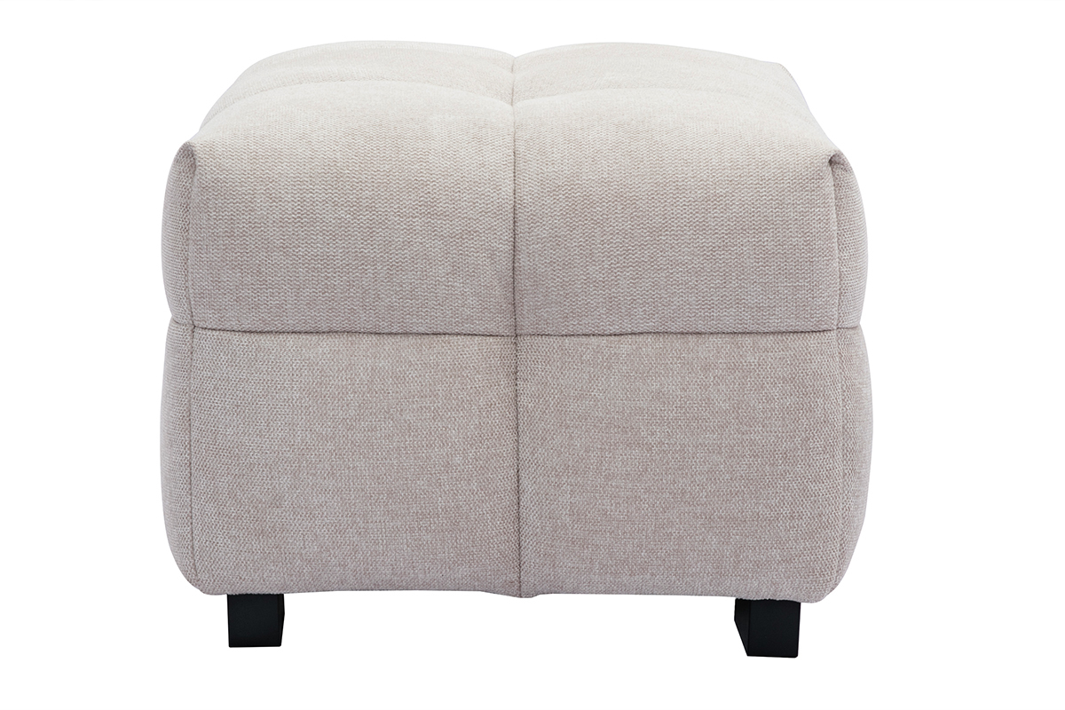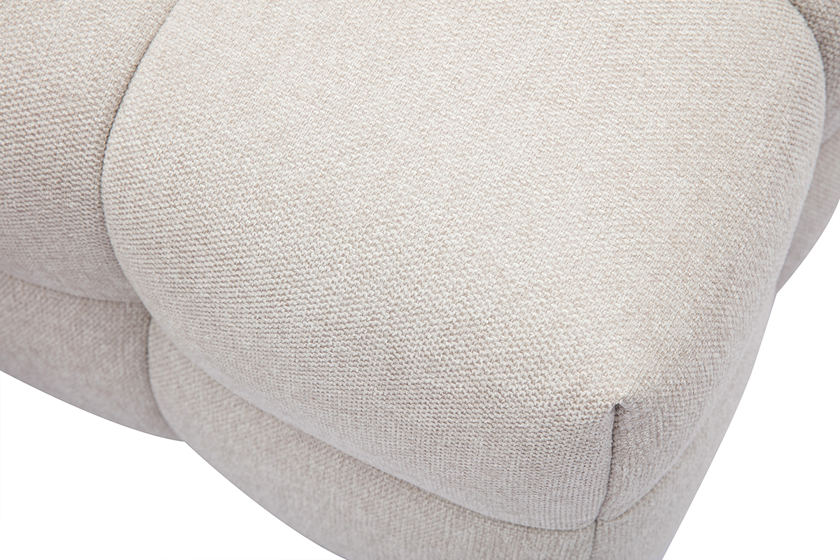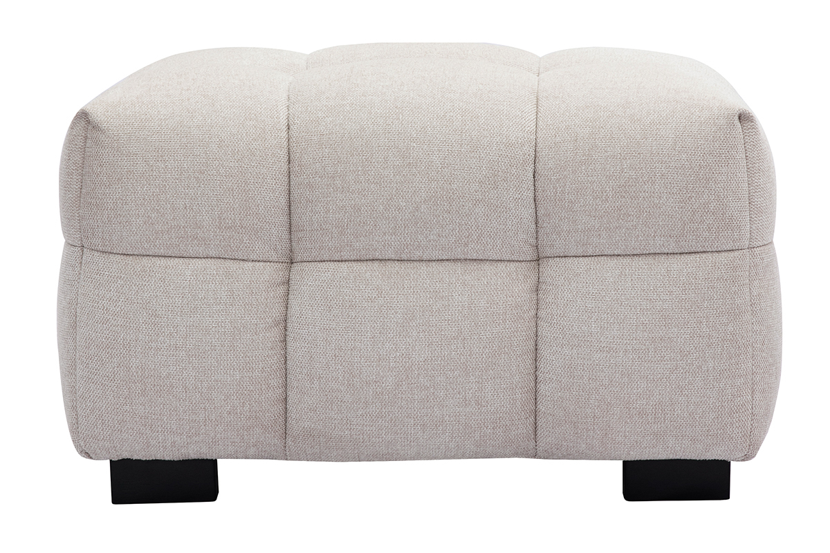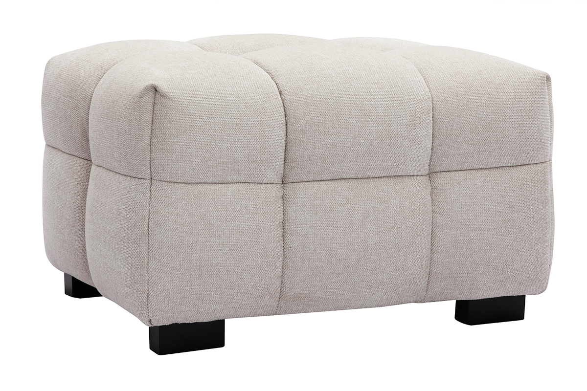 Pouf repose-pieds design en tissu effet velours texturé beige CORTO livré prêt à assembler. Montage simple, seuls les pieds sont à fixer.