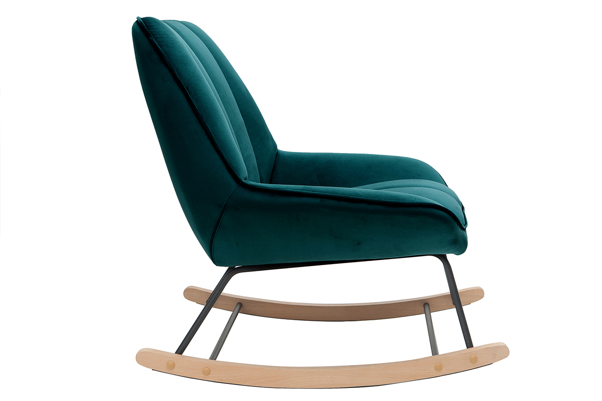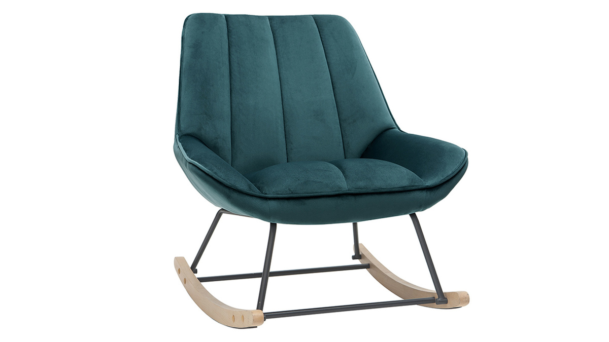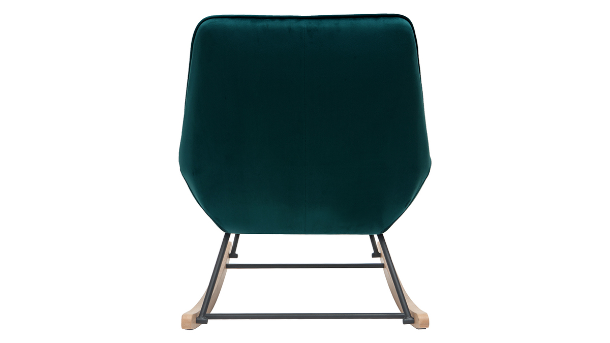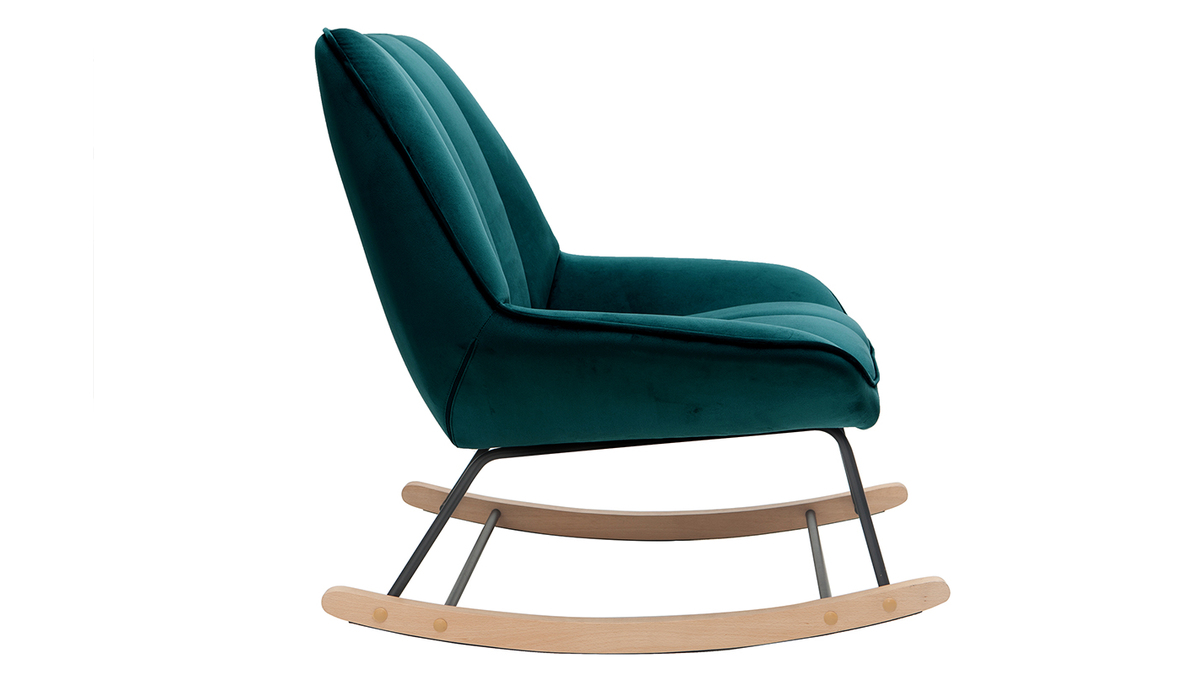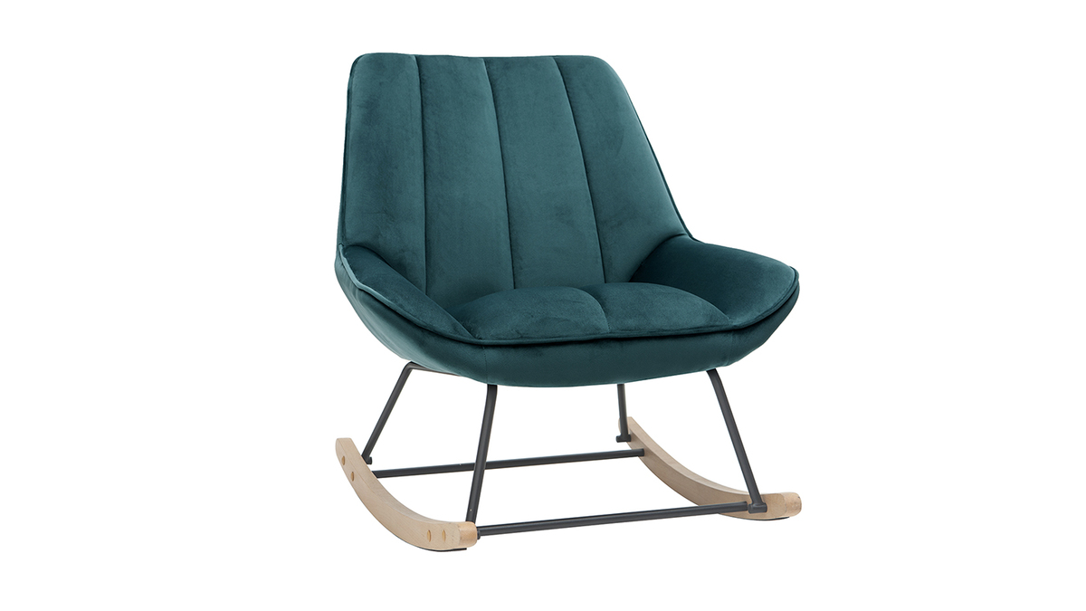 Rocking chair design en tissu velours bleu pétrole, métal noir et bois clair BILLIE livré prêt à assembler.