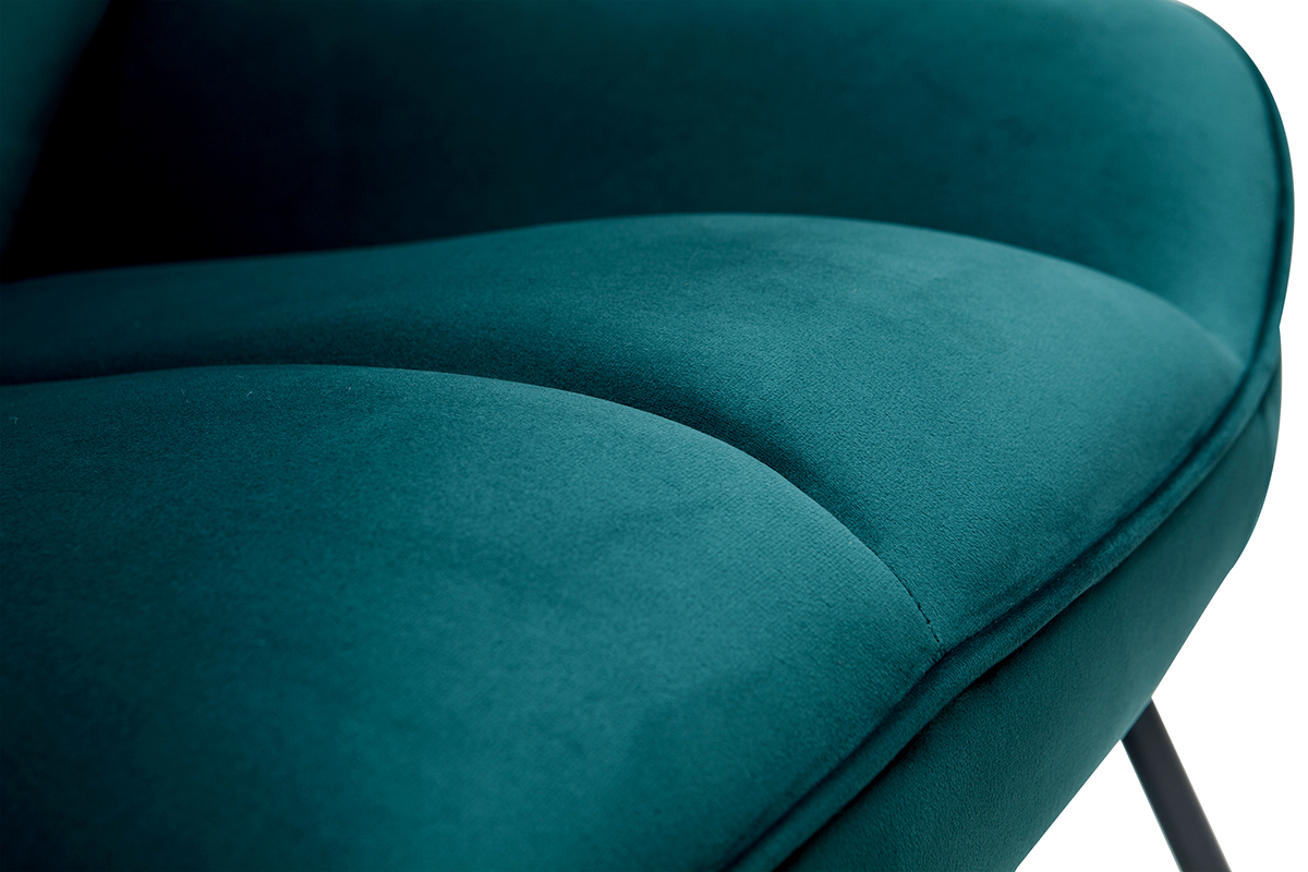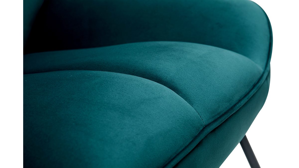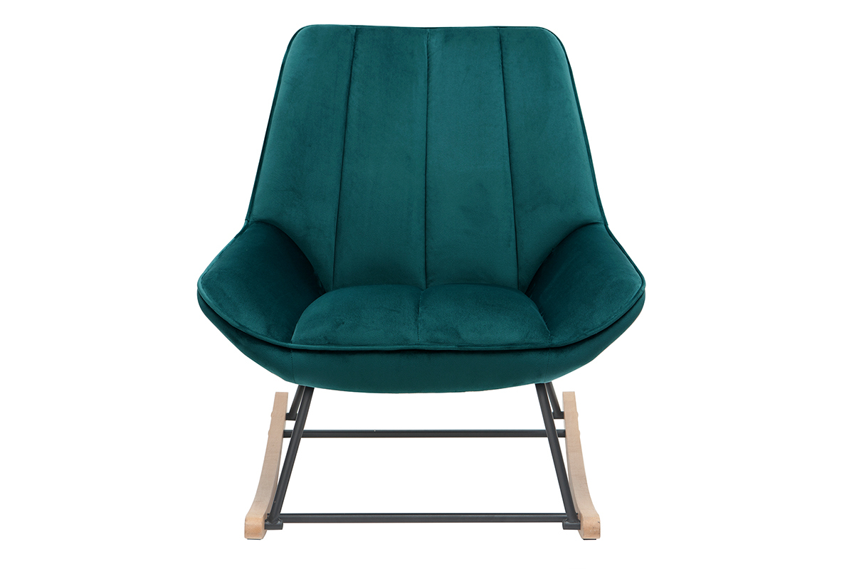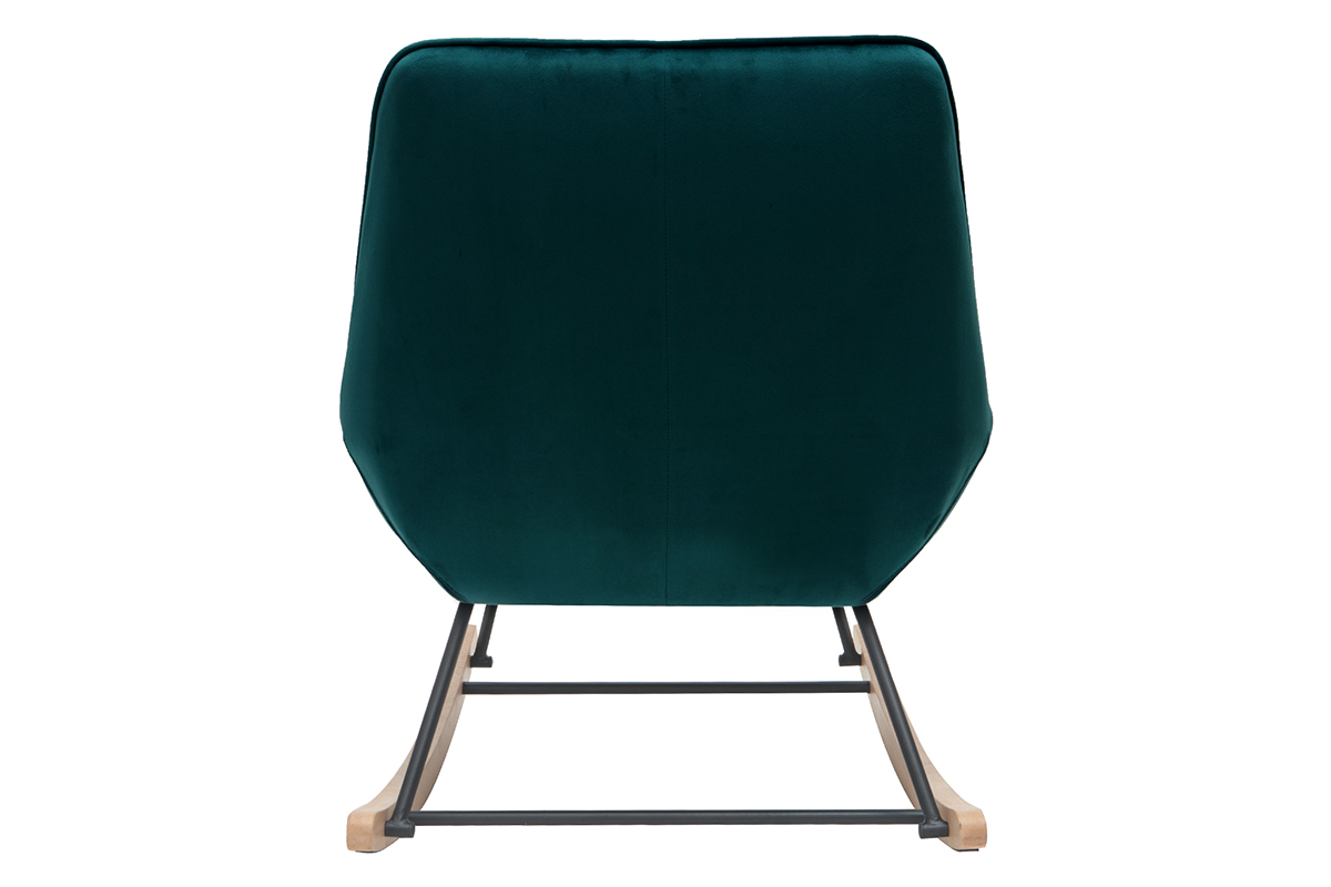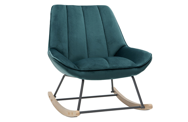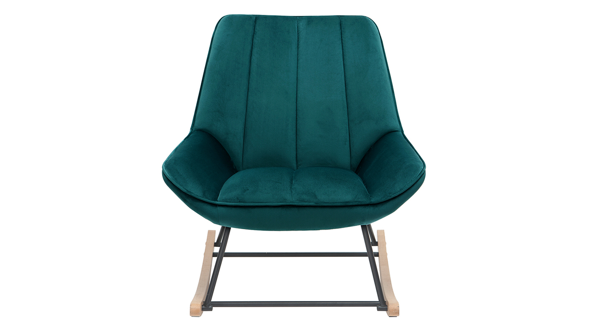 Rocking chair design en tissu velours bleu pétrole, métal noir et bois clair BILLIE livré prêt à assembler.