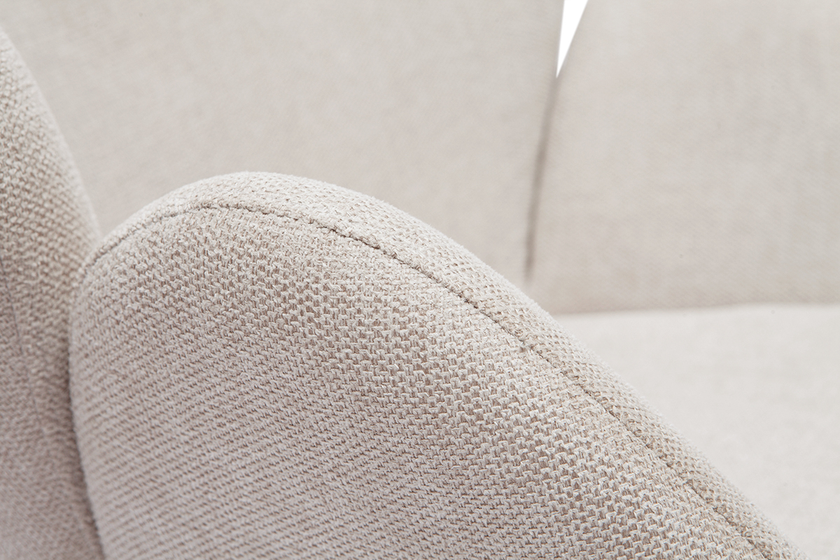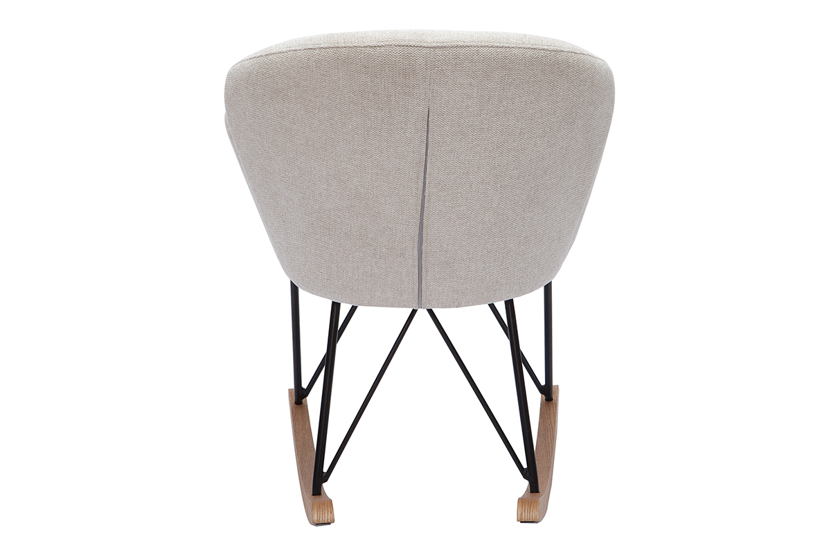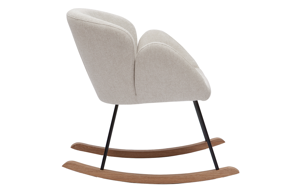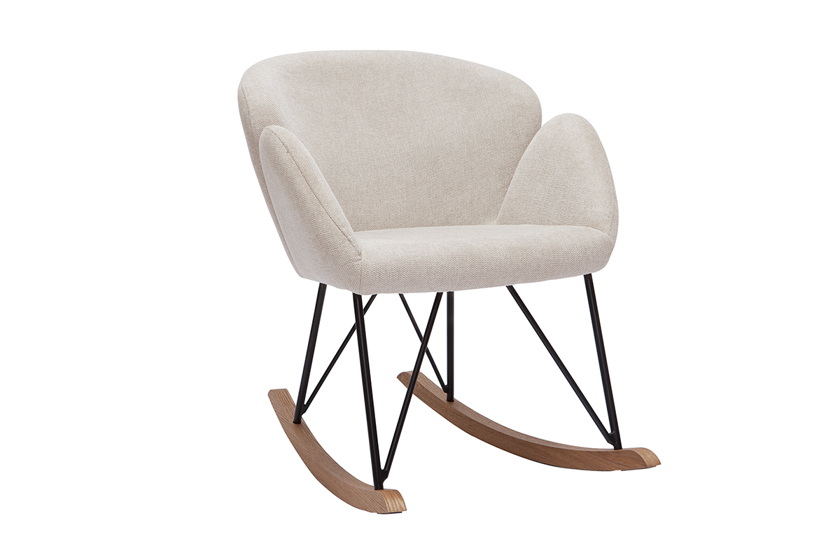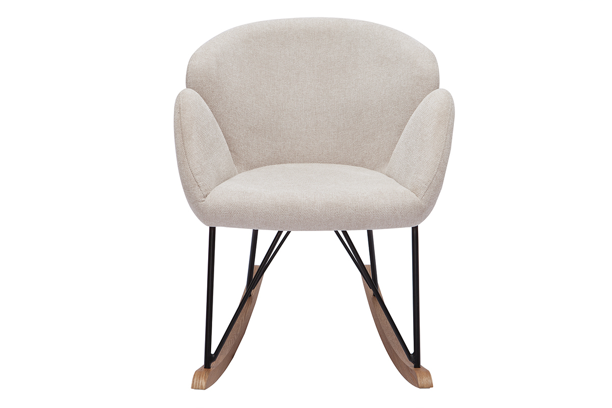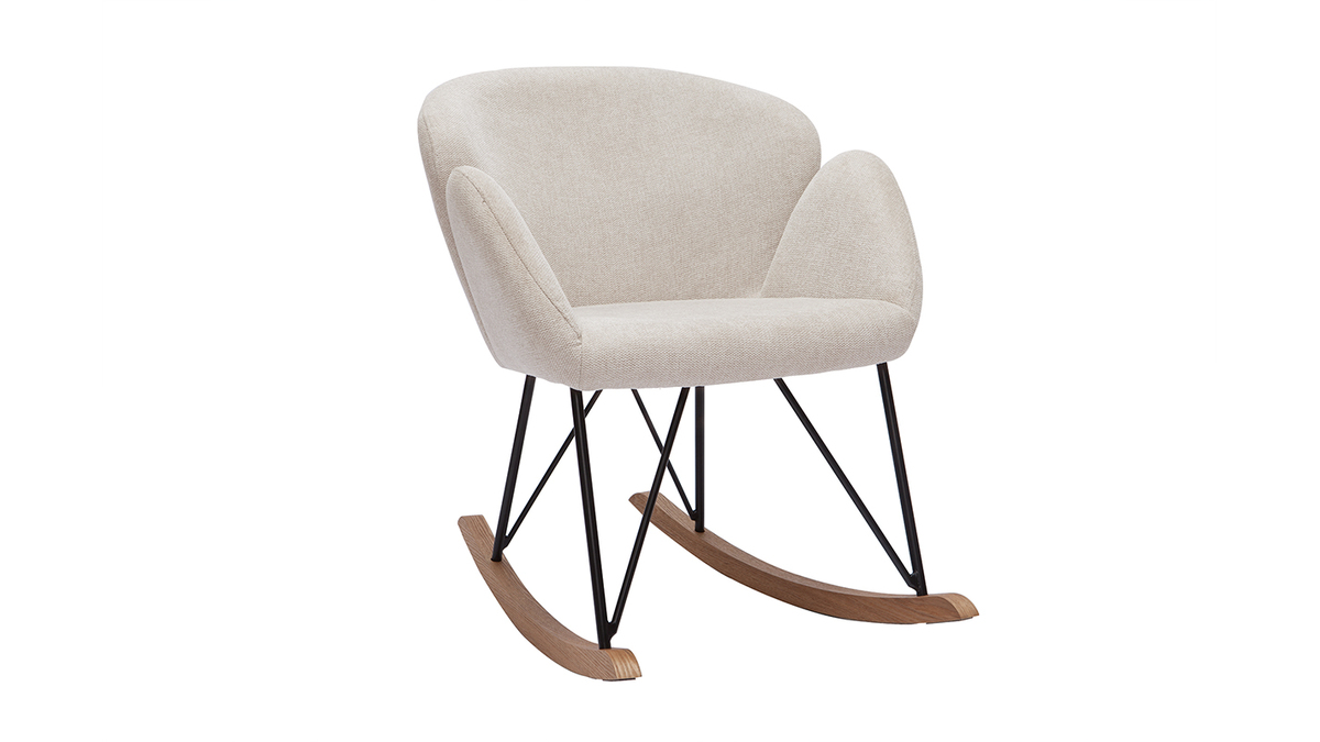 Son revêtement en polyester texturé effet velours beige confère à ce rocking chair RHAPSODY une élégance qu'on adore, tout à fait dans l'air du temps. Son piètement constitué de bois et de métal en fait un fauteuil à mi-chemin entre un esprit nordique et un style contemporain.