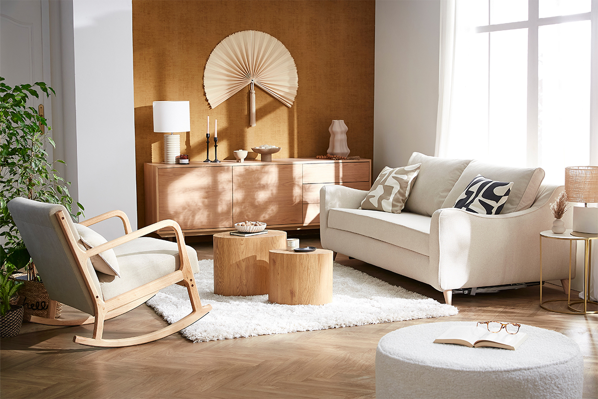 Envie d'une pièce de vie hyper cosy ? Une petite table d'appoint en bois massif viendra joliment mettre en valeur cette belle assise nordique.