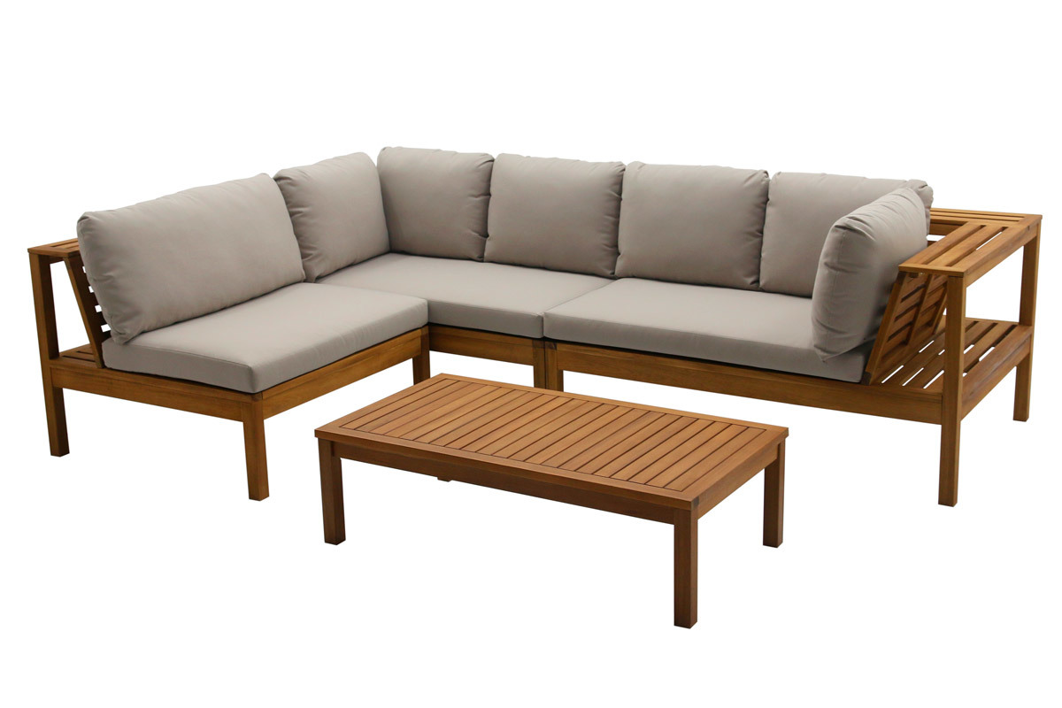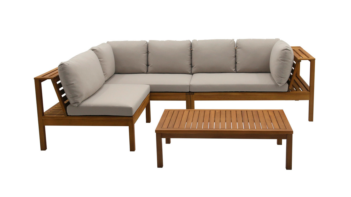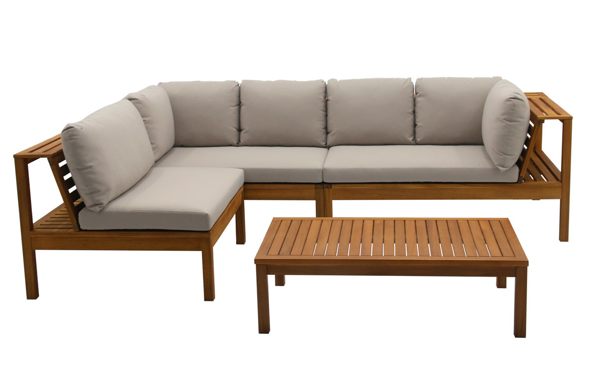 Le salon de jardin d'angle 6 places en bois massif avec coussins déhoussables taupe BELIZE est livré prêt à assembler.