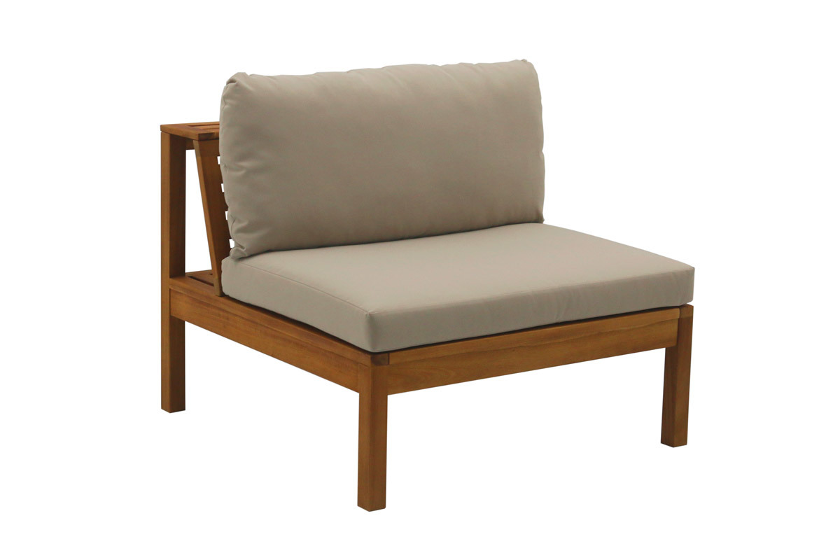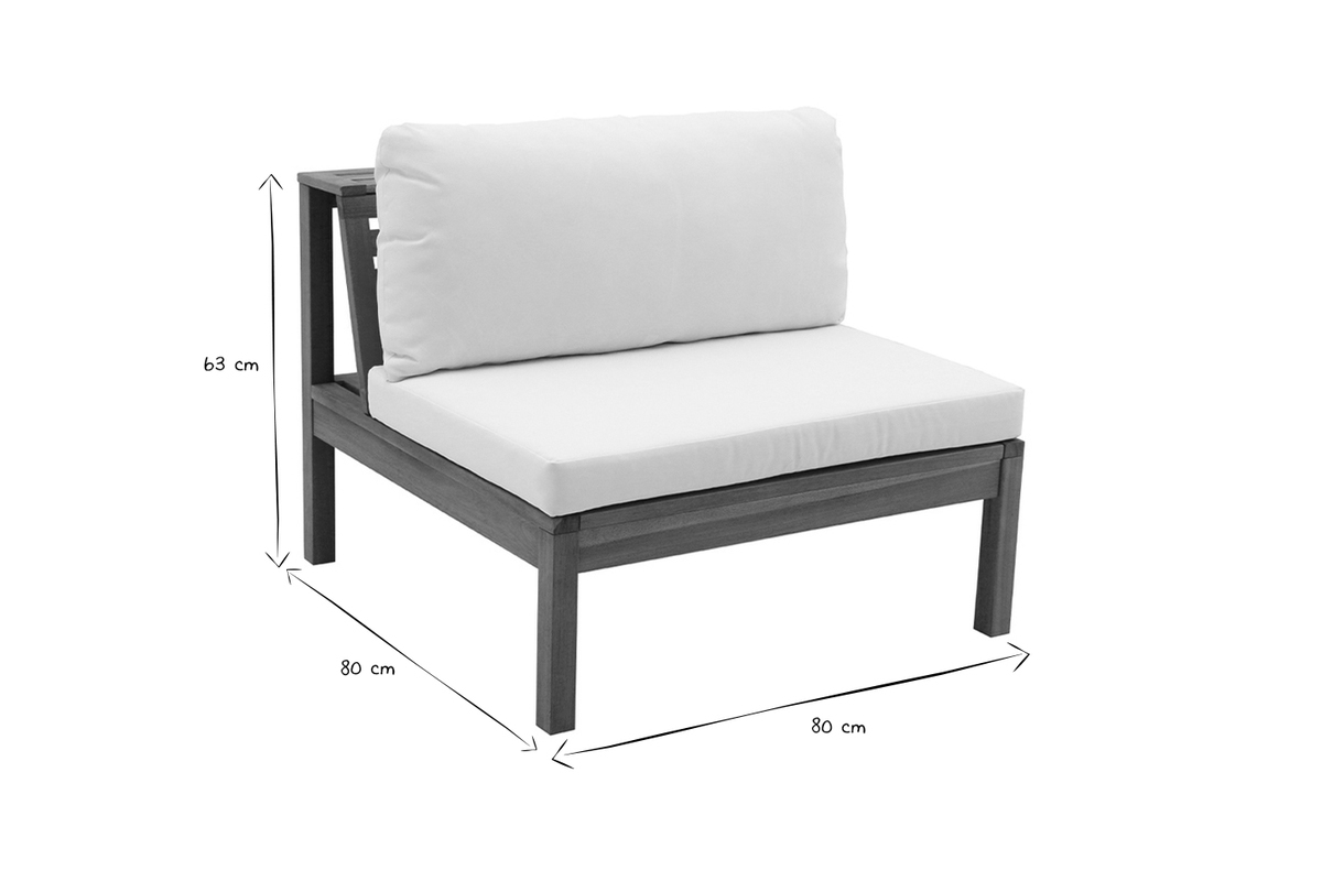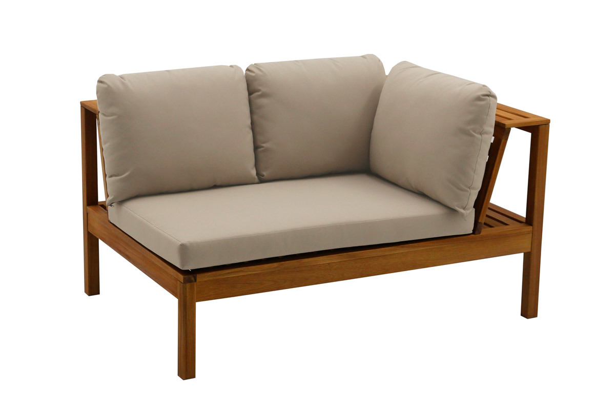 Vous pouvez les disposer selon vos envies. La chauffeuse peut s'insérer entre les modules d'angle afin de composer un canapé d'extérieur en U pouvant accueillir jusqu'à 6 personnes (longueur totale 240 cm). Elle peut aussi être disposée séparément ou collée à un module afin de créer un canapé de jardin d'angle droit ou gauche.