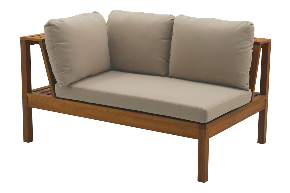 Le salon de jardin d'angle BELIZE se compose d'une structure en acacia massif et de jolis coussins d'assise (épaisseur 8 cm) qui invitent à se relaxer dans le plus grand confort. Il dispose aussi de coussins de dossier ultra moelleux garnis de flocons de polyester (épaisseur 15 cm). Ces coussins sont revêtus d'un tissu déperlant taupe (100% polyester) résistant aux UV et intempéries. Ils sont tous déhoussables afin de faciliter leur entretien.