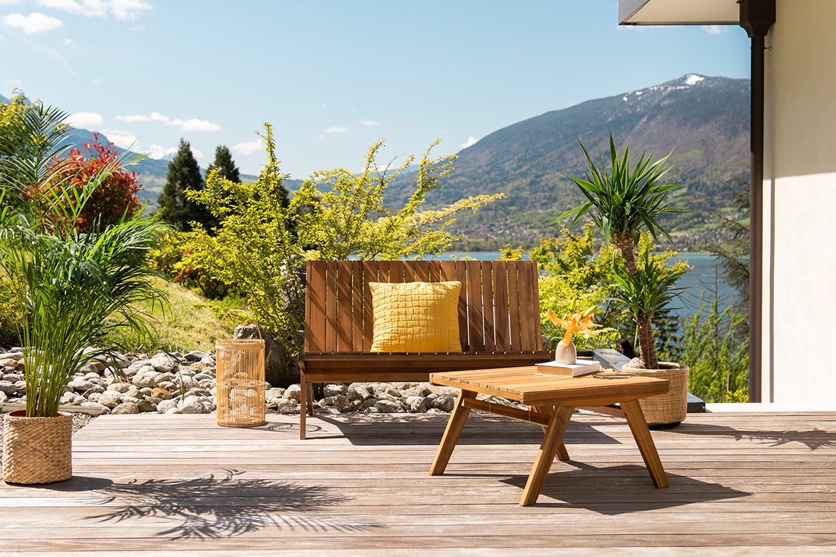 Banc de jardin et table basse d'extérieur en bois livrés prêts à monter.