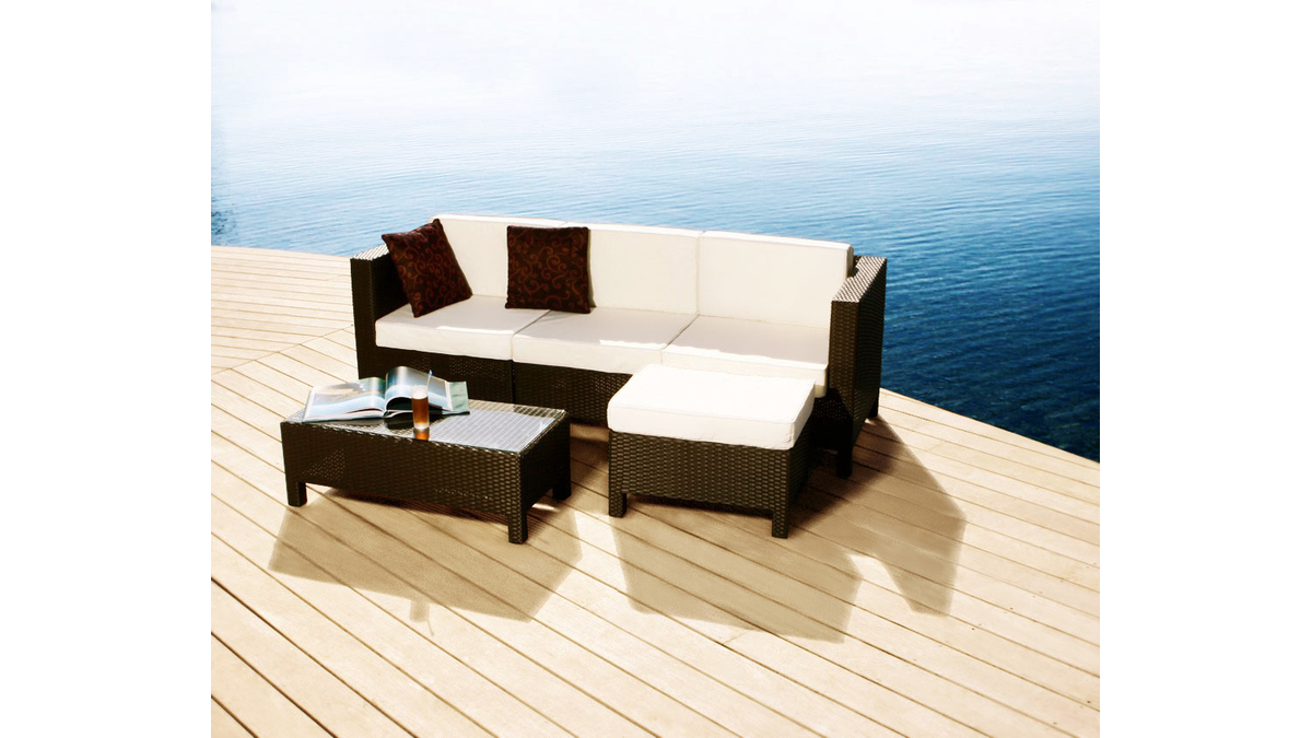 Cet ensemble de jardin peut également convenir en intérieur, dans une véranda par exemple. Entièrement modulable, vous pouvez organiser les éléments qui le composent pour créer un canapé 2 places, 1 fauteuil, 1 pouf et une table, ou même 3 fauteuils, un pouf et une table. Vous n'avez plus qu'à faire fonctionner votre imagination ! Les meubles de jardin de cet ensemble ainsi que les coussins sont imperméables, ils ne craignent pas les averses.Cet ensemble de jardin comprend : 2 fauteuils d'angle, un fauteuil central, un ottoman garnis de coussins de 5cm d'épaisseur et une table basse avec plateau en verre trempé de 5mm d'épaisseur.Dimensions des fauteuils d'angle de jardin : 75x75x69cm