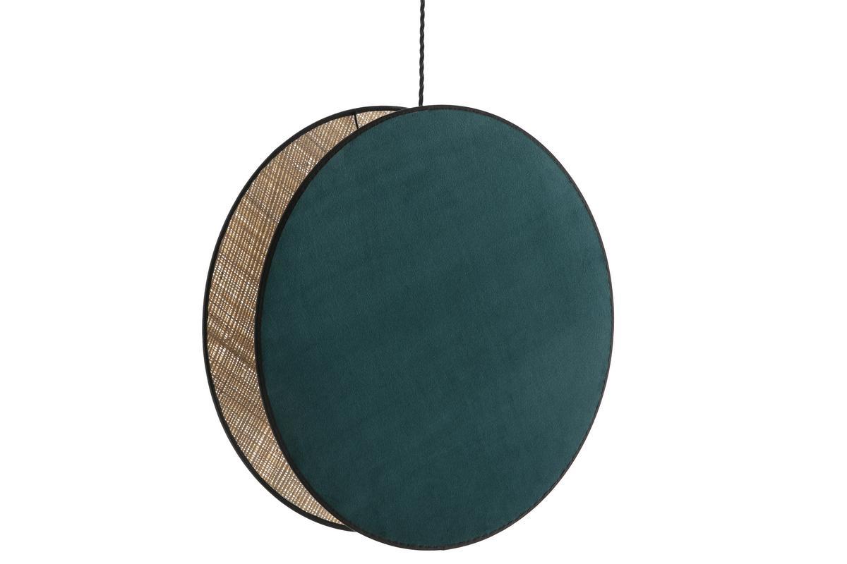 Cette sphère lumineuse légère et poétique danse librement sous l'effet des courants d'air nous laissant entrevoir sa double facette : d'un côté un élégant tissu velours bleu pétrole et de l'autre une jolie rabane naturelle. L'ensemble - délicatement souligné par le biais contrastant de couleur noire - offre une association de matières à la fois poétique et raffiné