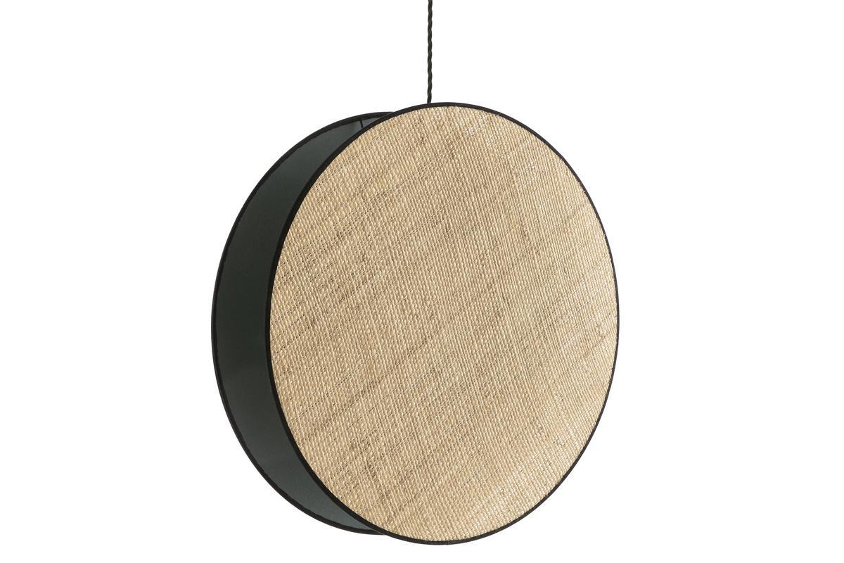 On aime le design unique de cette suspension fabriquée en France. Les deux cercles (D49 cm) qui encadrent la source lumineuse sont reliés ensemble par une fine structure en fil d'acier noir. Cette suspension bleu paon et rabane naturelle offre ainsi un éclairage délicat et chaleureux. La lumière filtrant à travers les matières change selon le point de vue de l'observateur. La source lumineuse se dévoile plus ou moins selon l'angle où l'on se place.