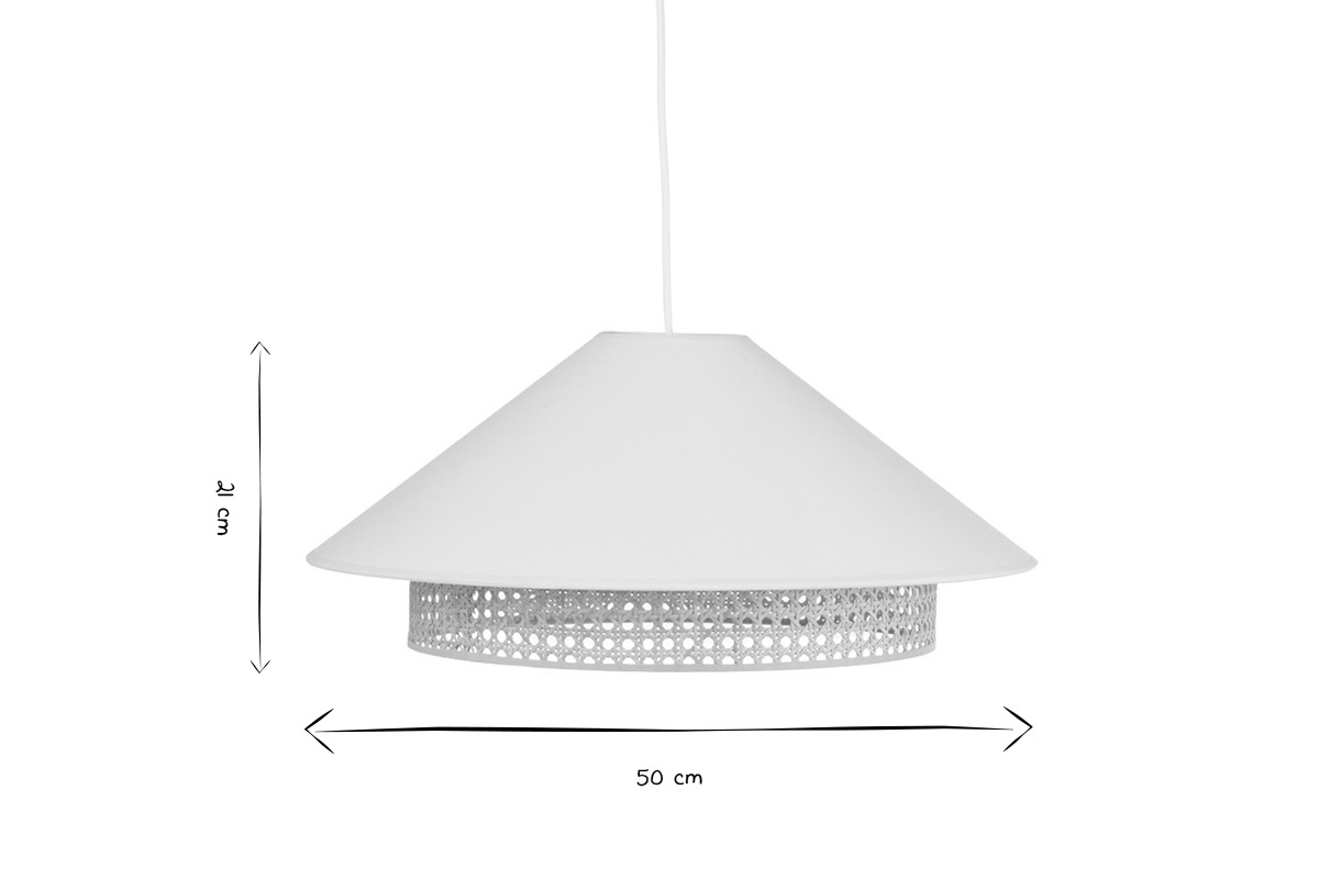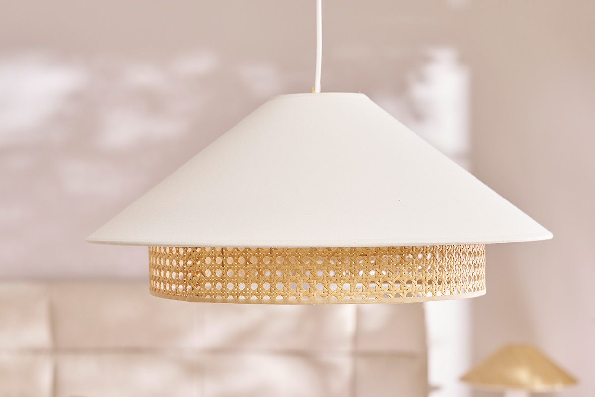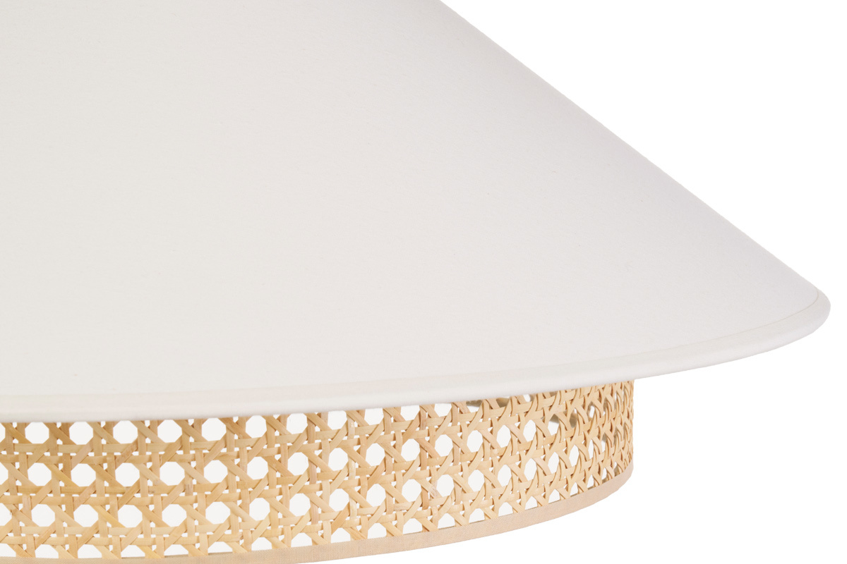 L’abat-jour conique (D50 cm) en coton écru apporte douceur et luminosité, tout en diffusant une lumière tamisée agréable. Associé à une bande délicate de cannage en rotin, il crée un contraste subtil entre l’aspect lisse du coton et le tressage aéré du rotin. Ce mélange de matières naturelles donne à la suspension HAIKO un charme authentique et une atmosphère apaisante, idéale pour une décoration d’inspiration scandinave, bohème chic ou même Japandi.