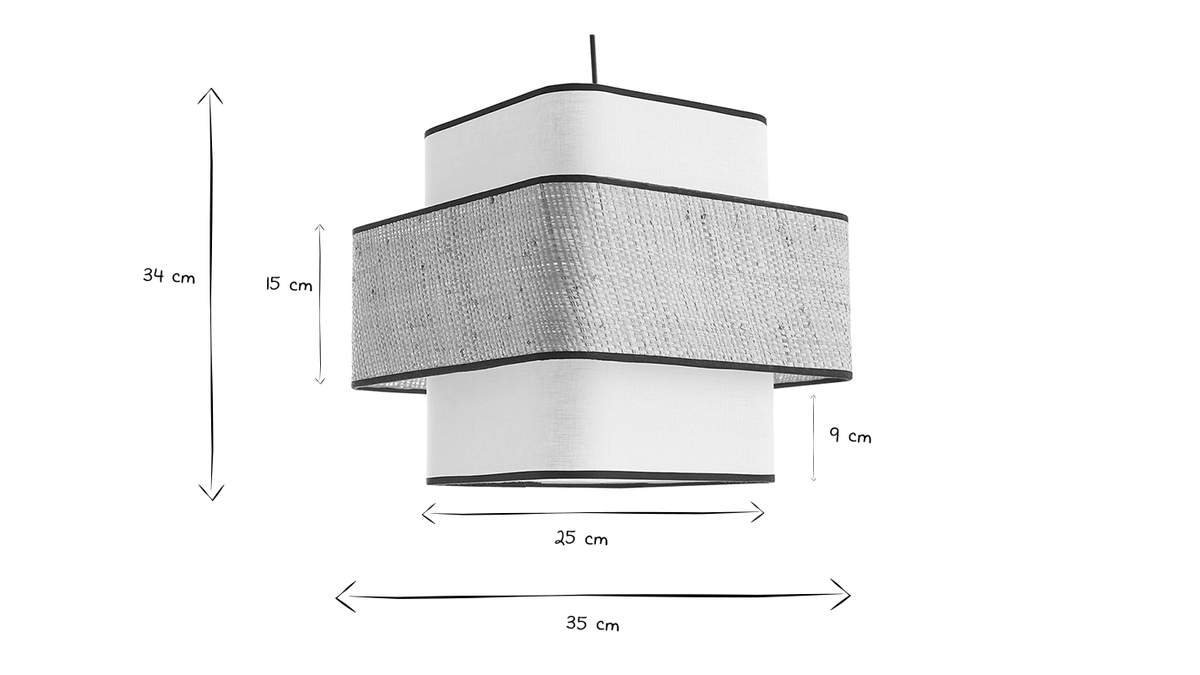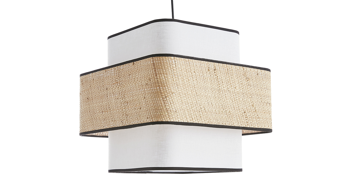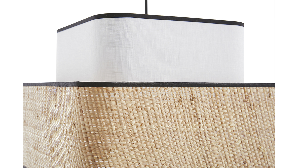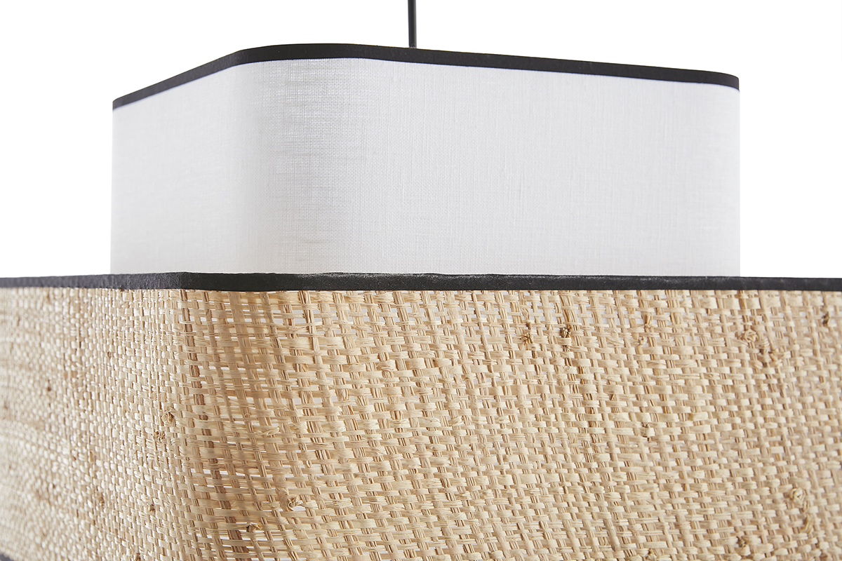 D'une étonnante simplicité, cette suspension design carrée ne manque pourtant pas d'allure pour attirer tous les regards. Avec son visuel doux et épuré cette suspension en fibres naturelles conjugue fonctionnalité et beauté. Superposition de cerclages cubiques en rabane et tissu lin blanc - contrastés par des biais en coton noir - la silhouette graphique de TERA mixe modernité par la forme et authenticité par la matière.