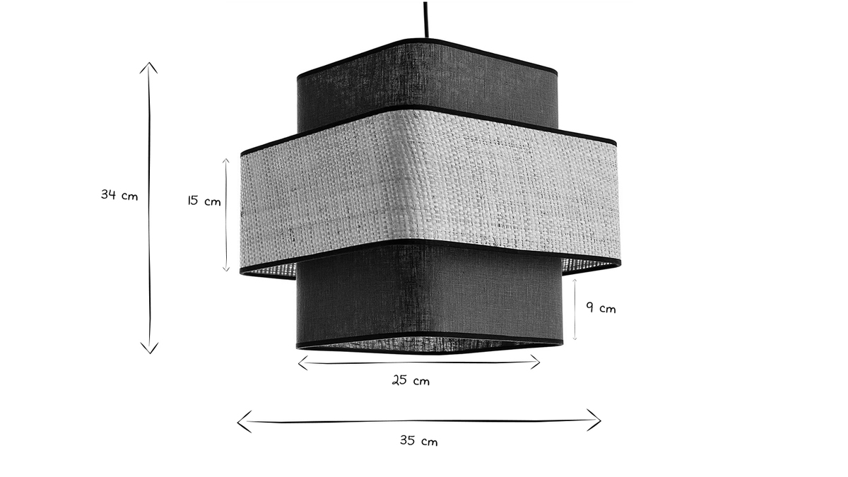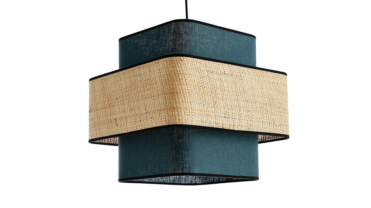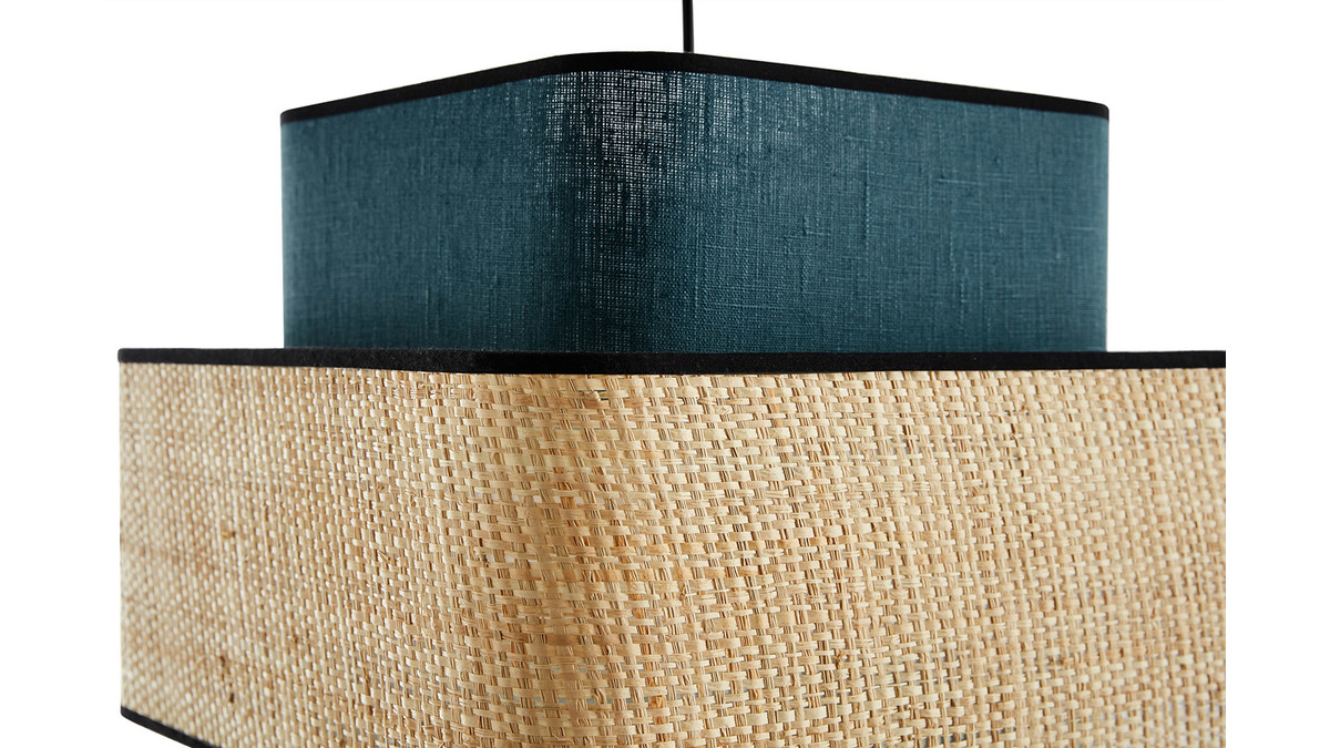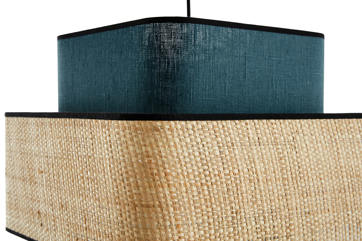 D'une étonnante simplicité, cette suspension design carrée ne manque pourtant pas d'allure pour attirer tous les regards. Avec son visuel doux et épuré cette suspension en fibres naturelles conjugue fonctionnalité et beauté. Superposition de cerclages cubiques en rabane et tissu lin bleu canard - contrastés par des biais en coton noir - la silhouette graphique de TERA mixe modernité par la forme et authenticité par la matière.